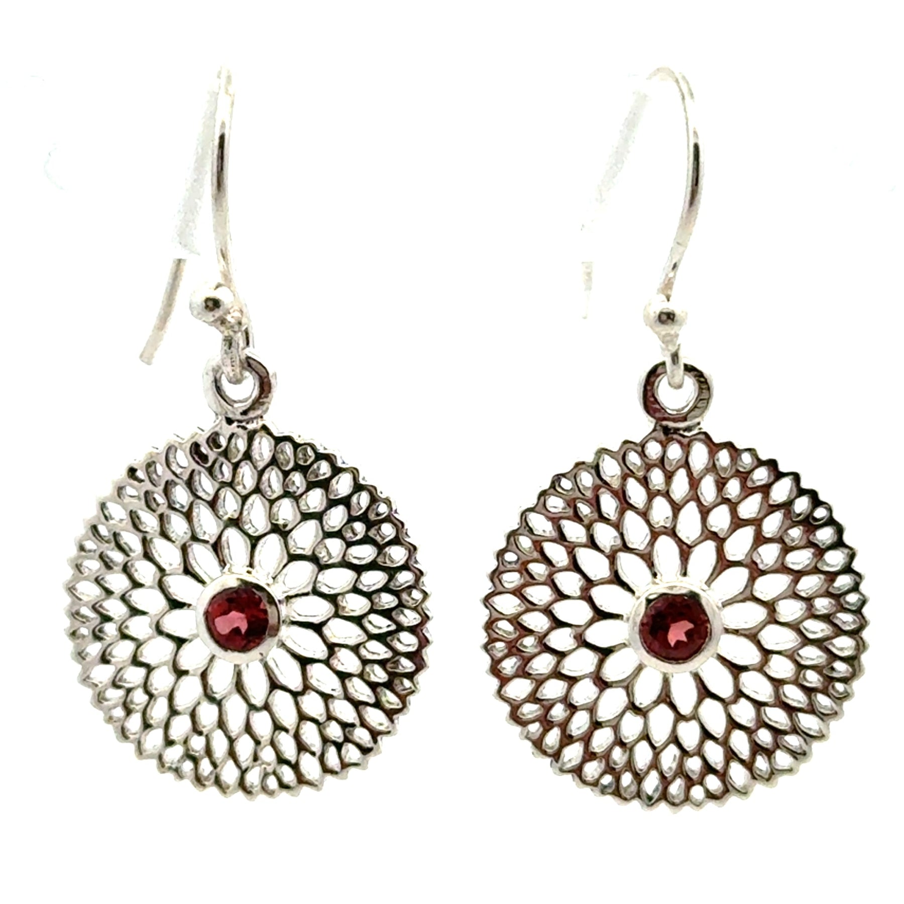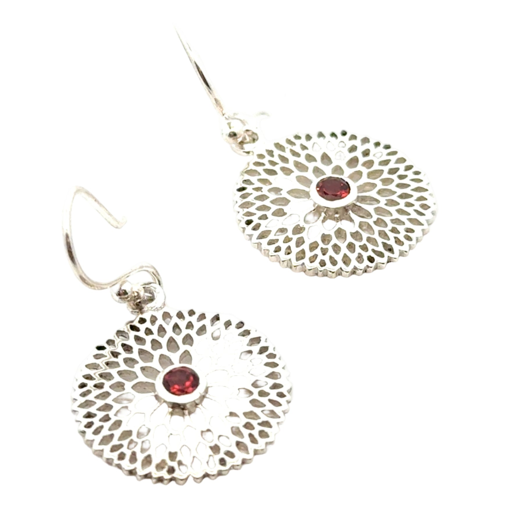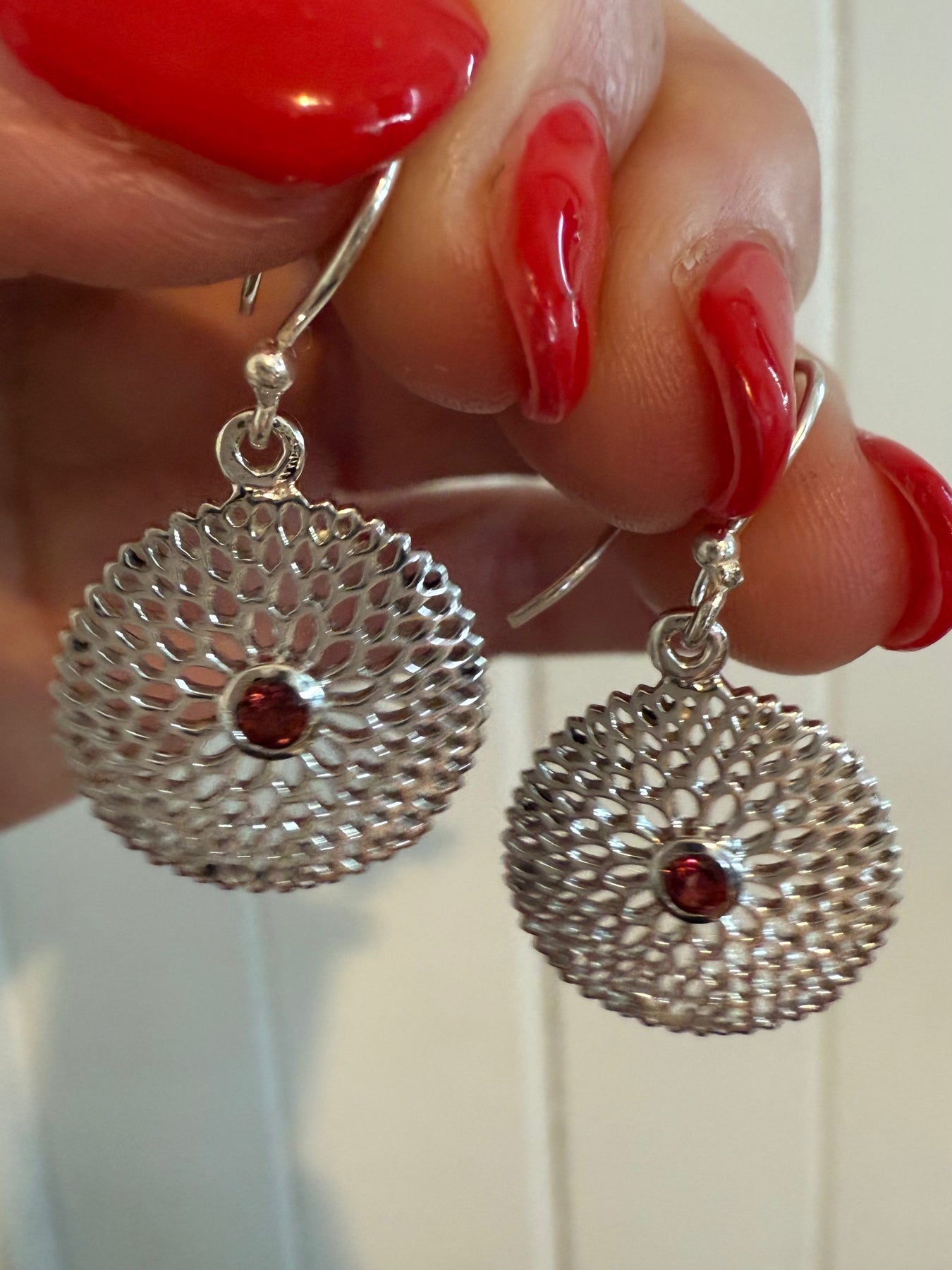 At the heart of each delicately handcrafted sterling silver filigree disc lies a radiant 2 mm natural garnet, glowing with deep crimson light. The rich red of garnet contrasts beautifully with the high-polished silver, symbolising strength, passion, and the inner fire that guides us forward.