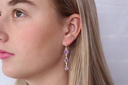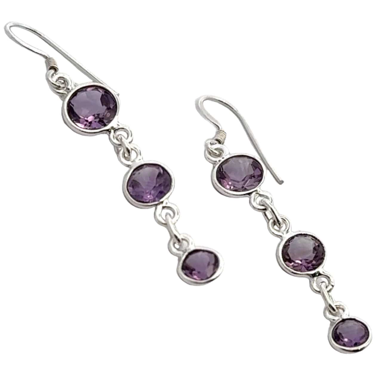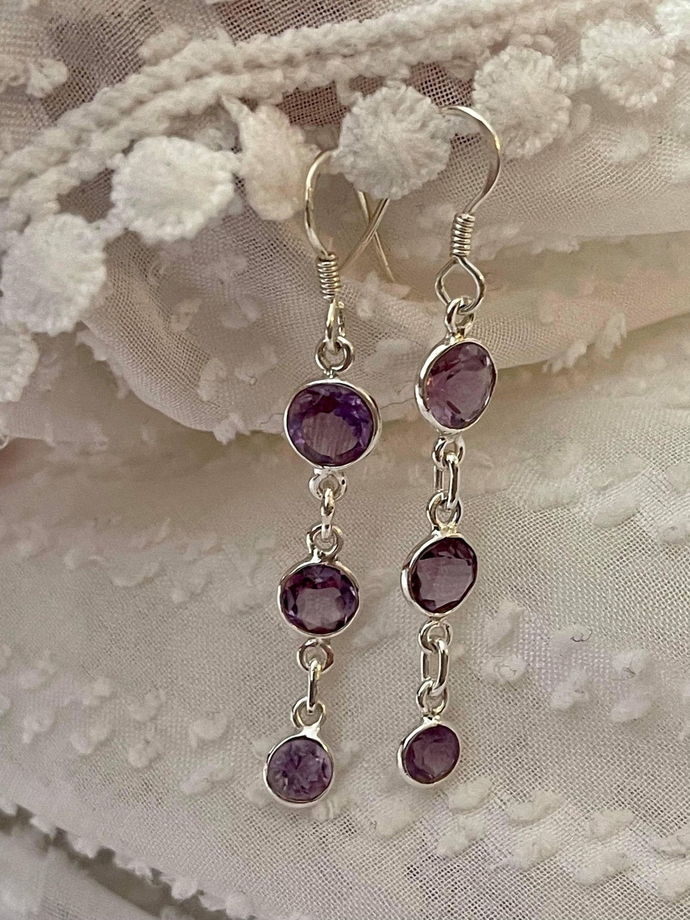 These exquisite amethyst drop earrings, featuring three natural amethyst stones facet cut to perfection for an enchanting sparkle.
