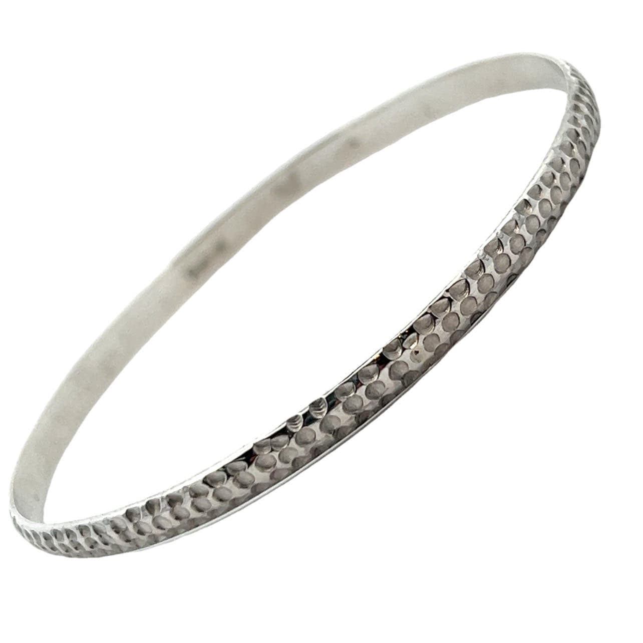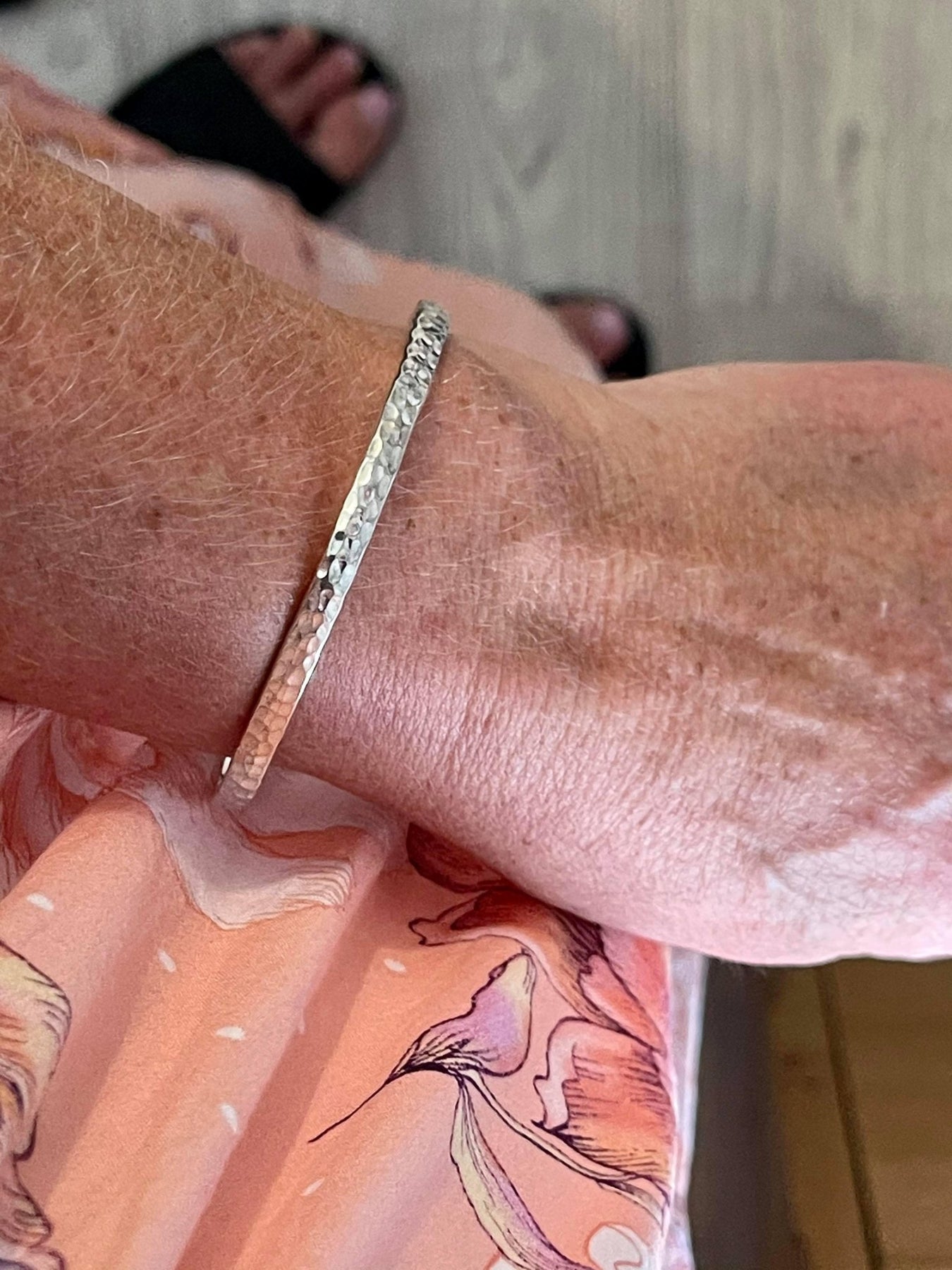 I love the uniqueness of the beaten bangle. It’s beautifully made, and very comfortable to wear. I wear it with the plain stacking bangle and they look great together. Customer service is fabulous, nothing is too much trouble. Both bangles arrived beautifully packaged. Thank you, have made more purchases, and there will be more in the not too distant future!