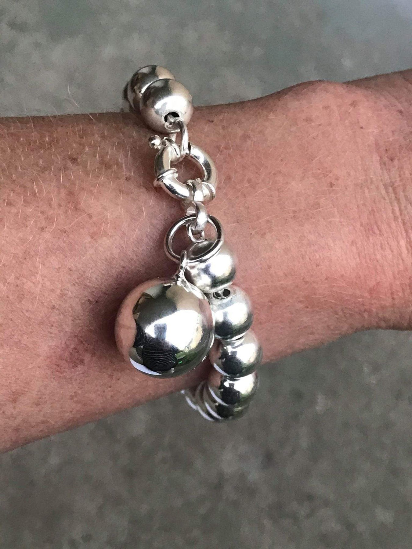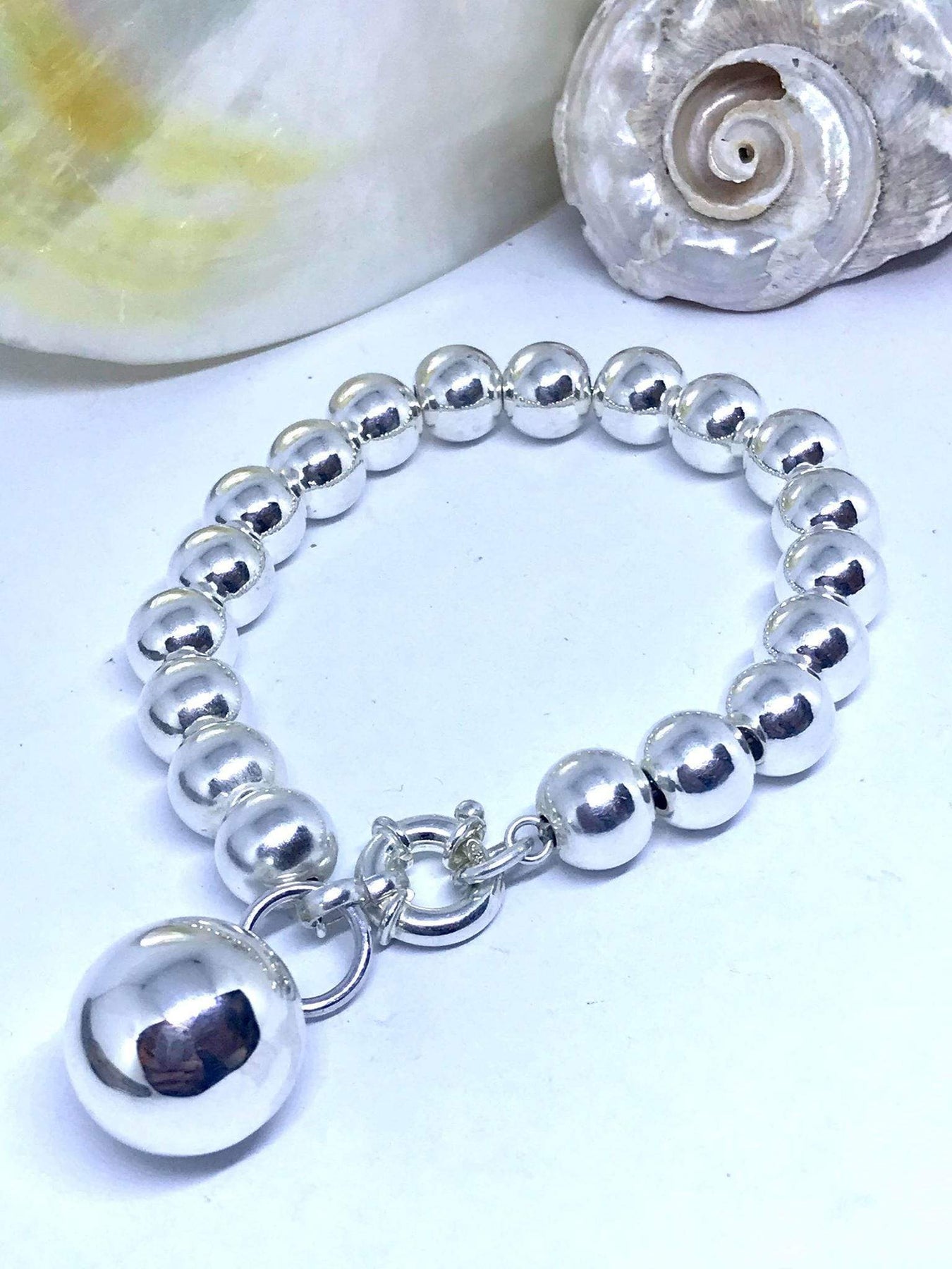 The Sterling Silver Beads are each 10 MM diameter on strong sterling chain with a handmade 16 MM ball charm and a euro bolt clasp that you can add other charms to.