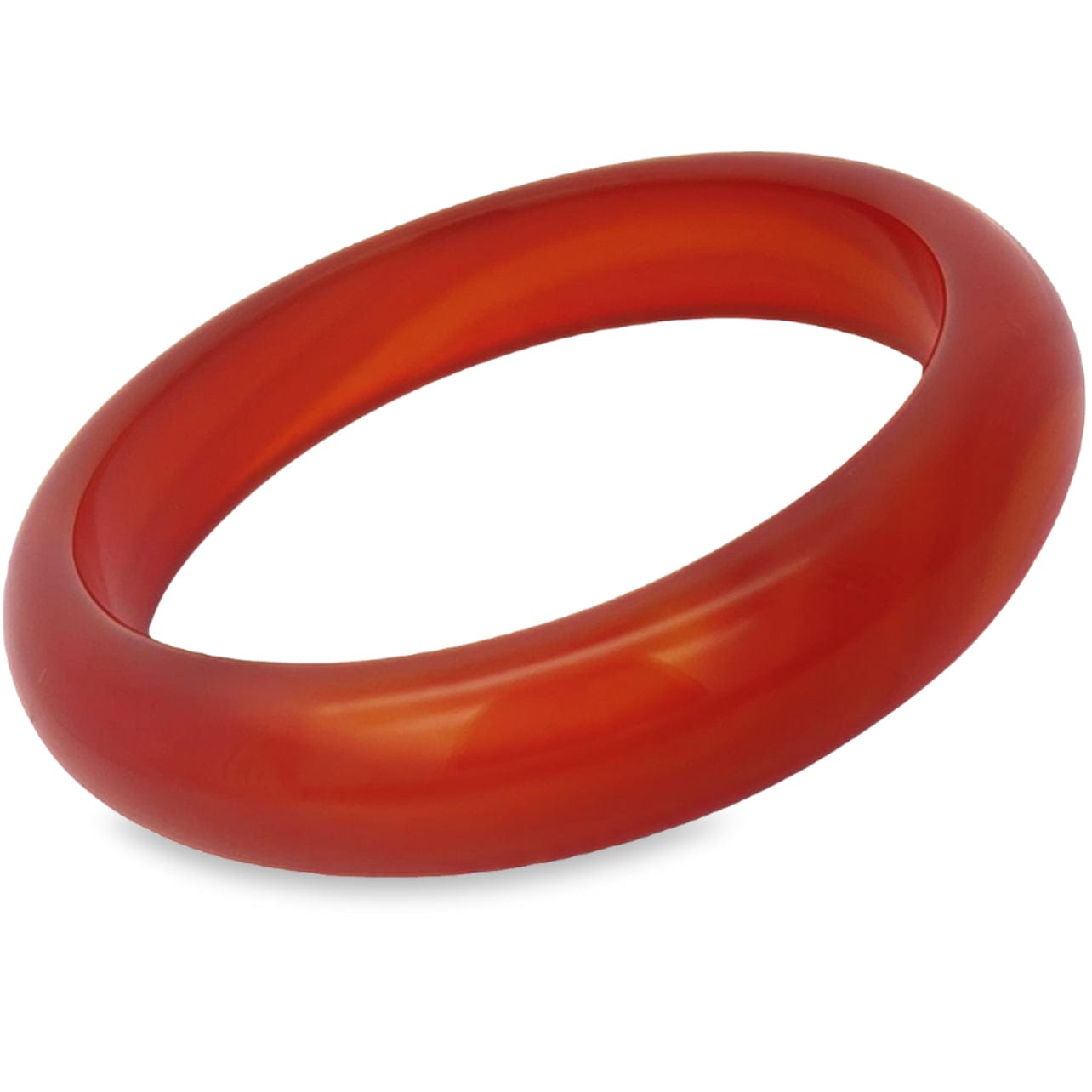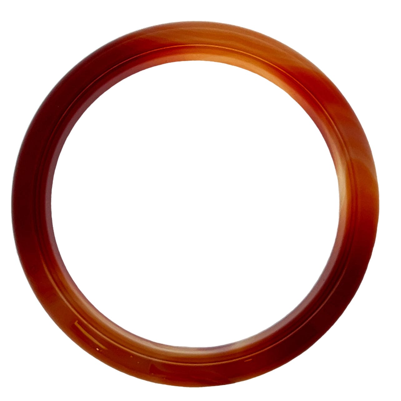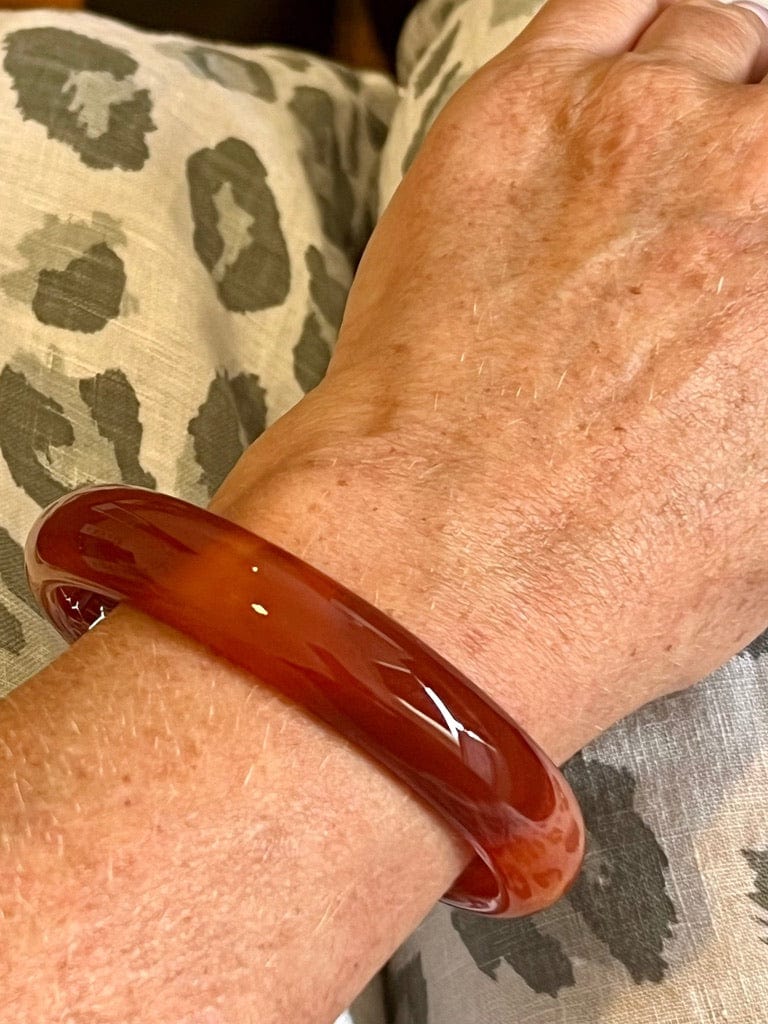 It's so pretty. When I went looking online to buy a red agate/ red Jade bangle, I found many sellers on Etsy, and other online stores. They were some cheaper and some more expensive. But what made me buy from desiderate is the fact that they are a local business and a family run business. I trusted Desiderate to be authentic. And I am absolutely happy with my purchase. I love it. I wish they would have offered a smaller size bangle (I bought S, the smallest size offered) so that it would have been a bit more snug for me but I still absolutely love it. The colour is gorgeous in person and even better than the photos. The photo makes it look thinner than it actually is. It's got a nice curve and thickness.