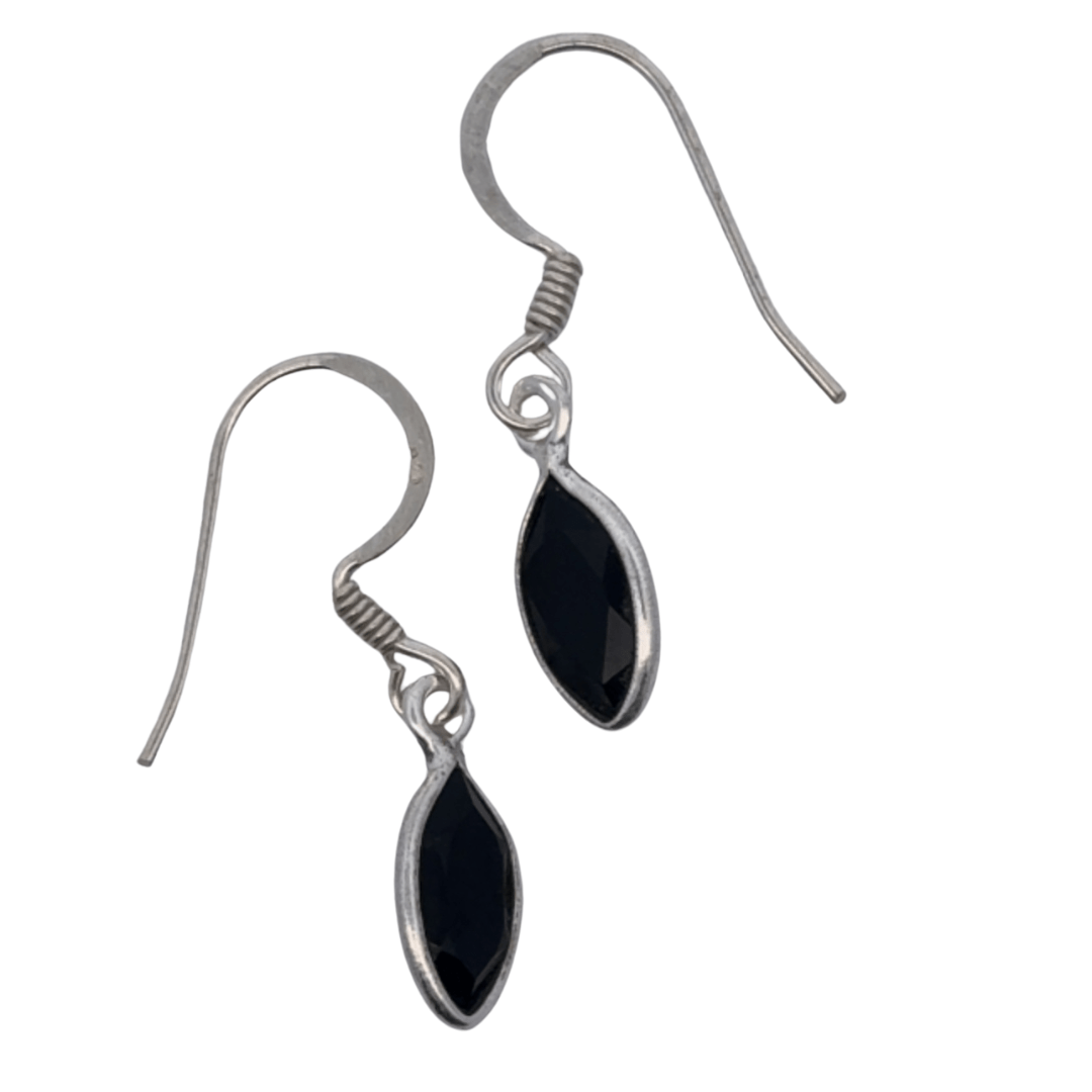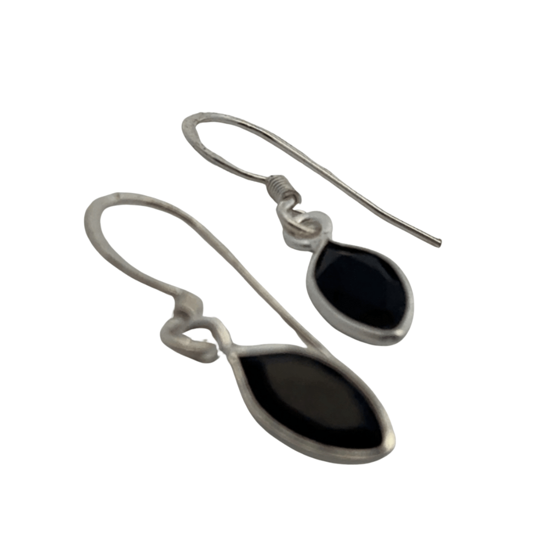 The focal point of these earrings is a stunning marquise-shaped onyx, a gemstone known for its deep black colour and captivating sheen. This stone is carefully crafted and set in a sterling silver setting, giving the piece a sleek and sophisticated look.