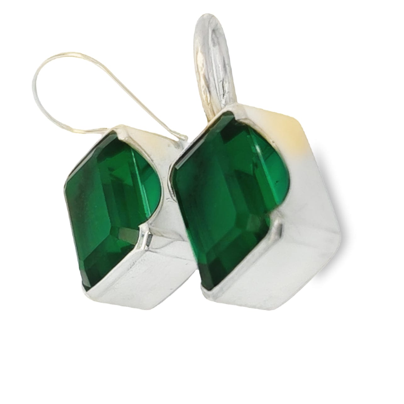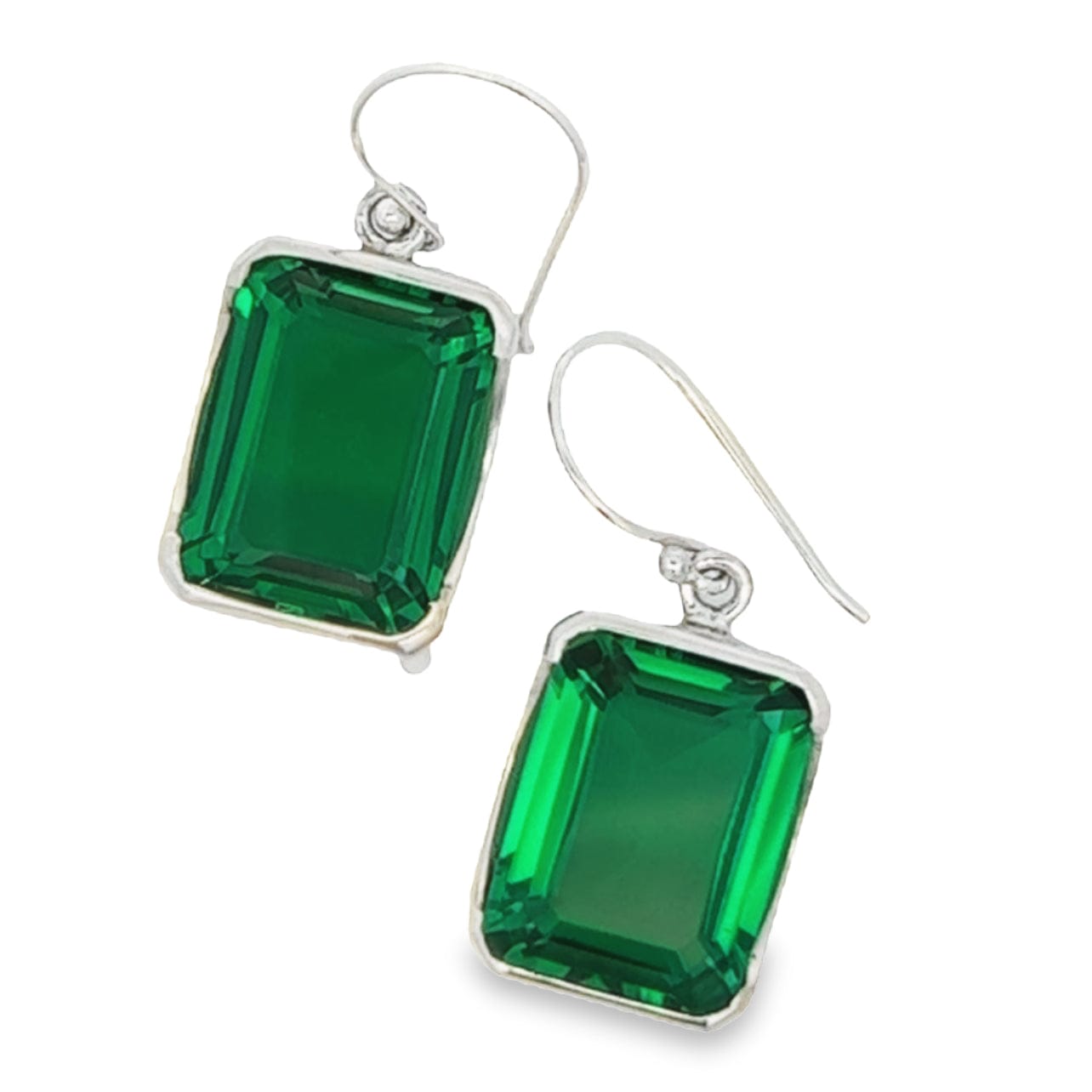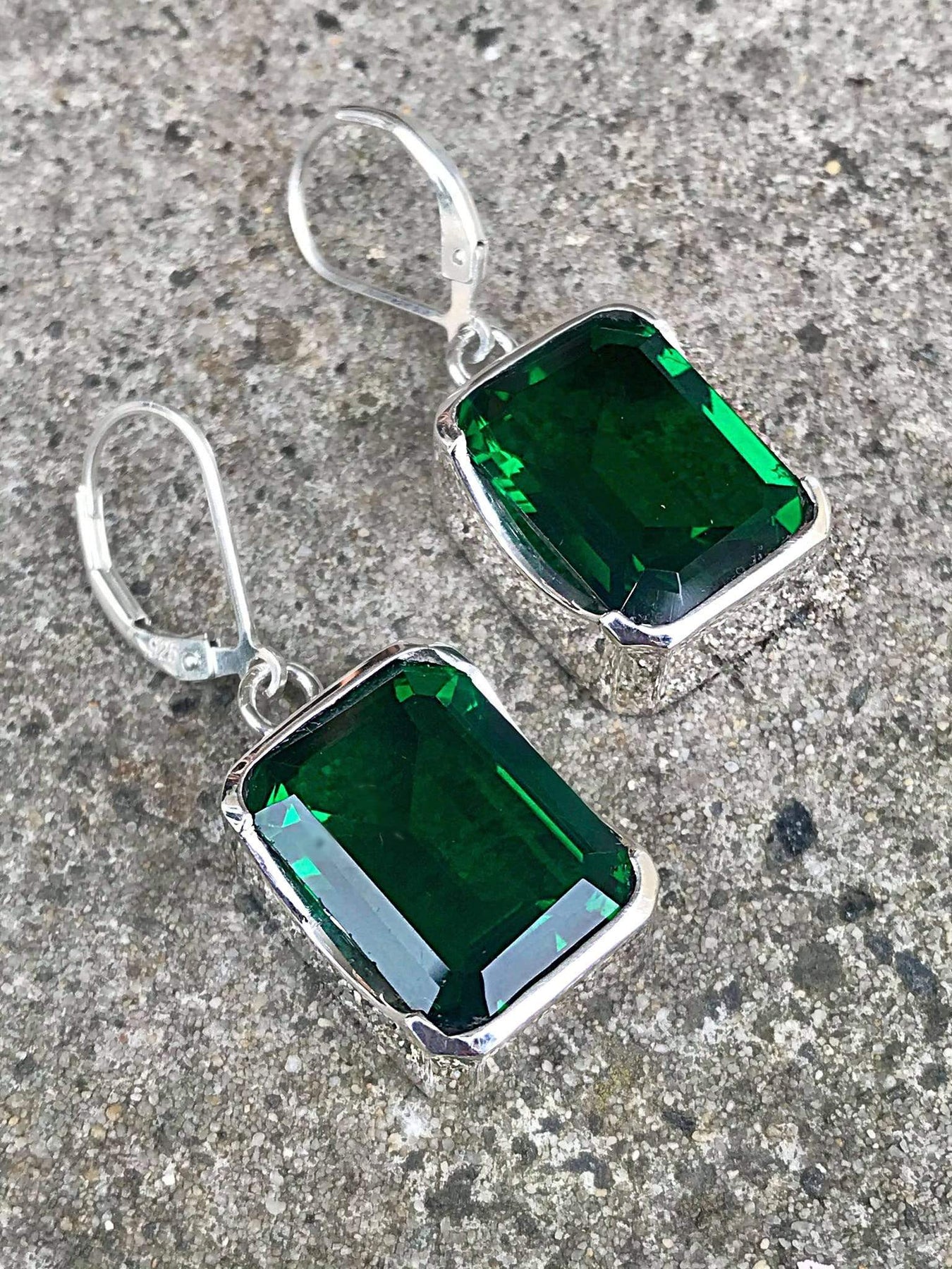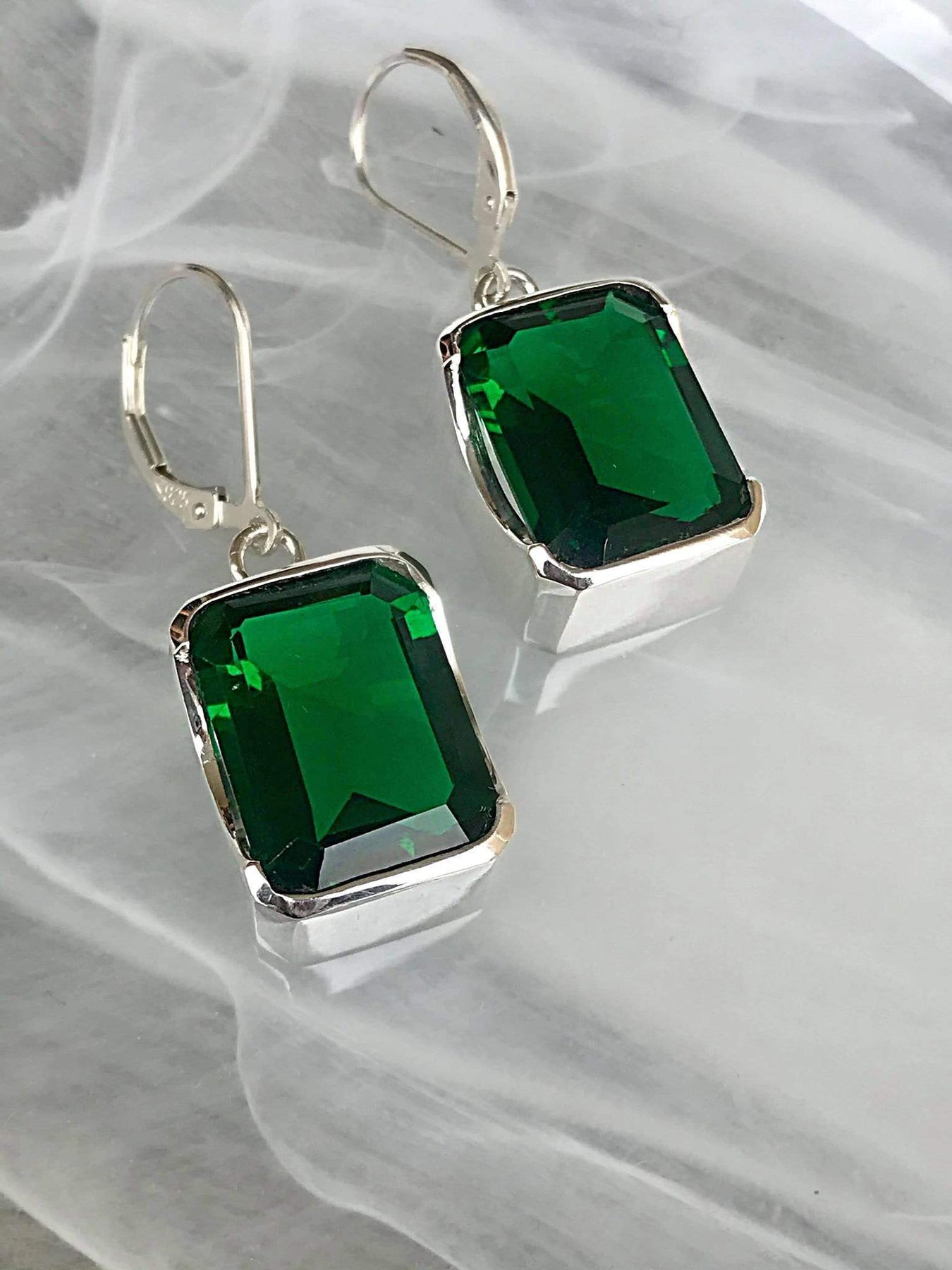 Large emerald cut green gemstone earrings encased in shiny sterling silver.