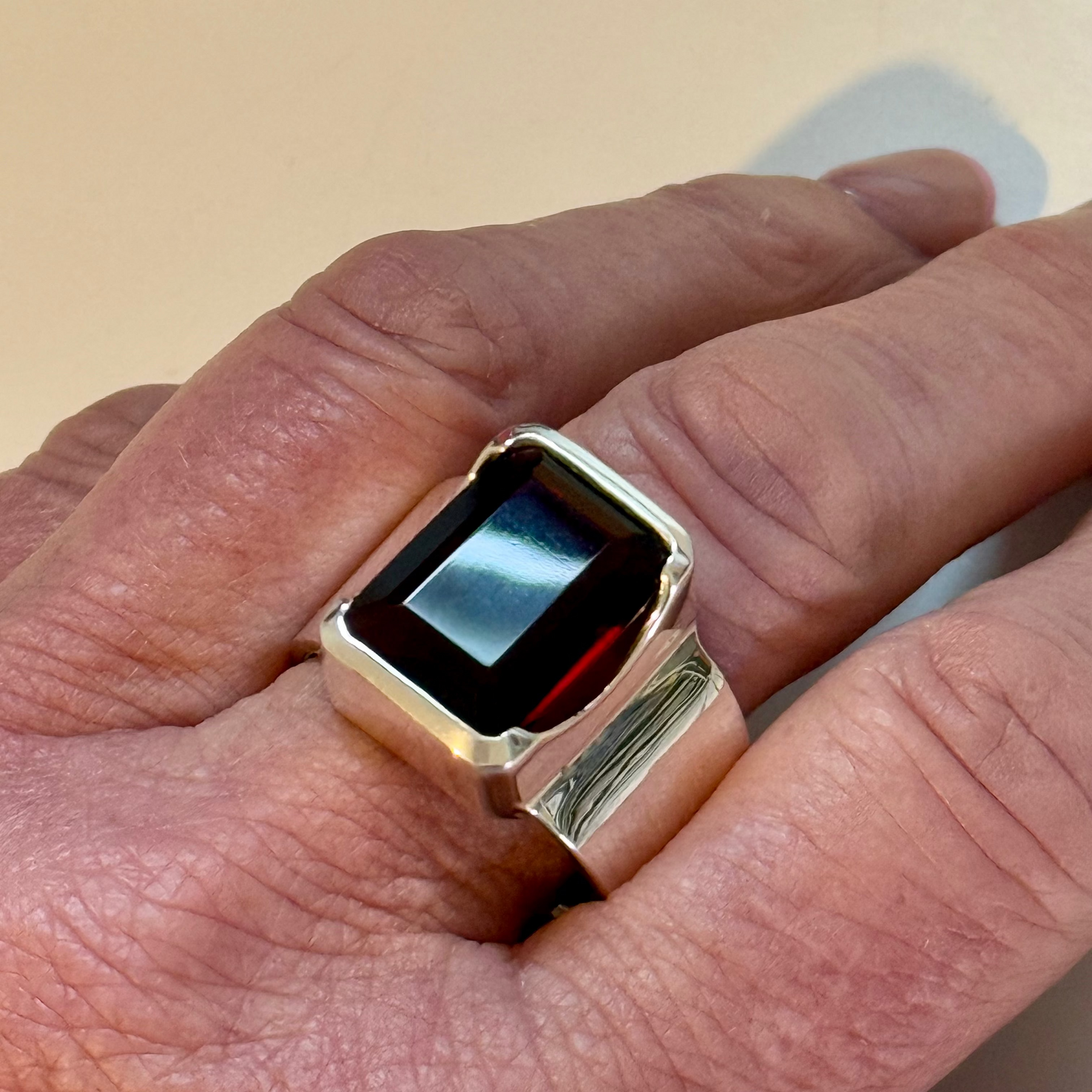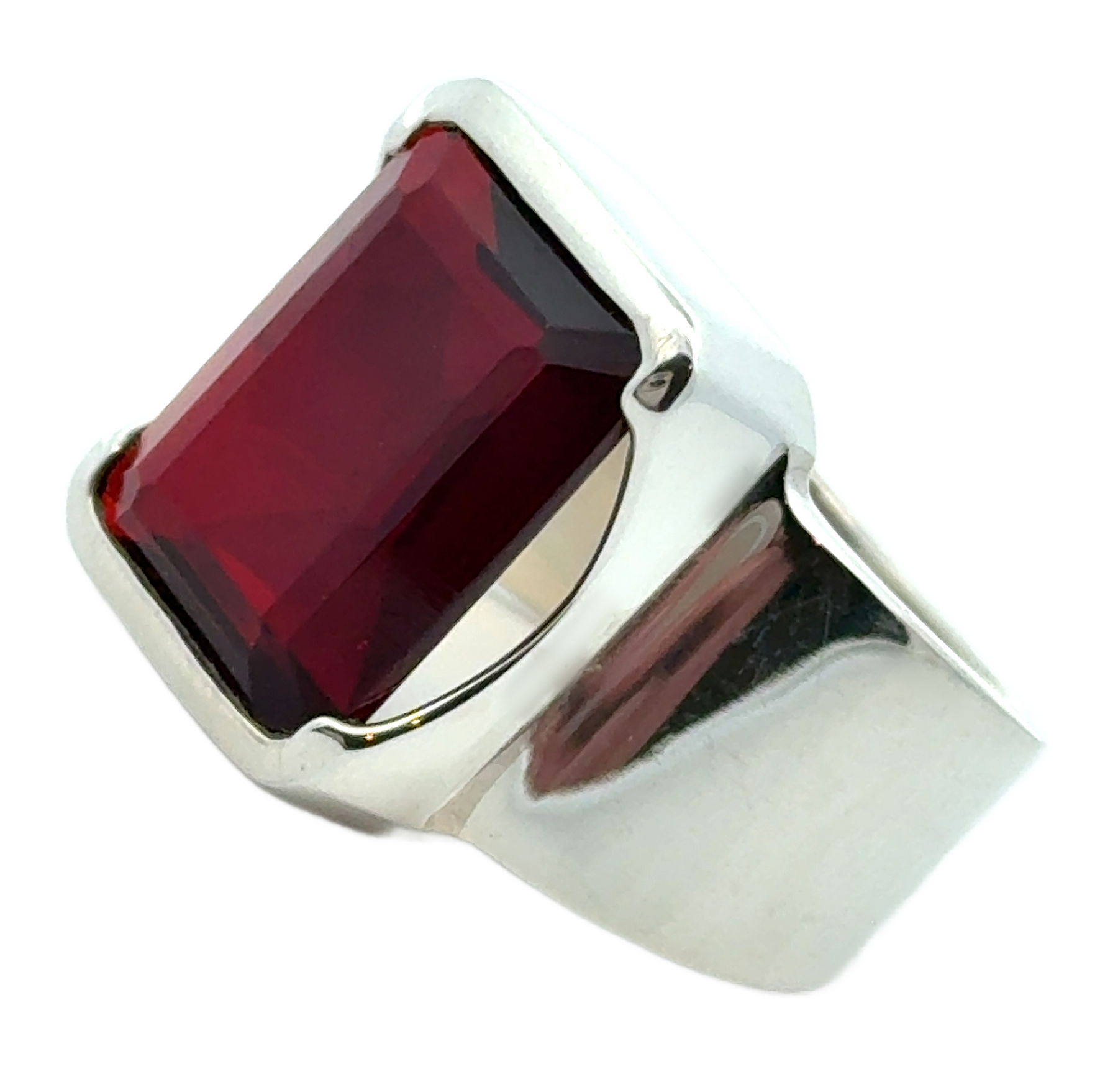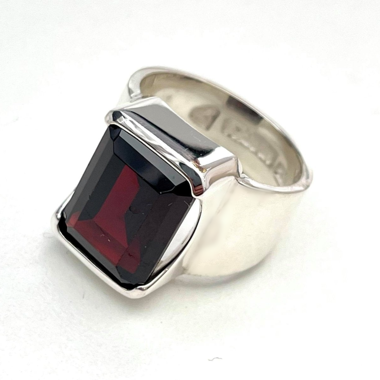 A glorious grandiose emerald cut garnet holding her own in a simple and striking silver setting.