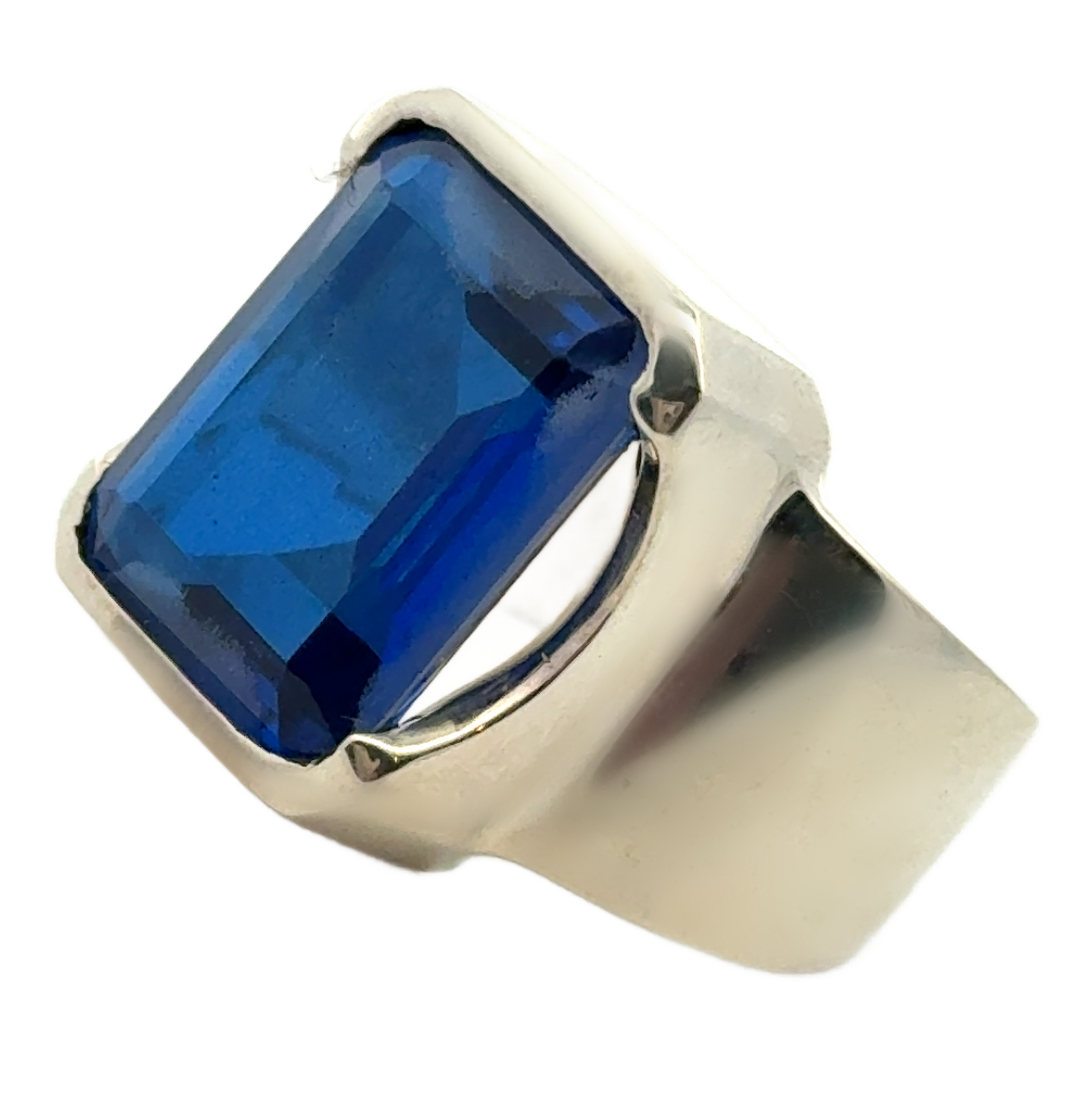 The emerald cut sapphire blue quartz is richly translucent and contrasts brilliantly against the shiny sterling silver setting.