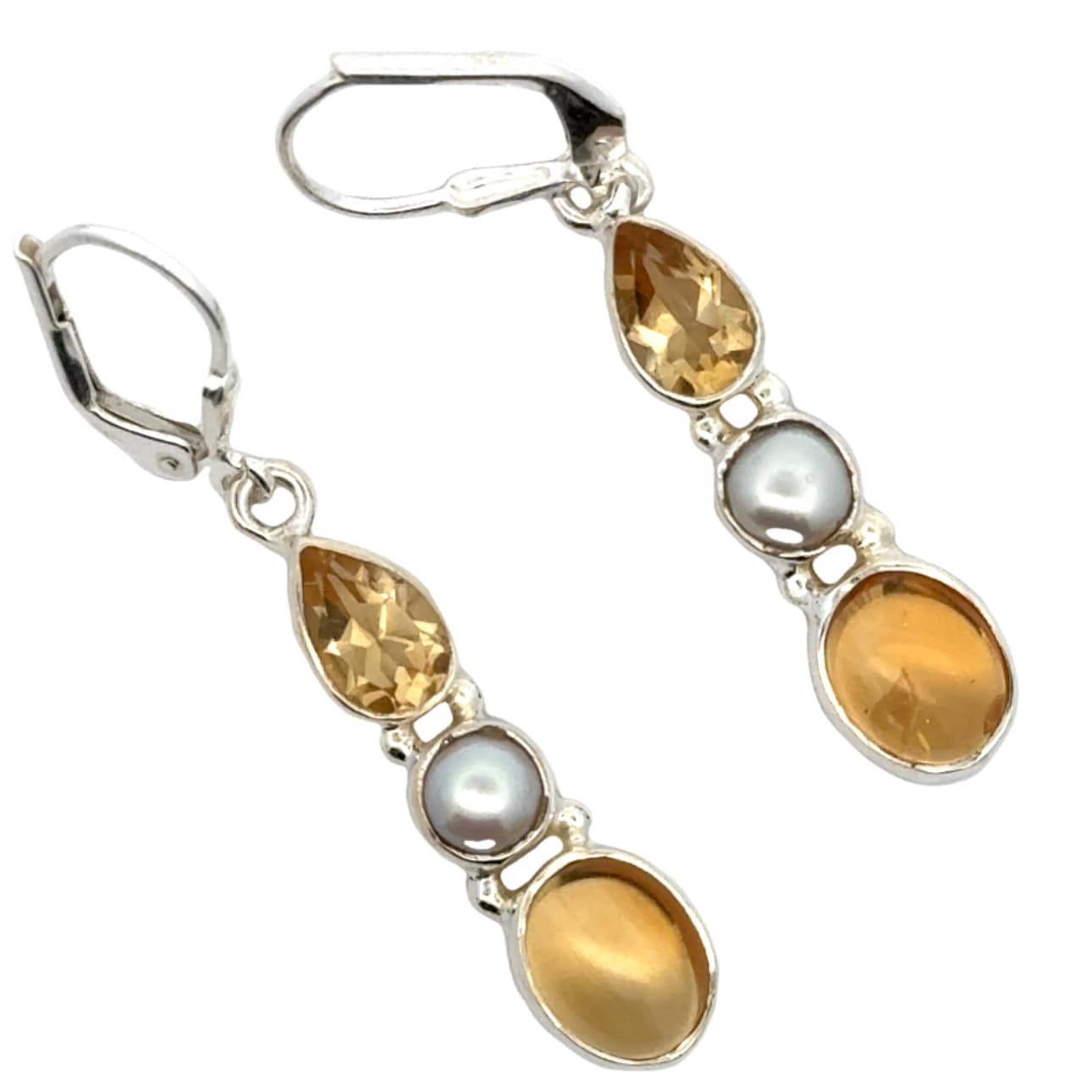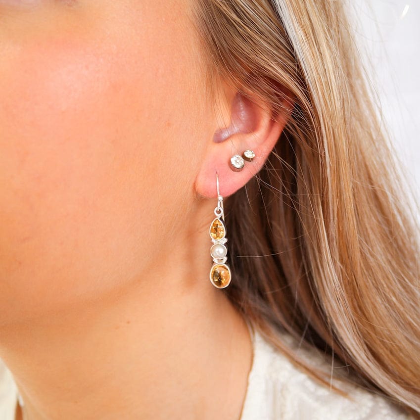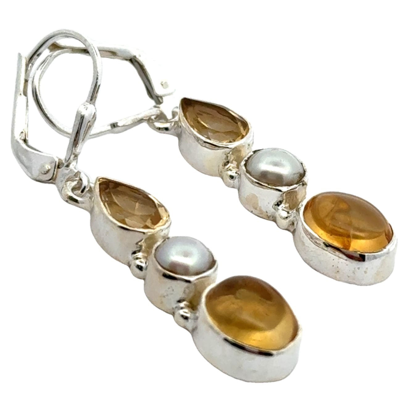The sunny colours of Citrine pair perfectly with pearls and they are all encased in shiny sterling silver in bezel settings. We've combined polished cabochon stones and faceted gems, for sparkle and shine.