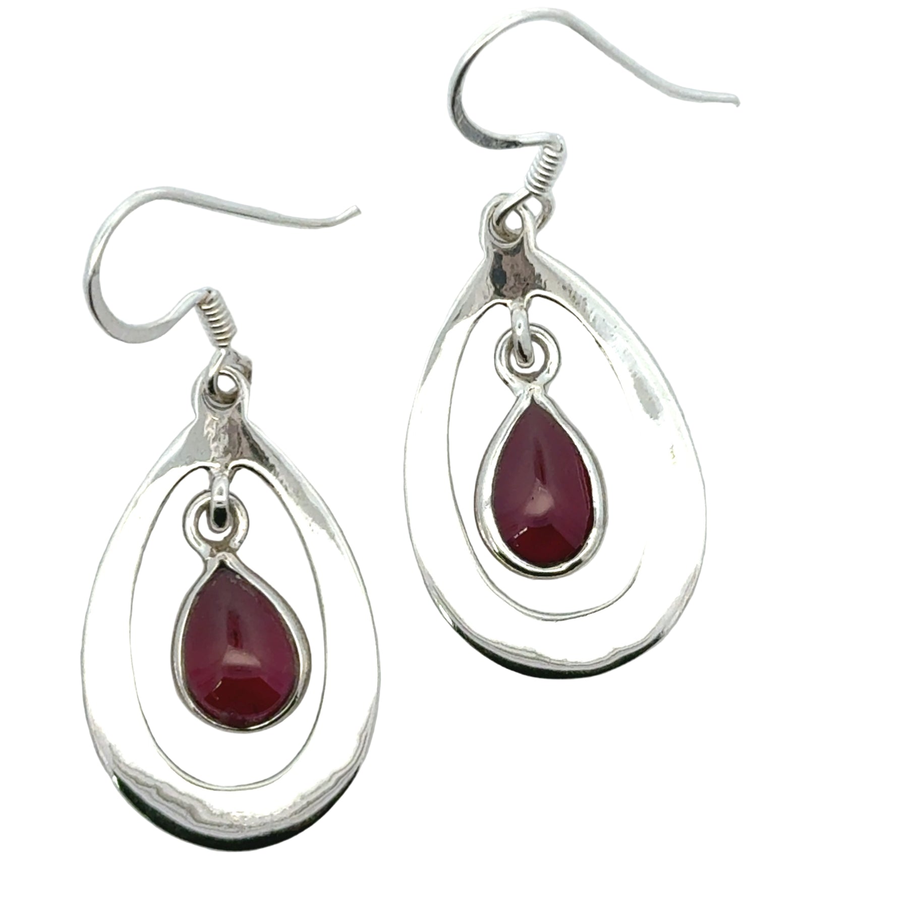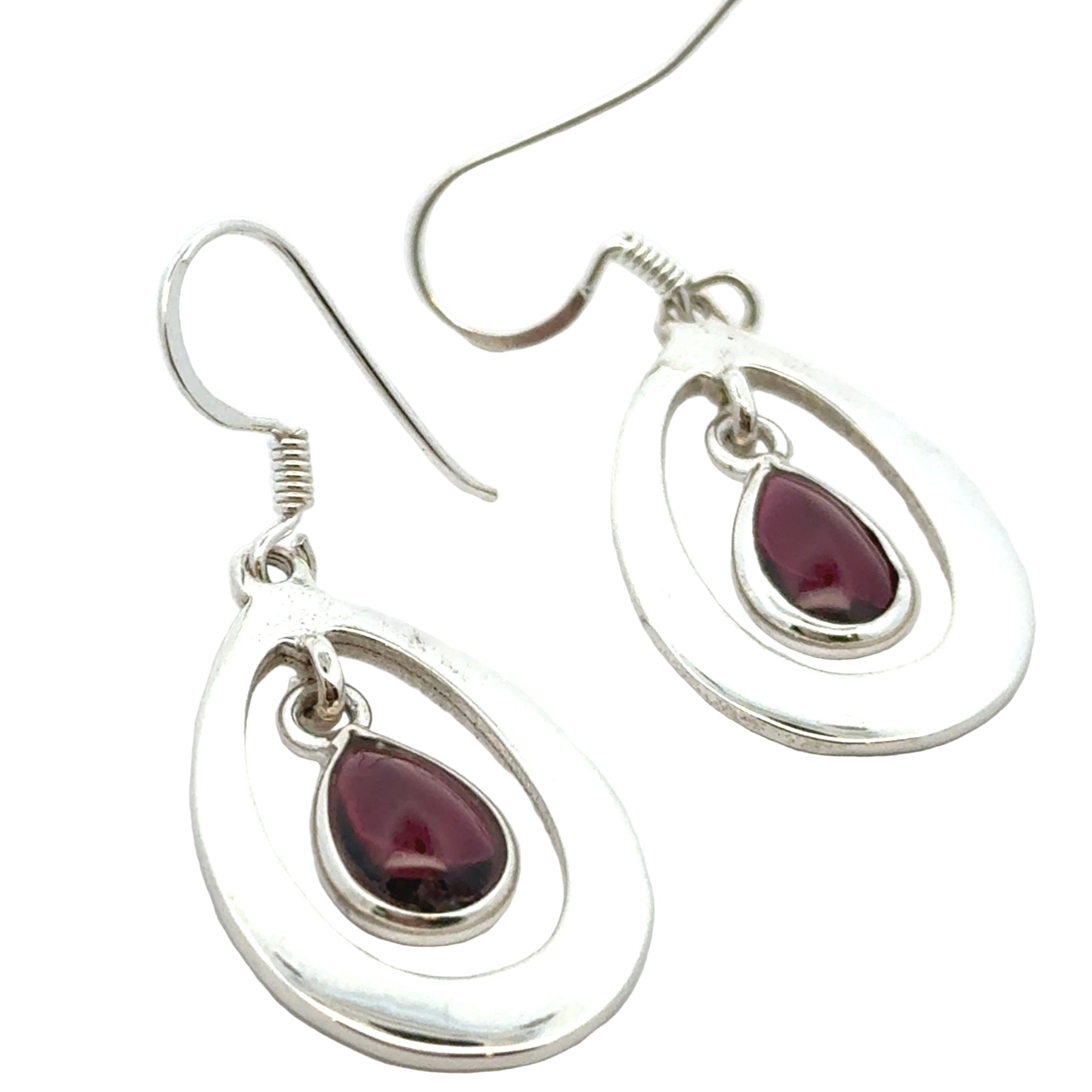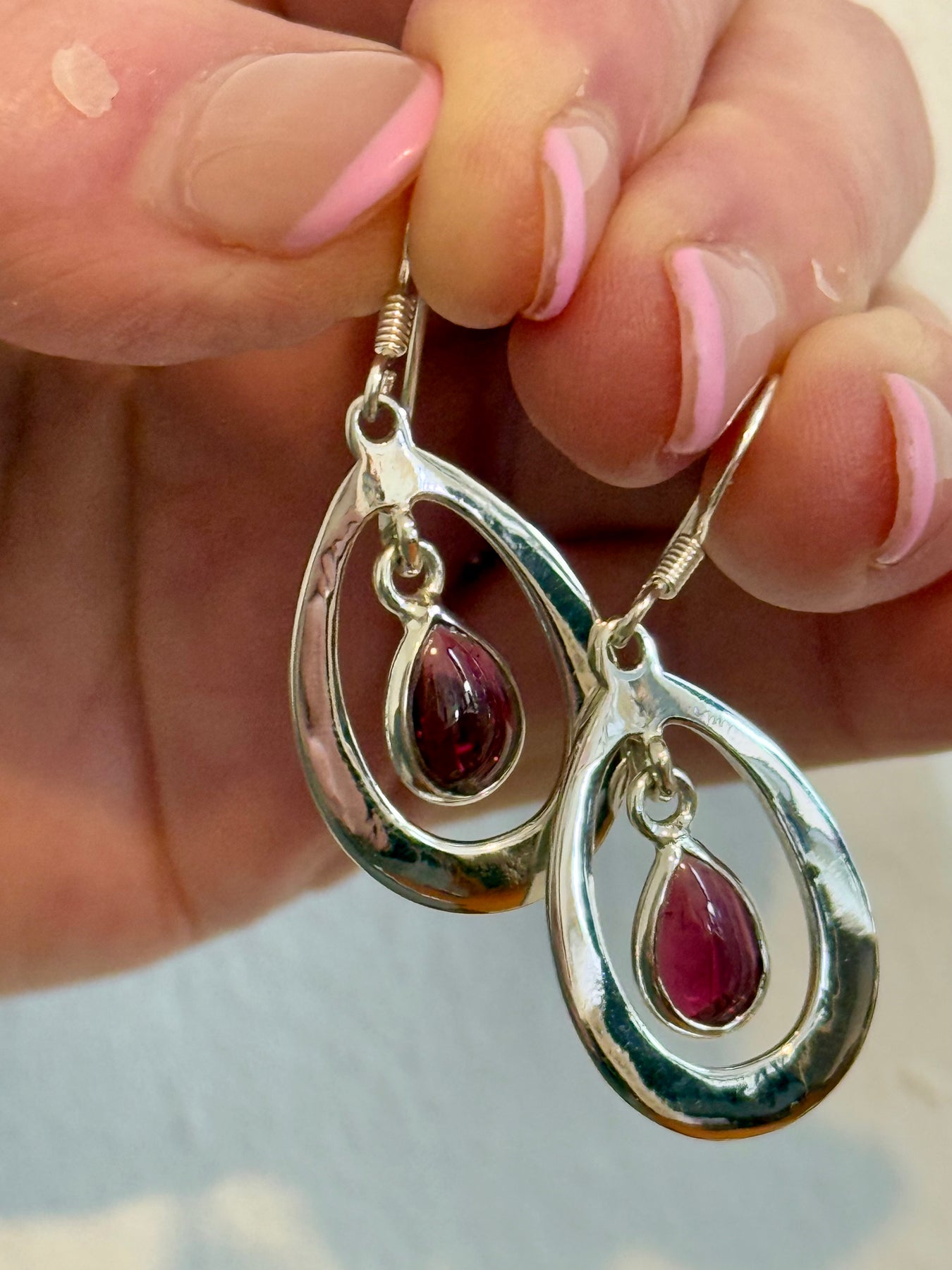 Silver earrings with teardrop-shaped garnet gemstones on a white background