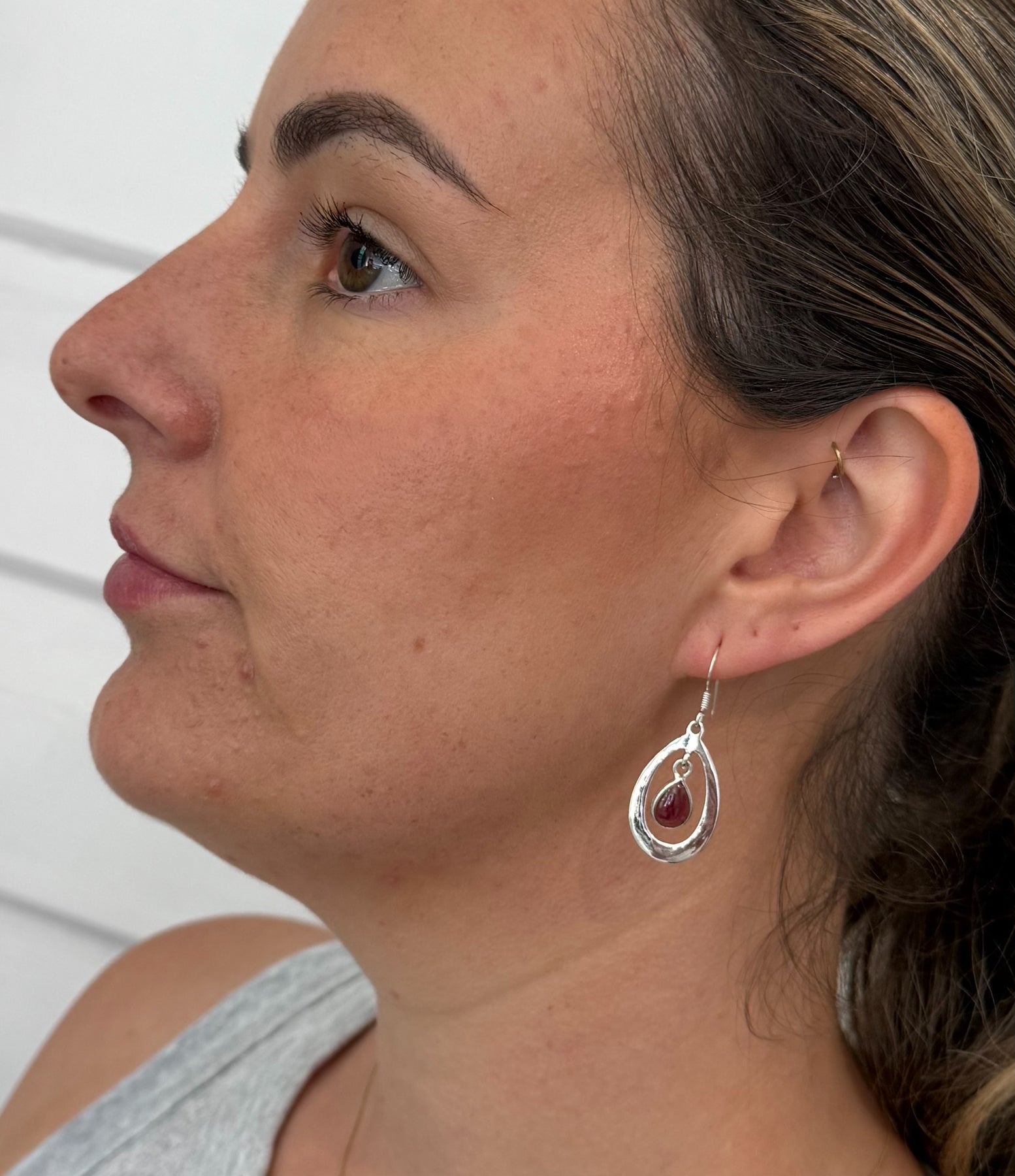 Close-up of a woman wearing a silver teardrop earring with a red gemstone.