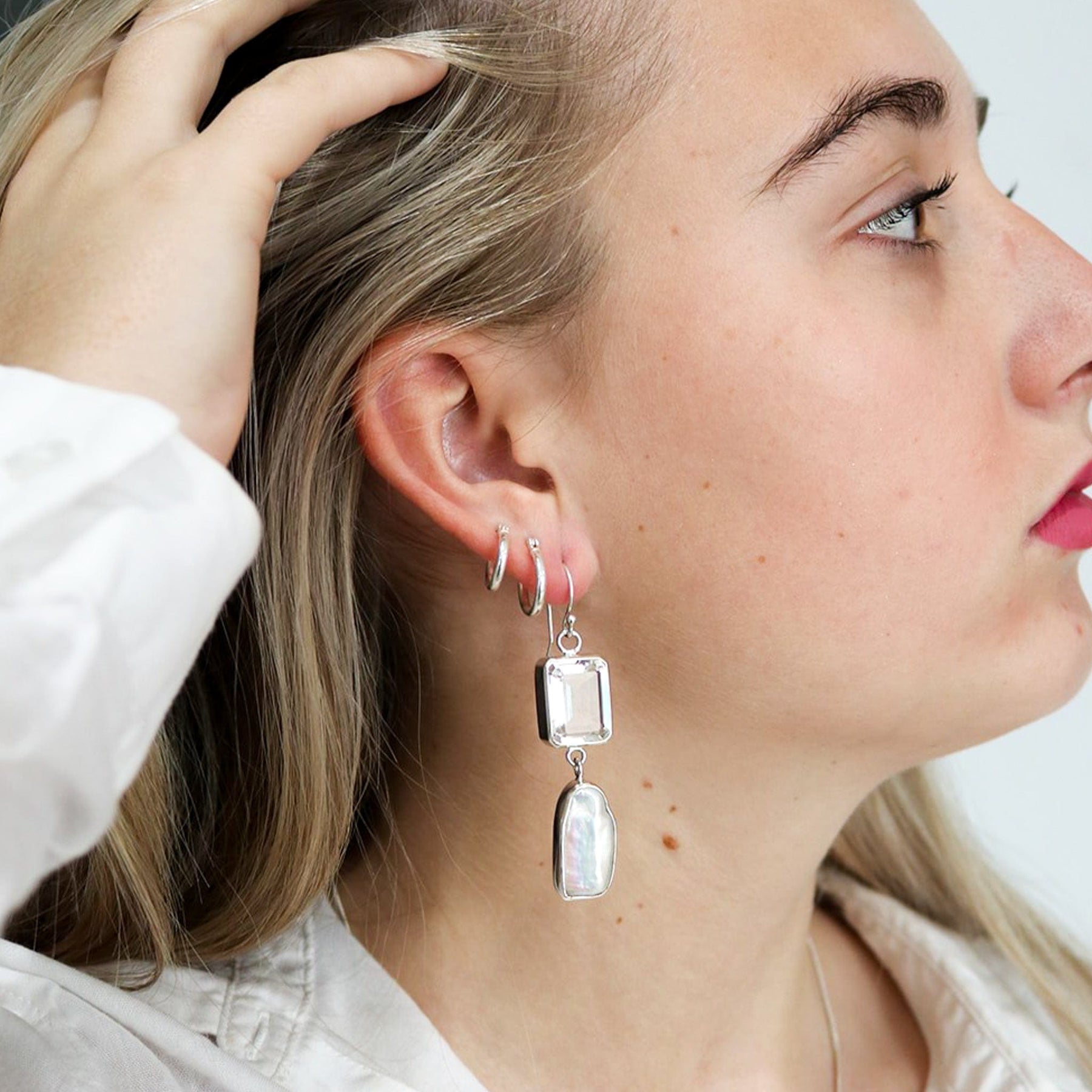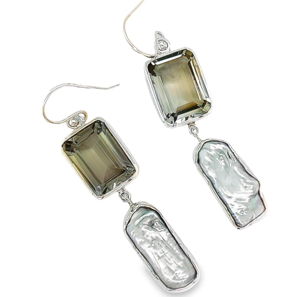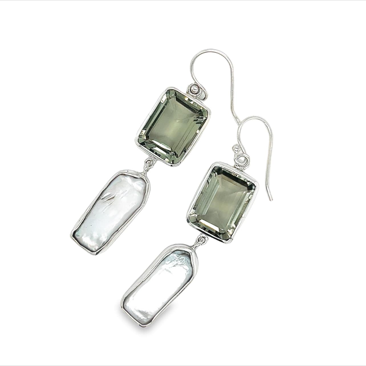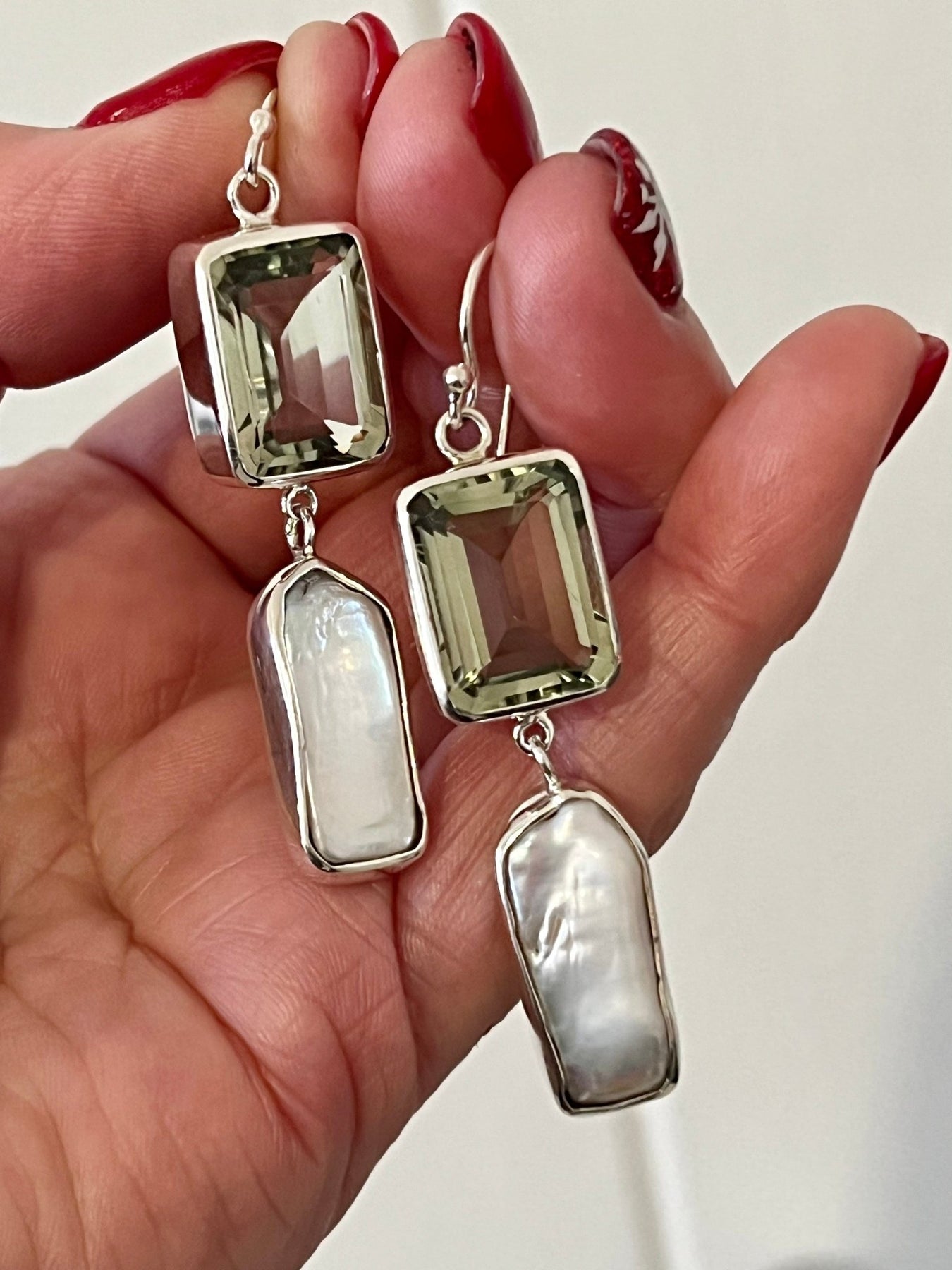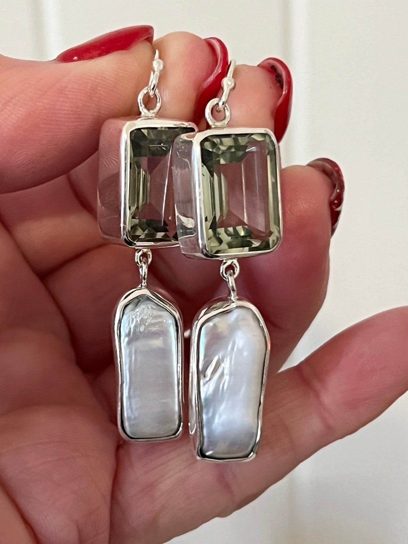 These sterling silver earrings feature emerald cut prasiolte that capture the light with every movement. Beneath we have the lovely keshi pearl in its 100% unique form. The mismatched shapes of the keshi pearl give an abstract feel (the shape is not uniform) for a modern edge.