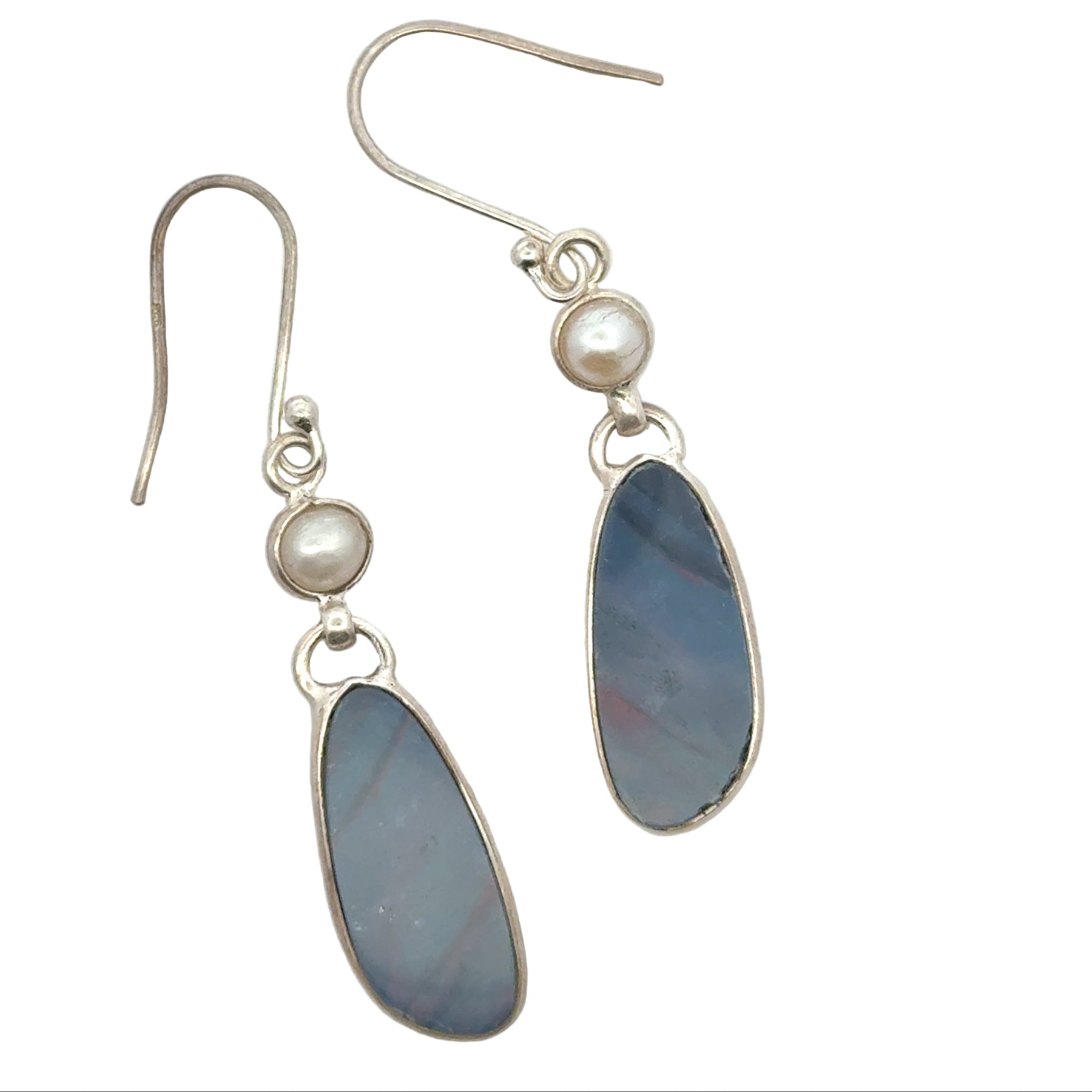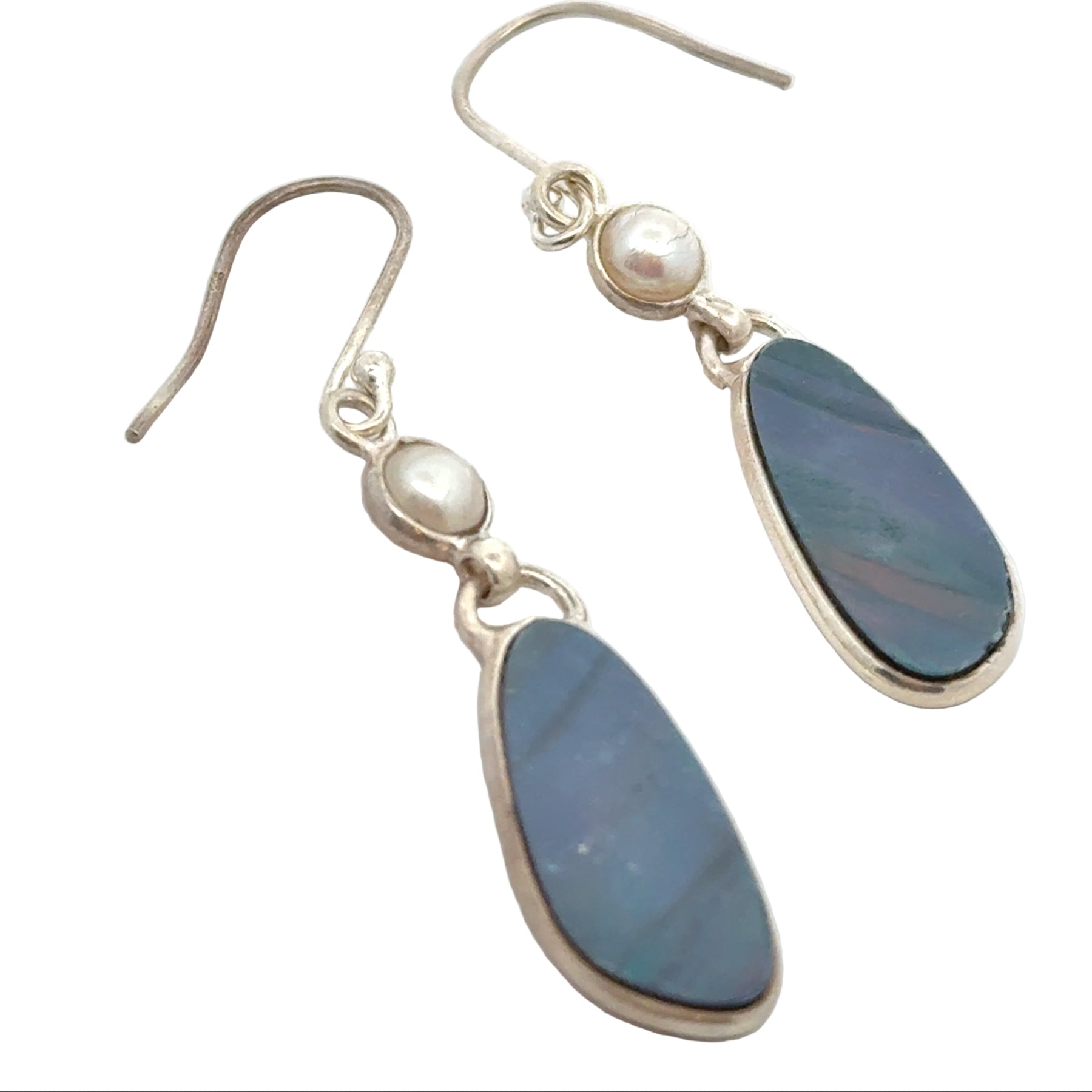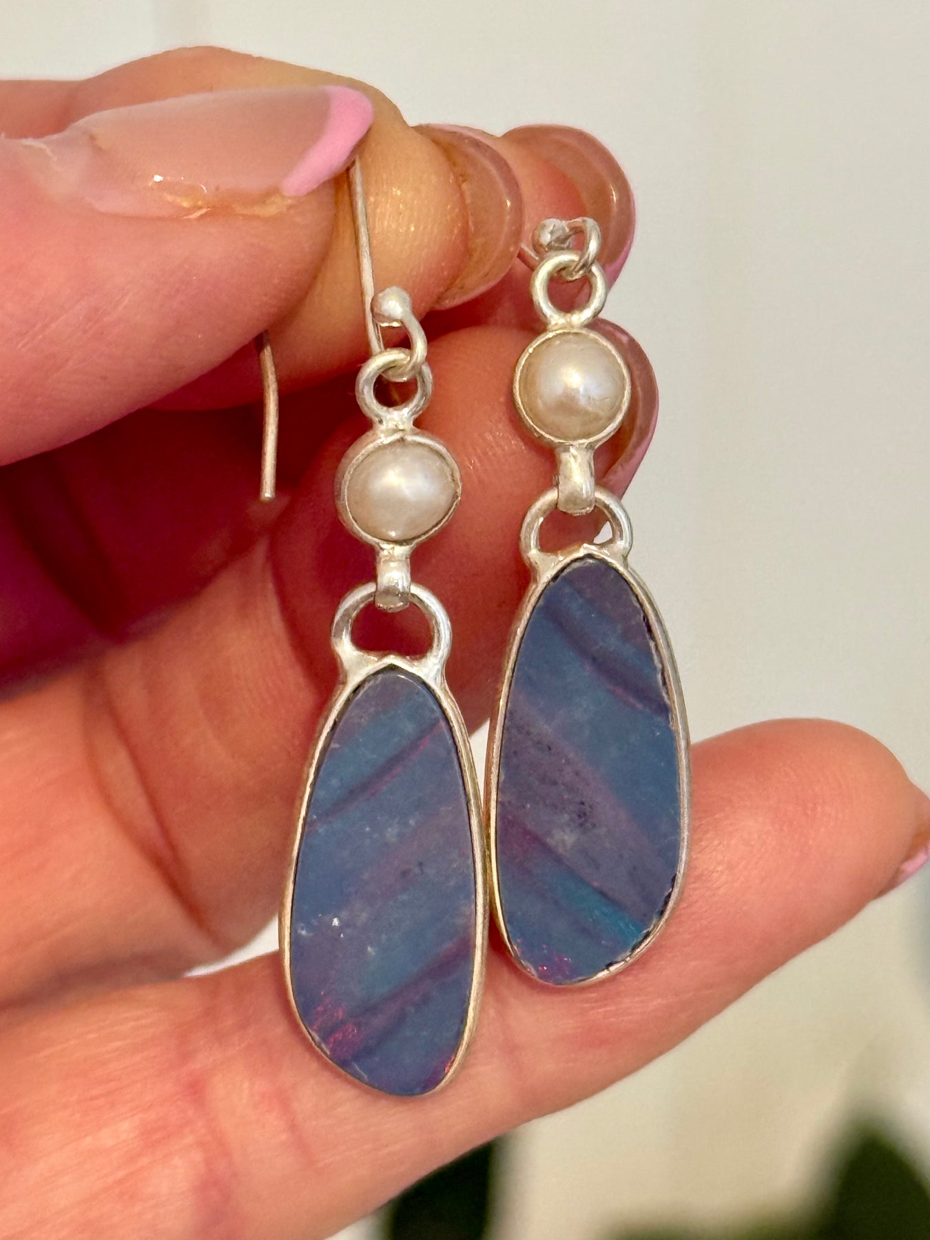 Each earring features a delicate 4mm white pearl above a stunning Australian opal doublet drop, measuring approximately 20 x 11mm. The opal’s mesmerising play of colour dances with every movement, while the soft glow of the pearl adds timeless sophistication.