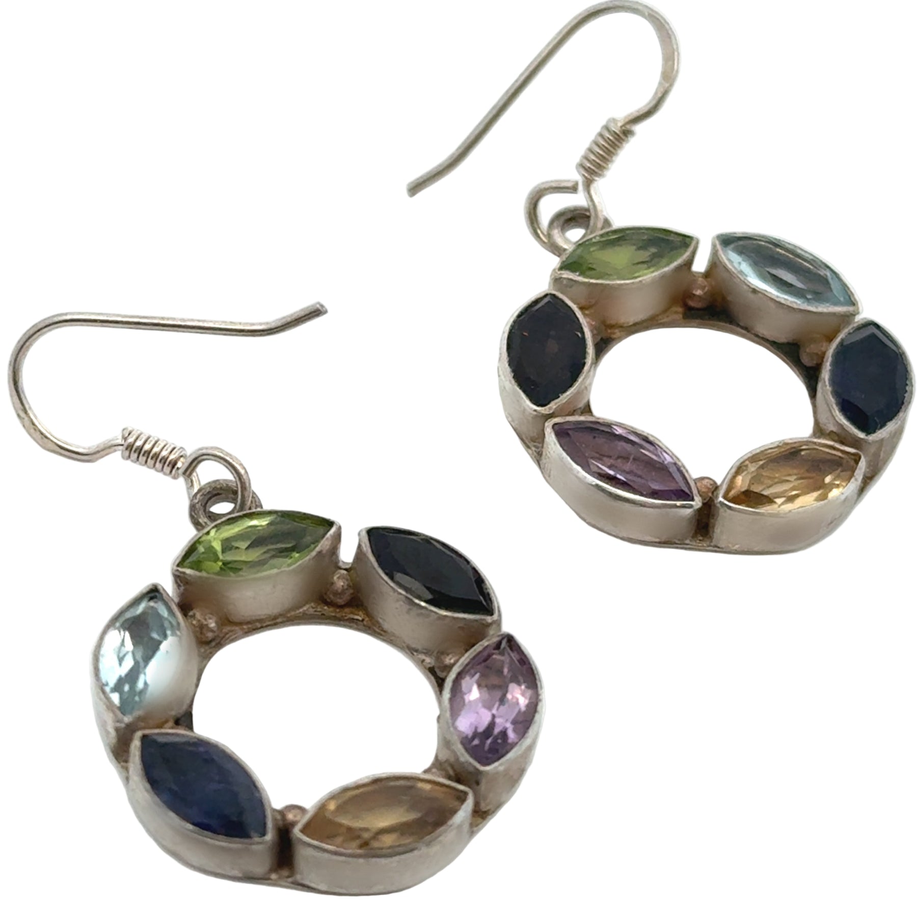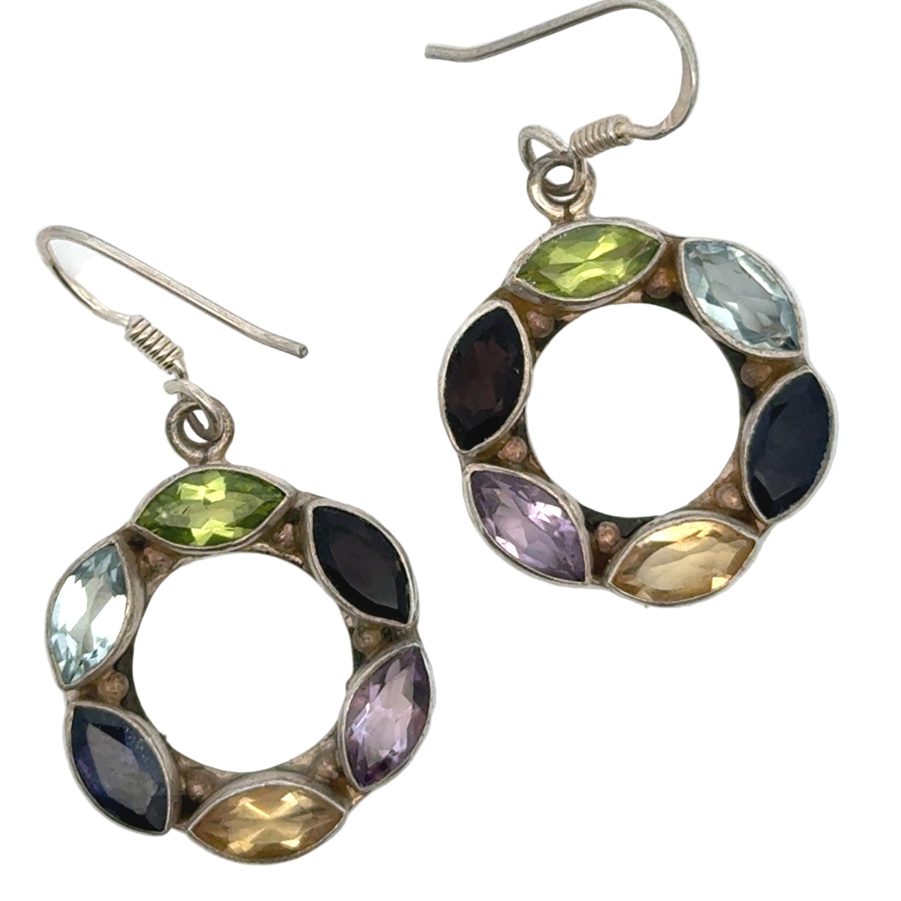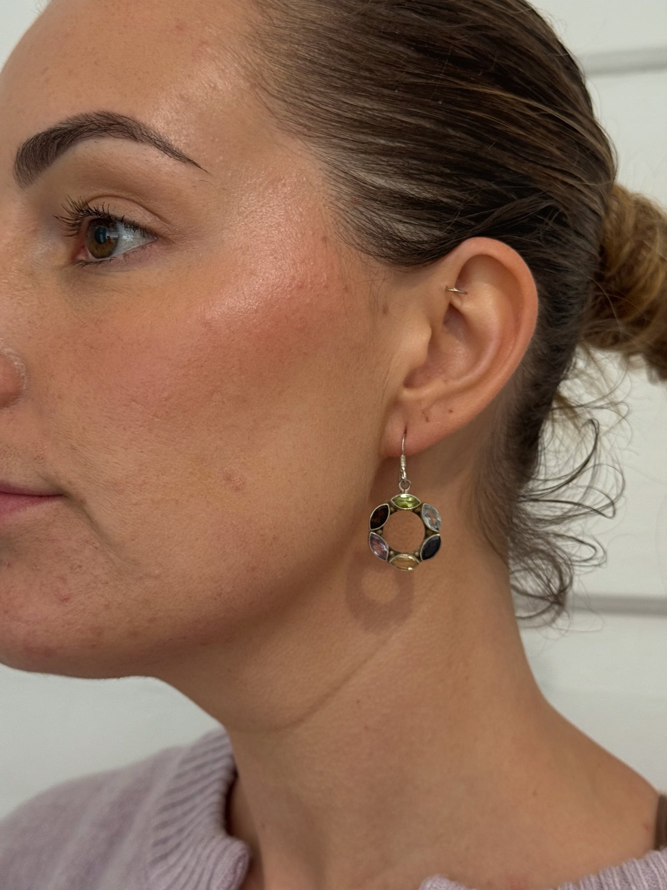 Each earring features six radiant marquise-cut gemstones: amethyst, citrine, peridot, aquamarine, smoky quartz and garnet. Each one carefully set to create a shimmering halo of colour. The stones measure 4 x 8MM and are framed in oxidised sterling silver, adding a dark contrast that makes the colours glow even brighter.