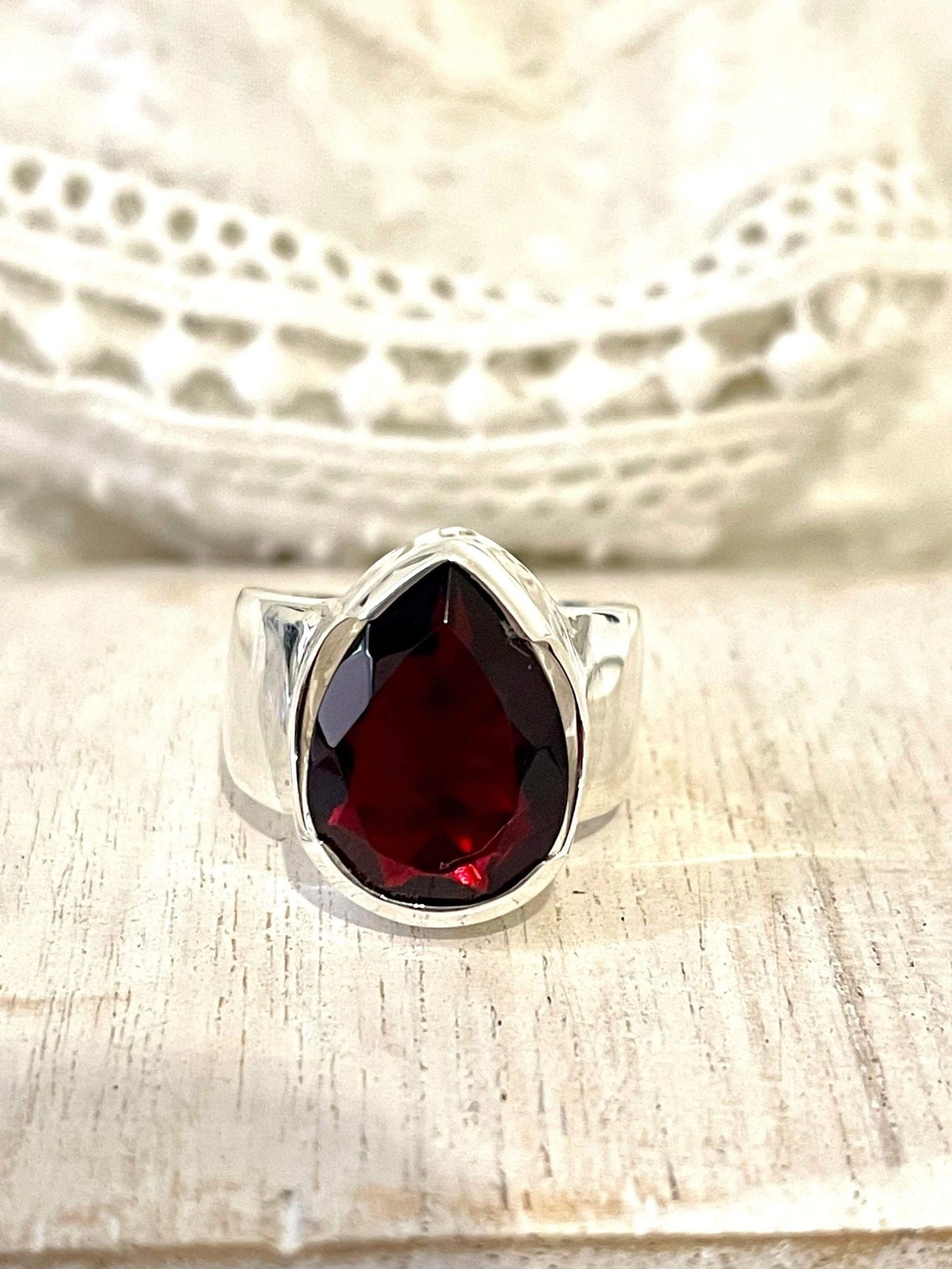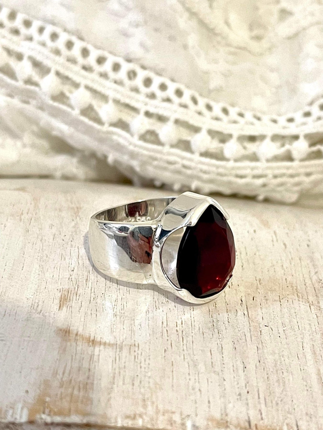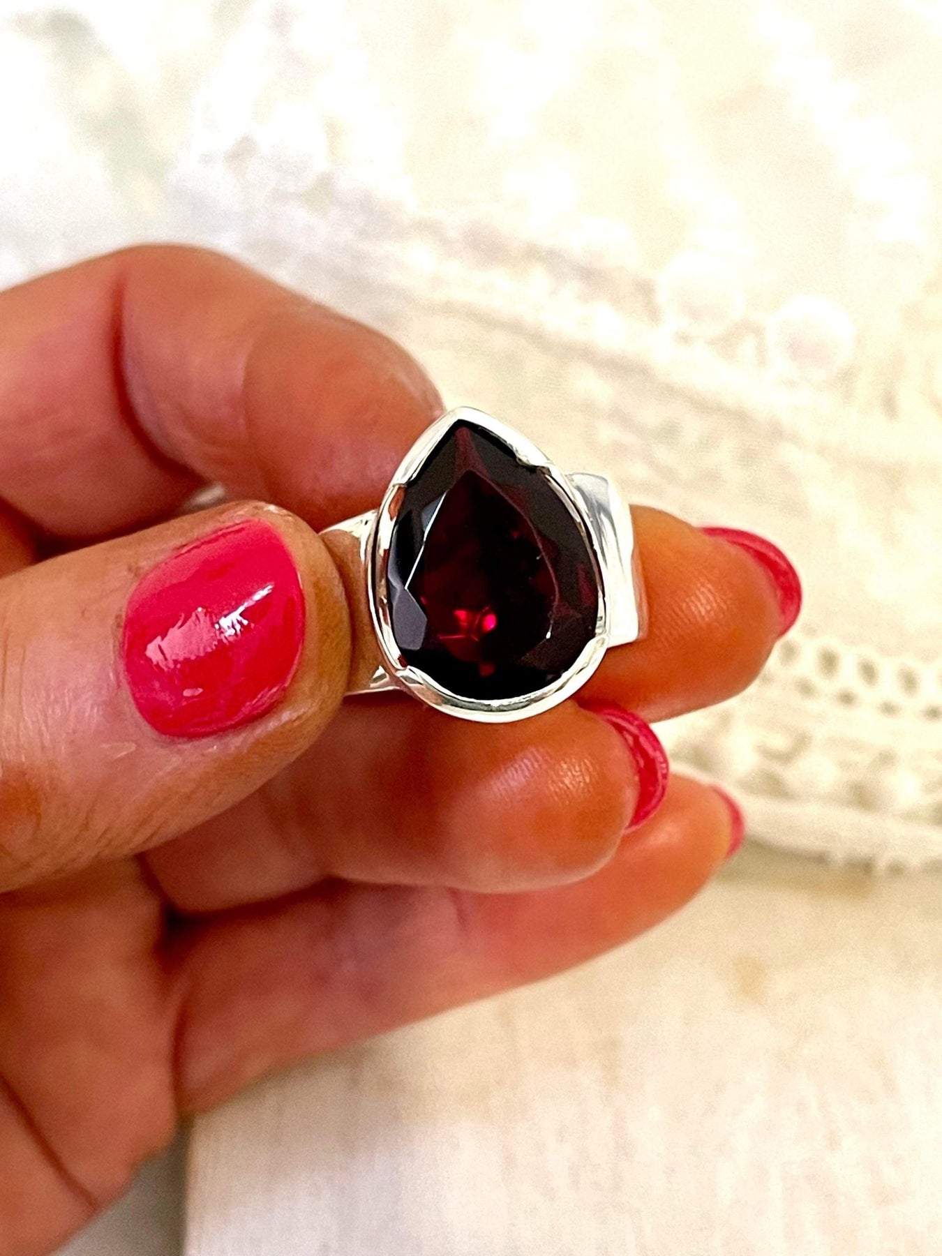 The stunning deep blood red of this large garnet teardrop ring will definitely have you mesmerized from the start. This amazing ring looks absolutely stunning on any hand and will match pretty much any striking, bold outfit you may decide to wear or add a bit of bold to a 'sensible' outfit.