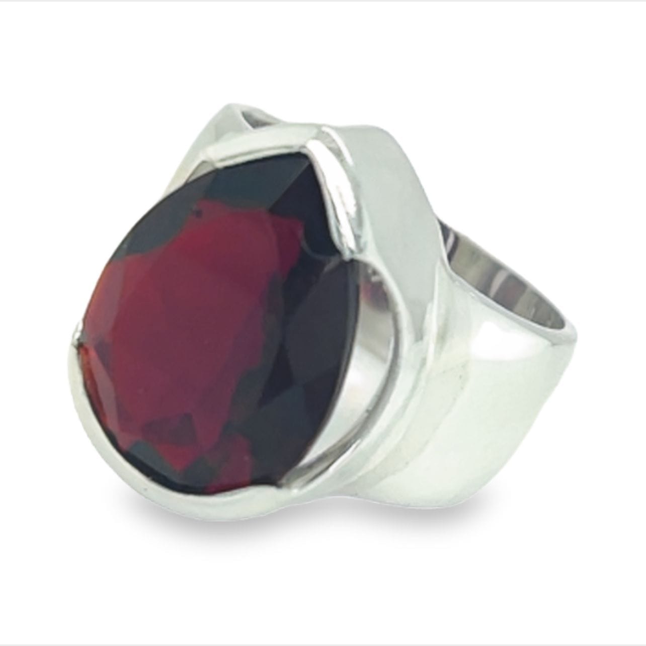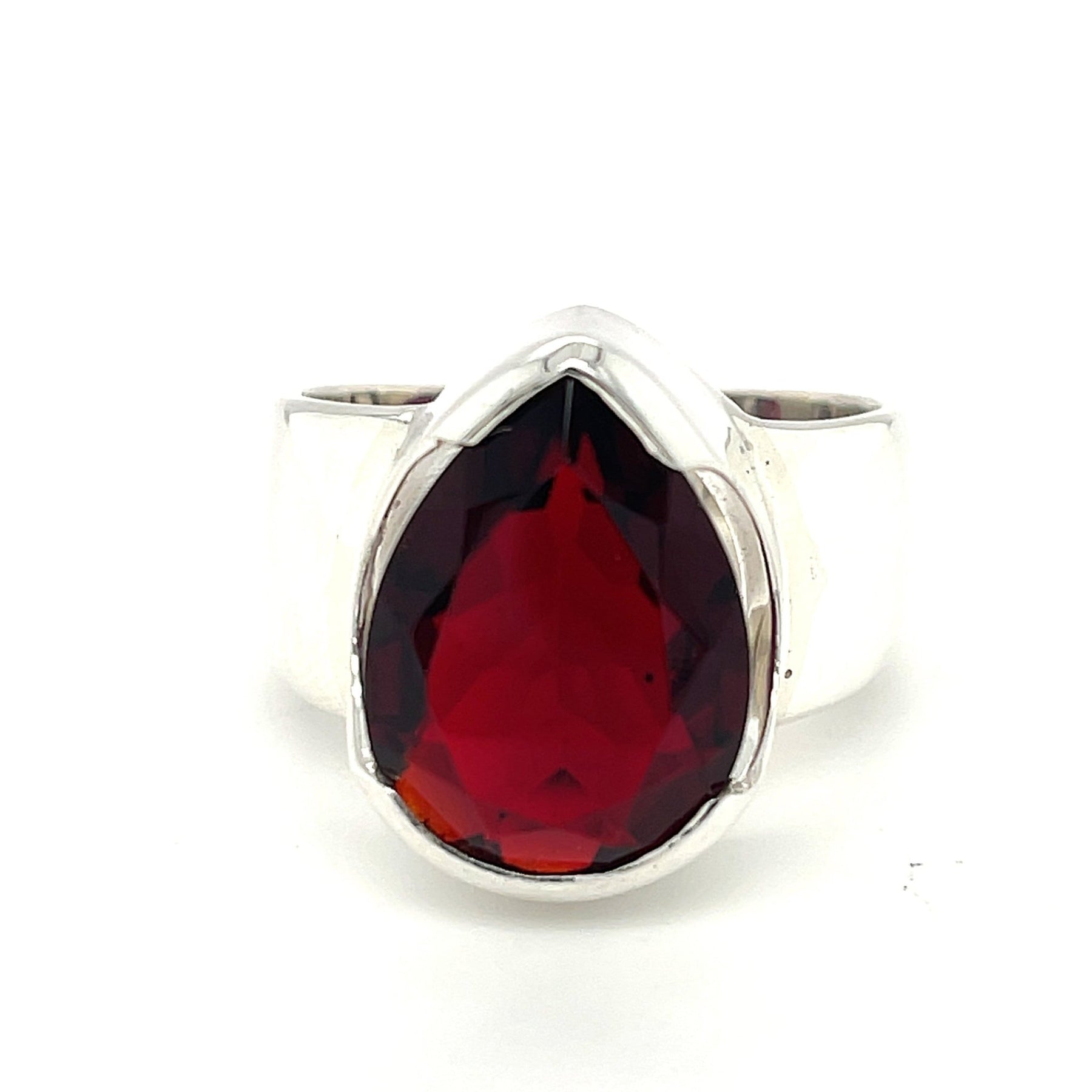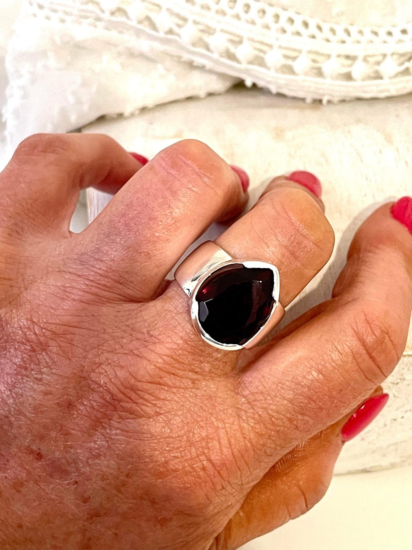 The stunning deep blood red of this large garnet teardrop ring will definitely have you mesmerized from the start. This amazing ring looks absolutely stunning on any hand and will match pretty much any striking, bold outfit you may decide to wear or add a bit of bold to a 'sensible' outfit.