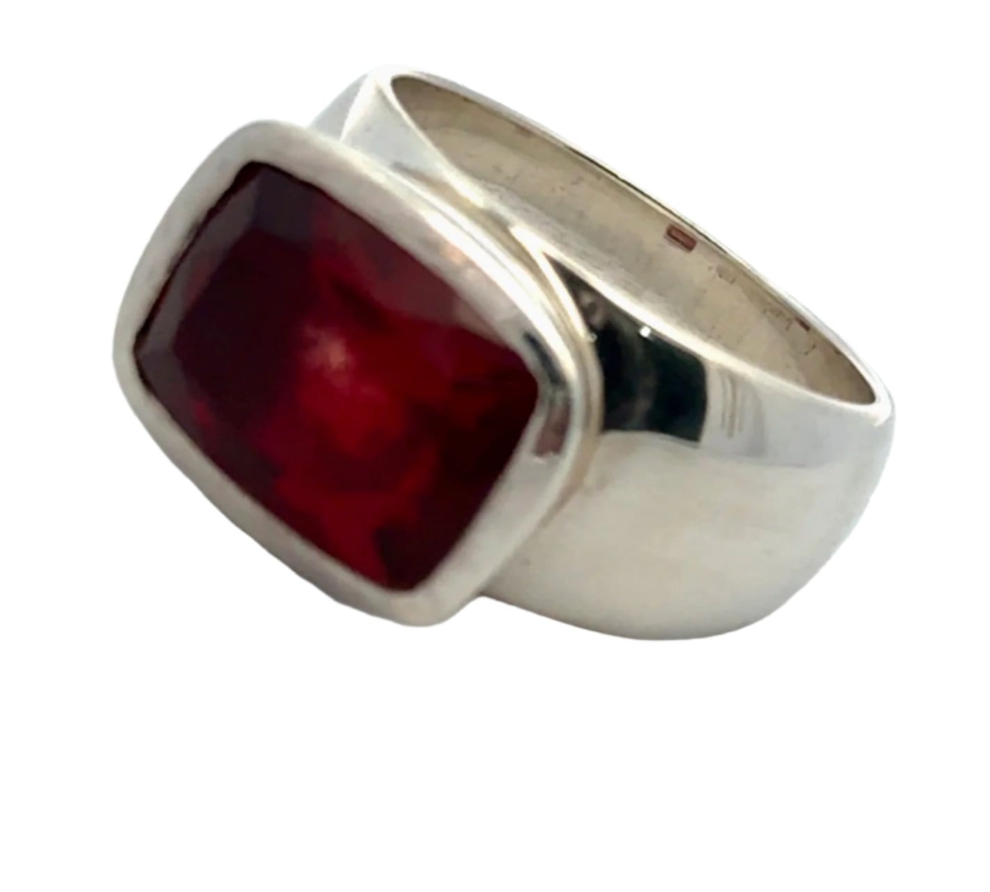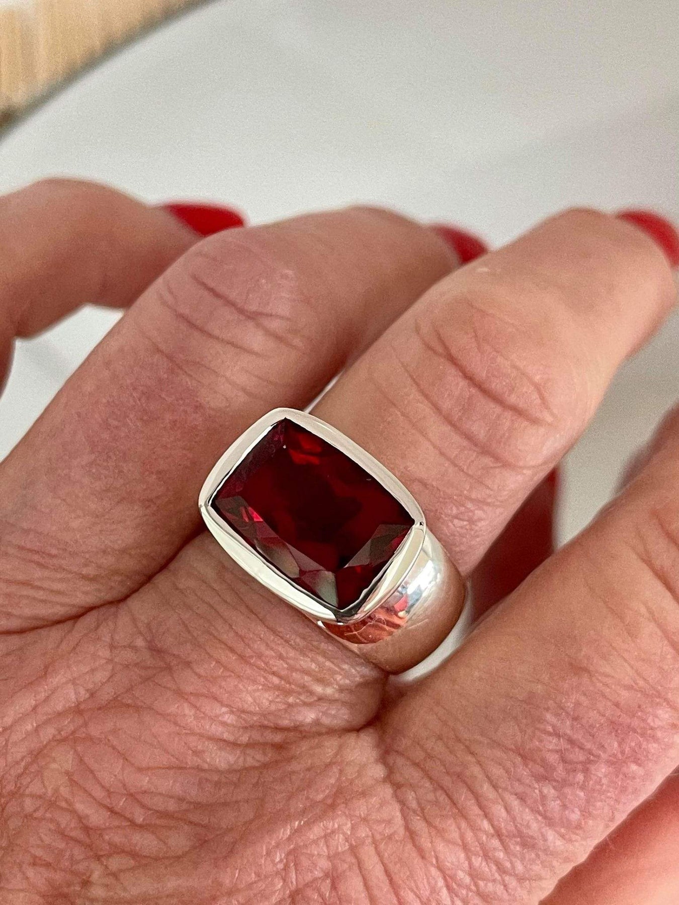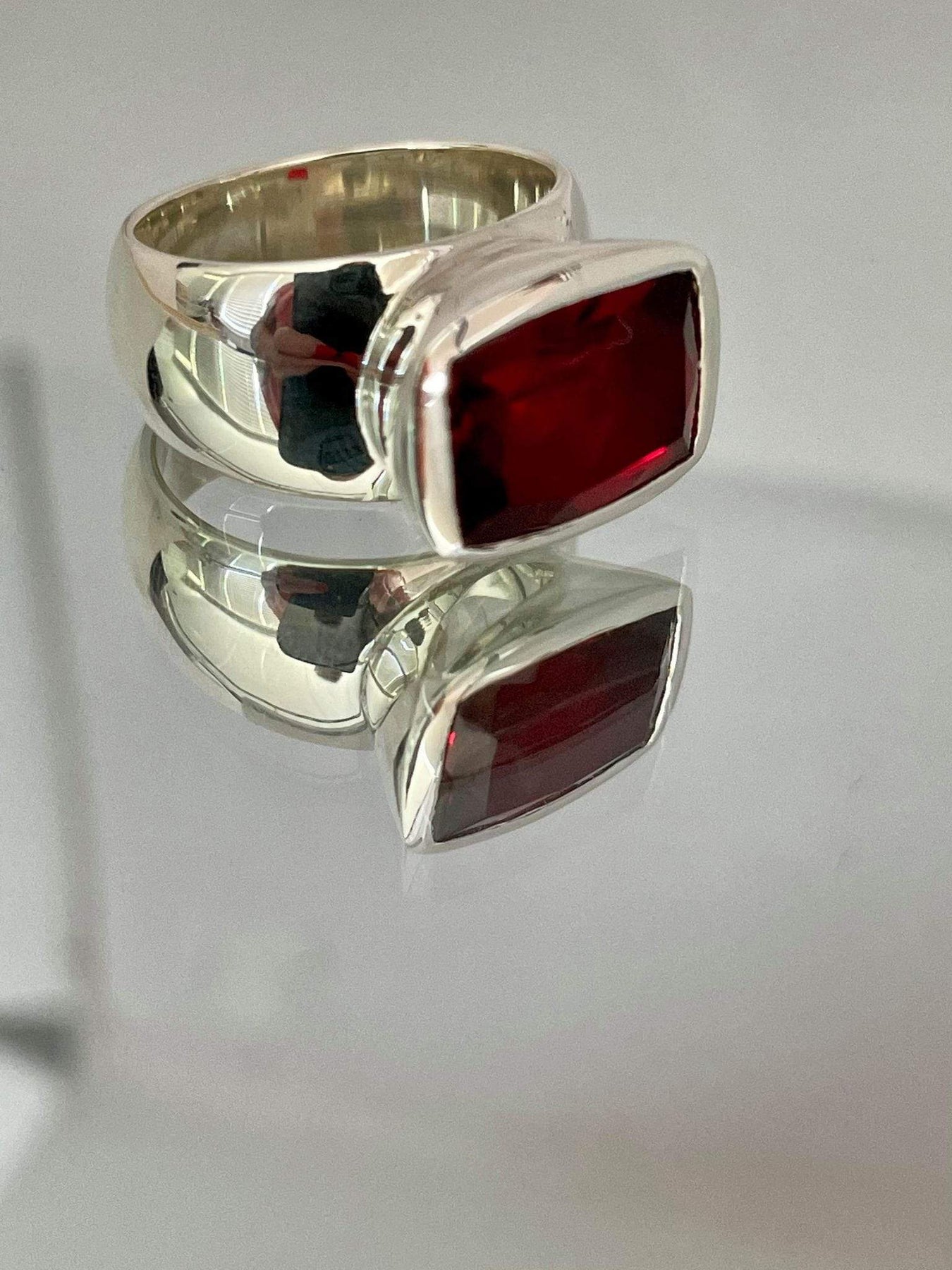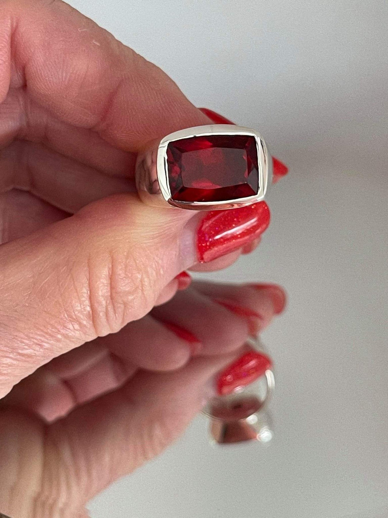 Glorious garnet, facet cut and set in a sterling silver bezel setting.