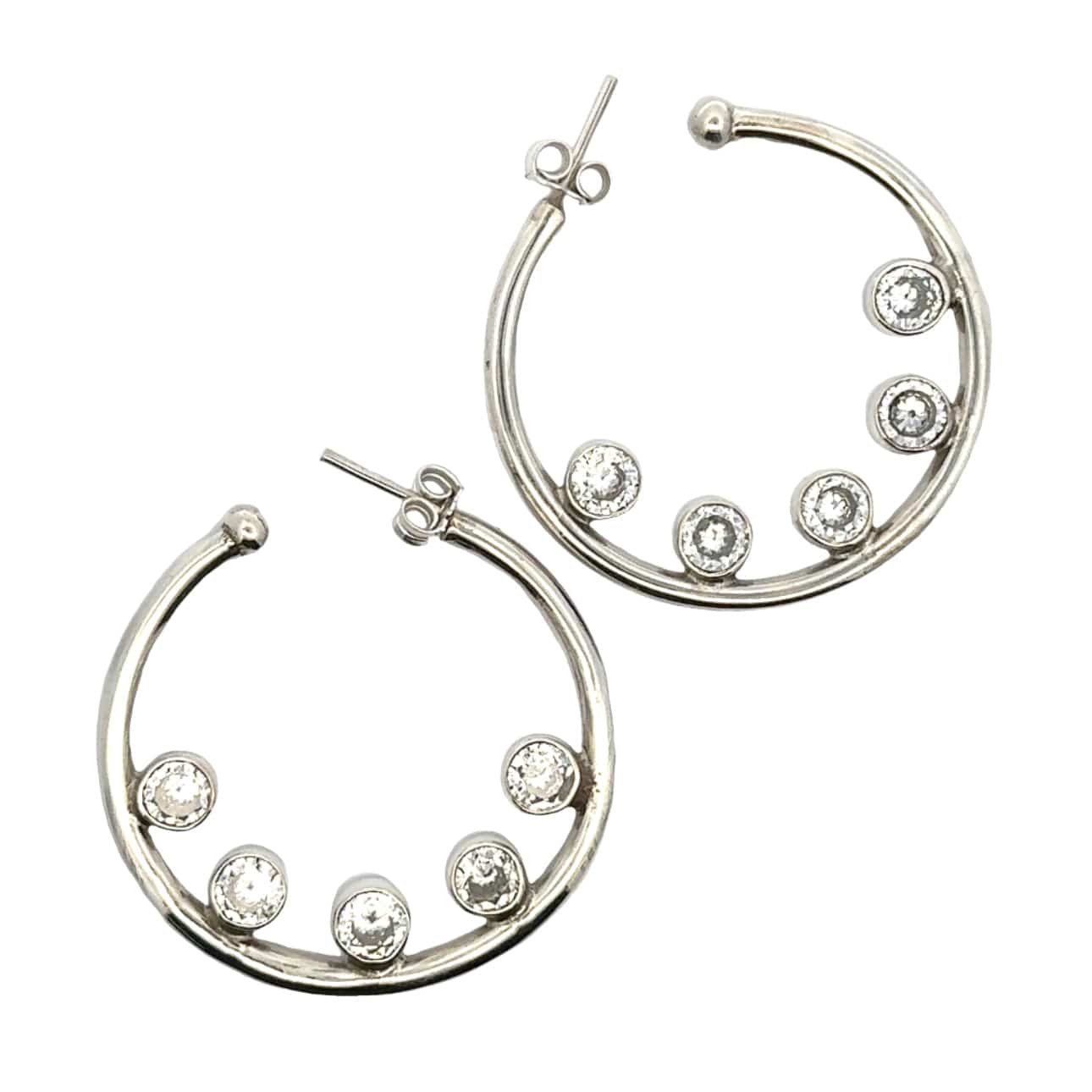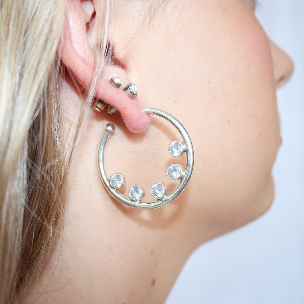 Handcrafted with high quality Sterling Silver there are five crystals bezel set and seemingly floating on each hoop.