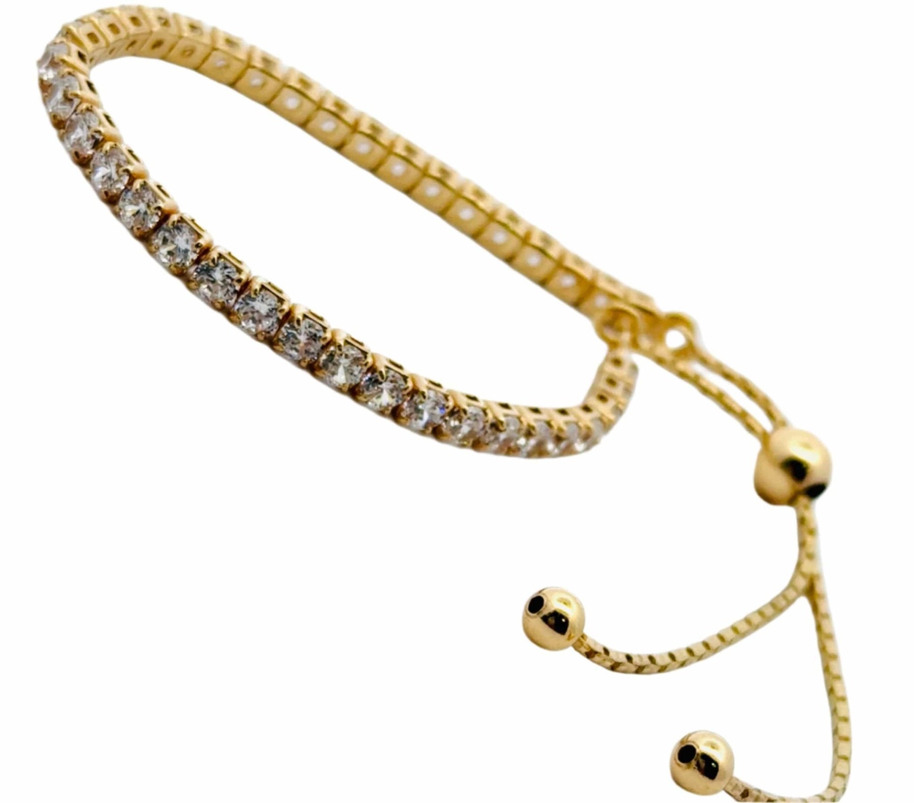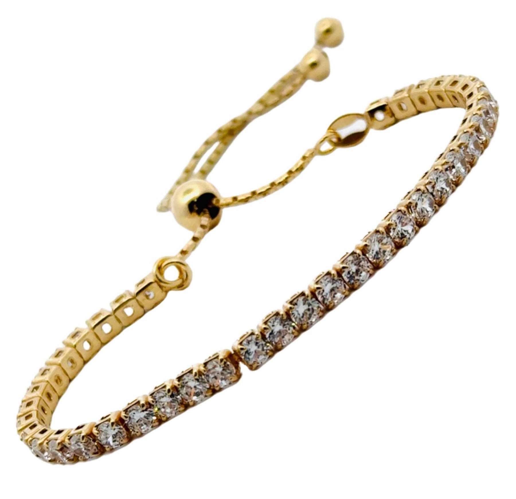 Our sparkly Tennis Bracelet is a stunning piece that effortlessly combines elegance and ease. Crafted with shiny gold vermeil, this bracelet features 40 -MM facet cut clear crystal stones that shimmer and sparkle with every movement, making it the perfect accessory for any occasion.