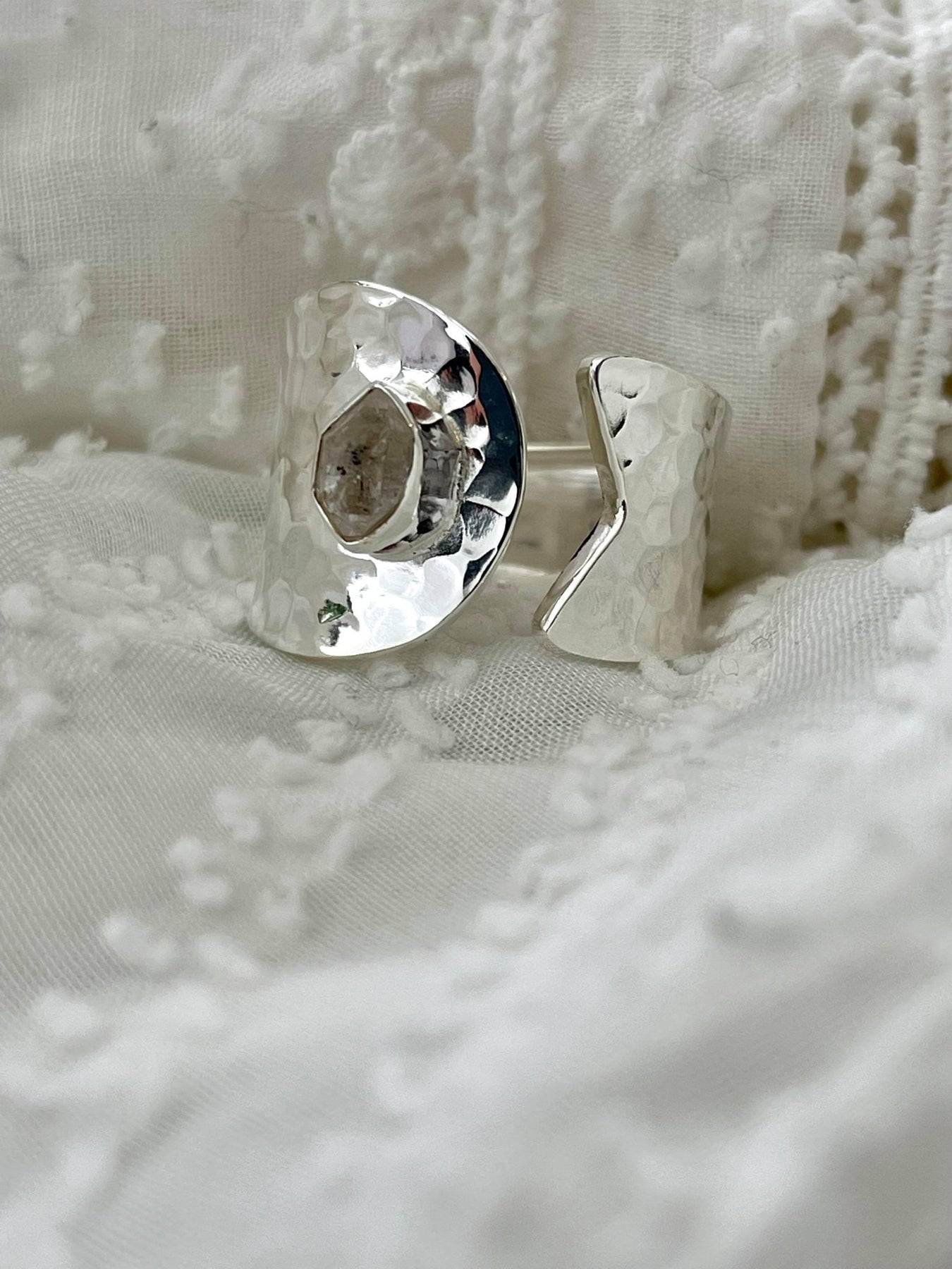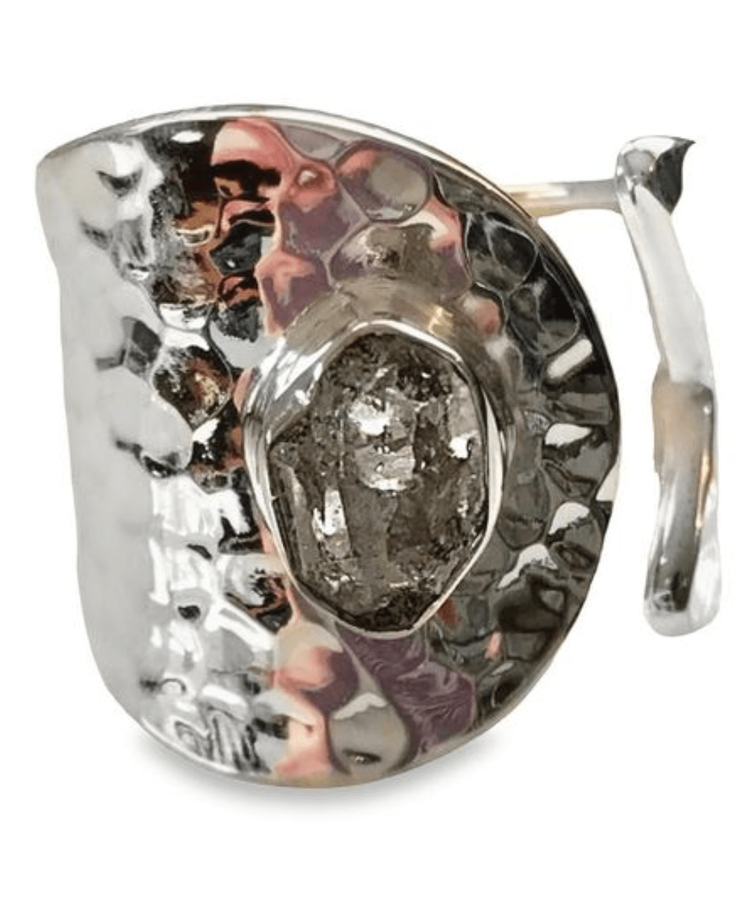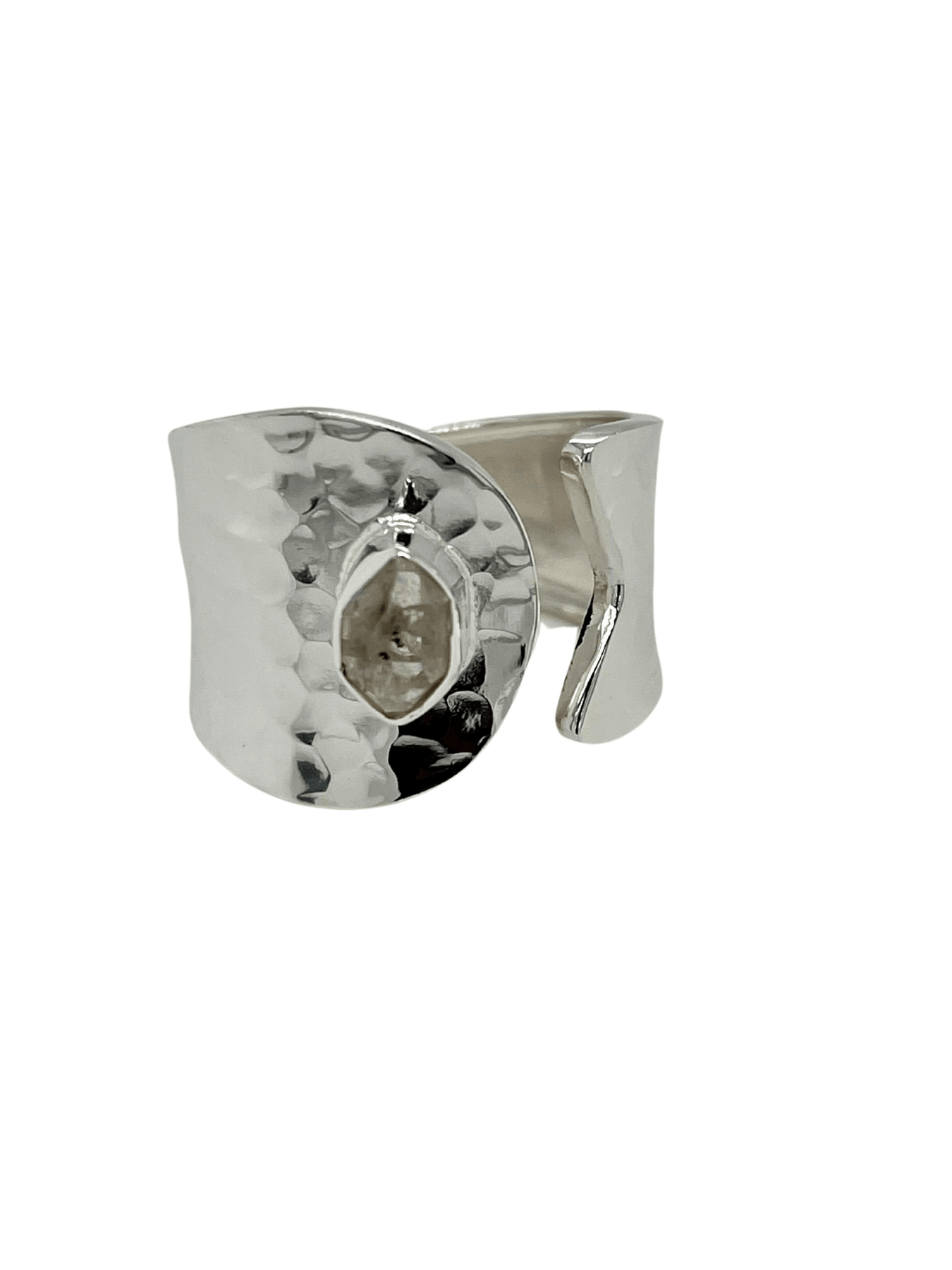 With a 22 MM wide hand-hammered sterling silver band, this Herkimer Diamond ring makes quite a statement. If you like something unique and original with a boho edge, then this one has your name on it.
