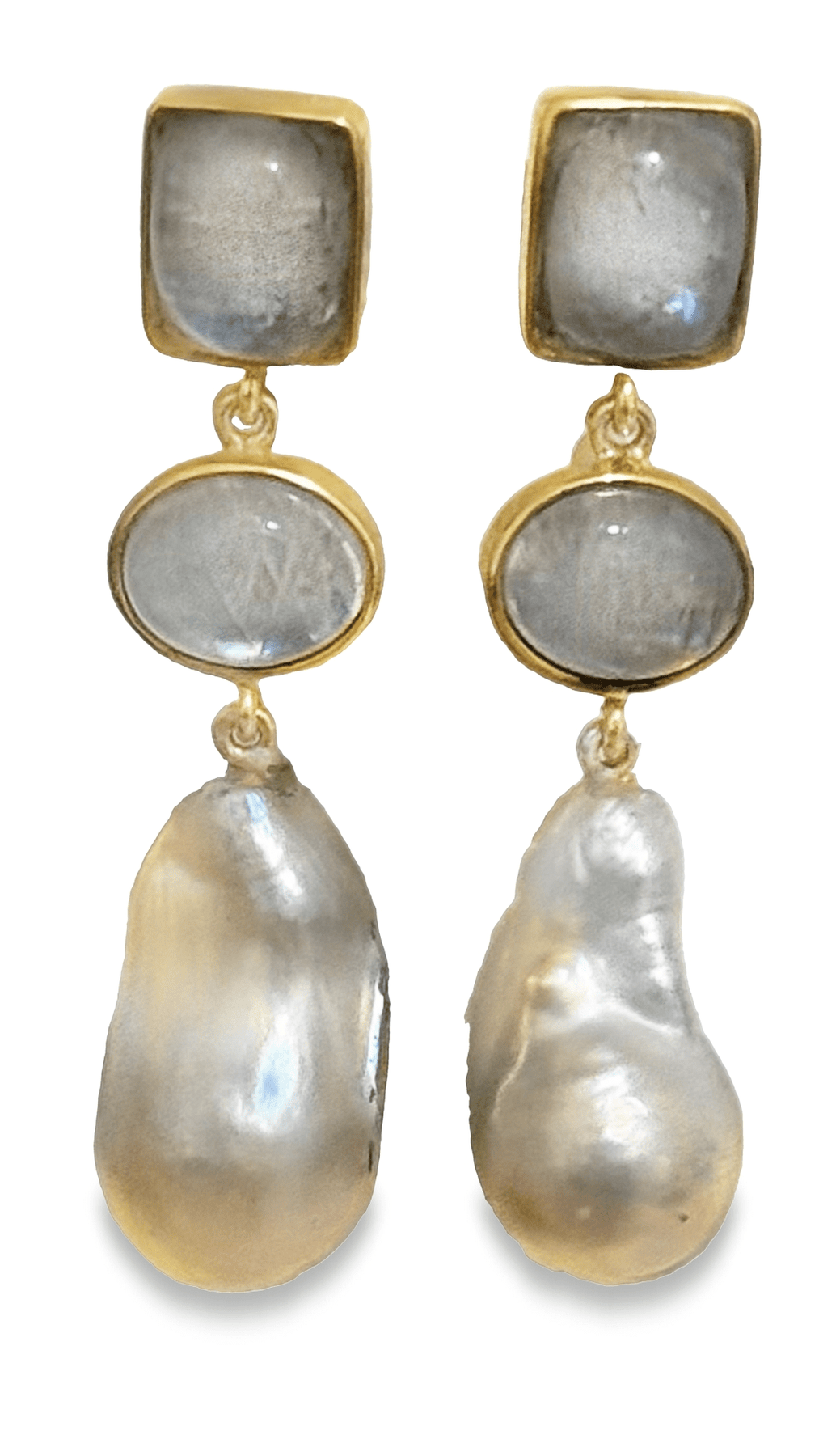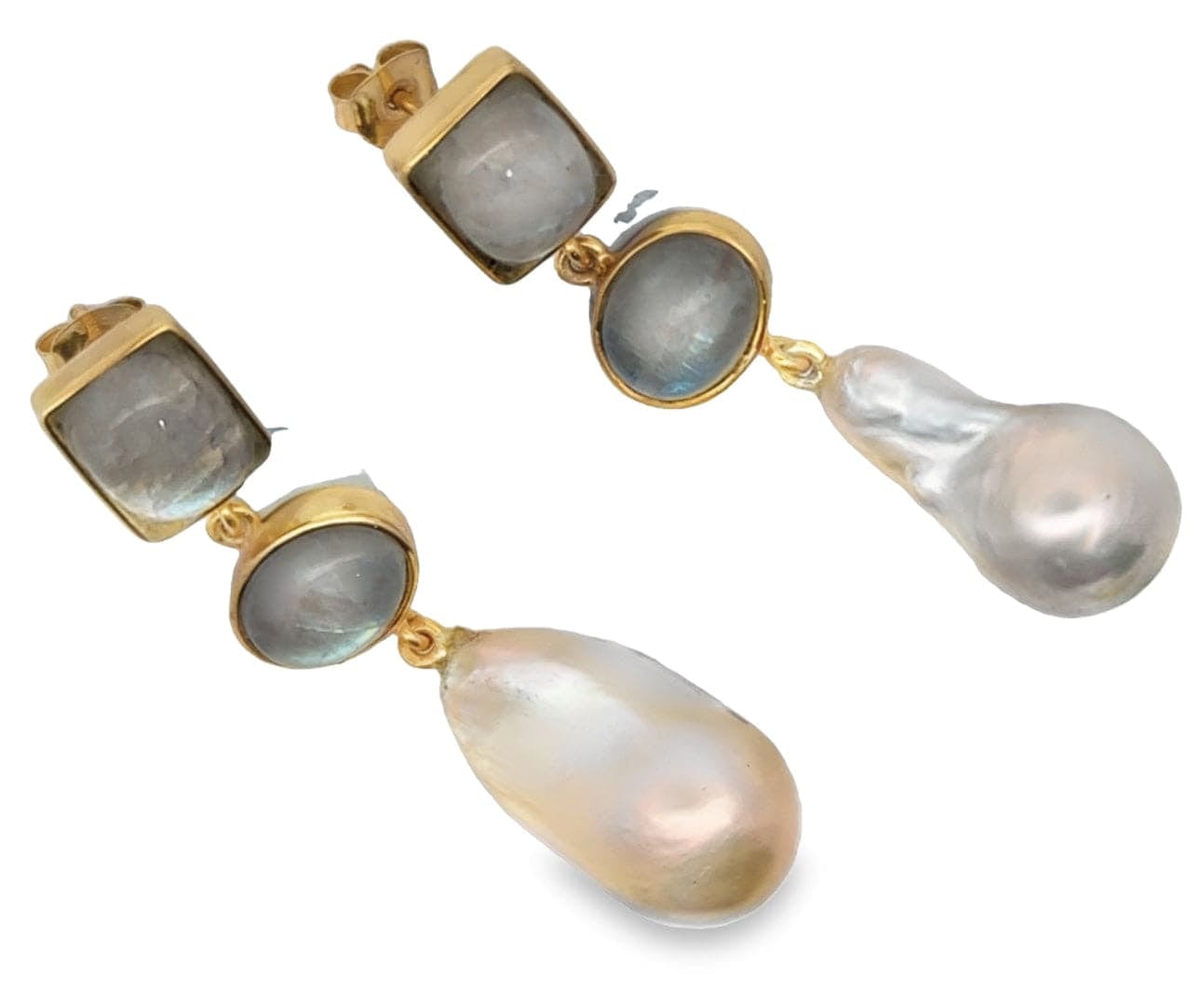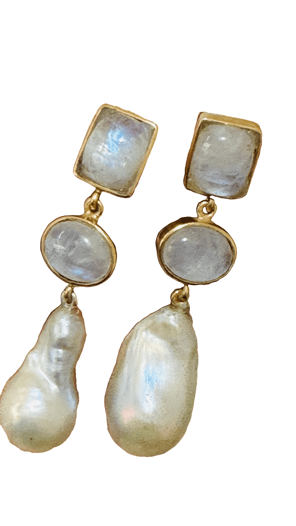 These stunning earrings are designed to enhance your personal bridal style with their captivating beauty. Featuring shimmering moonstones with alluring blue flashes and large baroque pearls, they make a bold statement that is sure to turn heads. The reflection of the glowing moonstones and unique baroque pearls will make your eyes shine, adding extra for your photos.