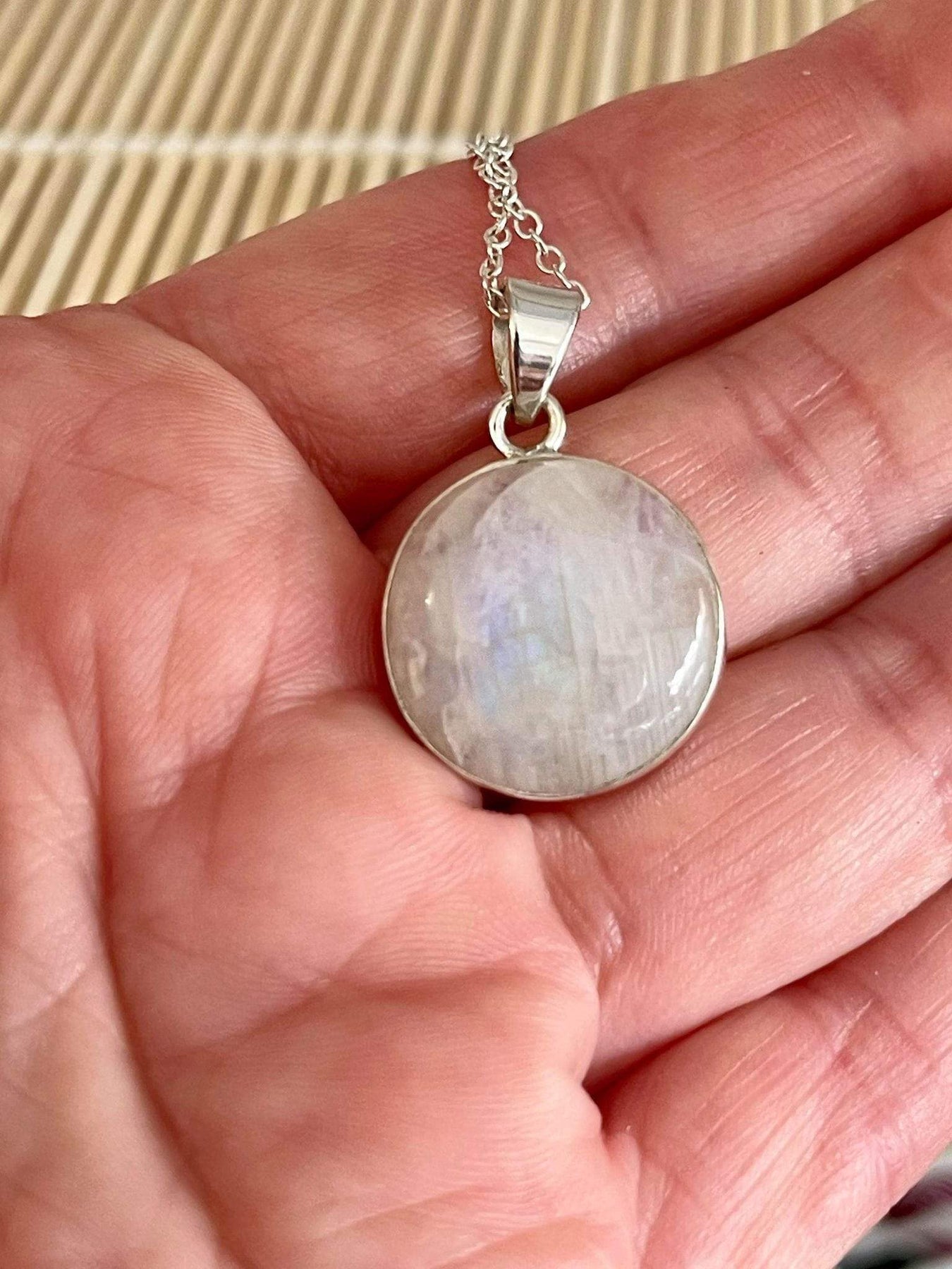 It comes complete with a complimentary chain, ready to adorn your neck with its graceful presence. Embrace the energy of completion and the soothing allure of Moonstone with our Full Moon Pendant, a symbol of beauty and inner harmony.