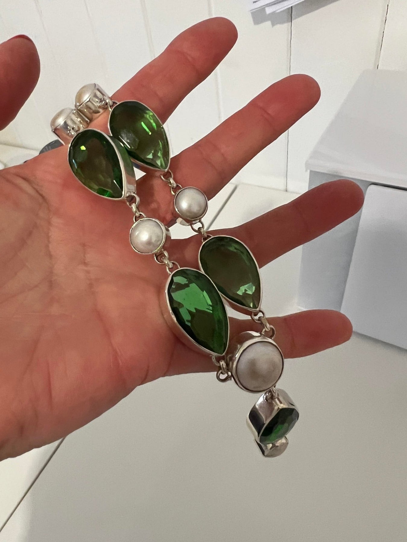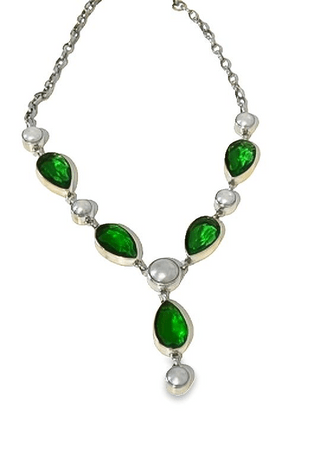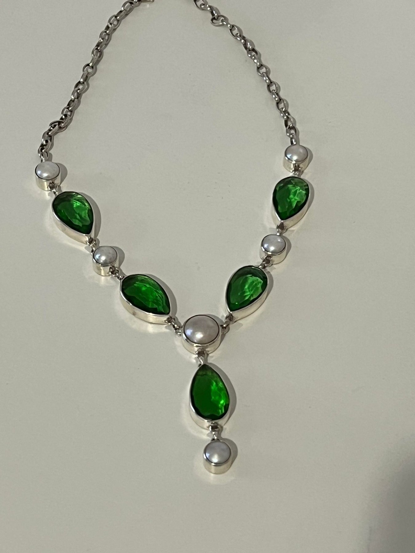 The five teardrop shaped green obsidian 28 x 16 mm gems are flanked by a central large 15mm pearl, forming a Y that sits alluringly at your throat. Each green obsidian is accented by smaller 10 MM diameter pearls, and set in high quality sterling silver. The effect is immediate and complete, with the shimmer of the pearl, the sparkle of the obsidian and the sheen of the silver balancing perfectly.