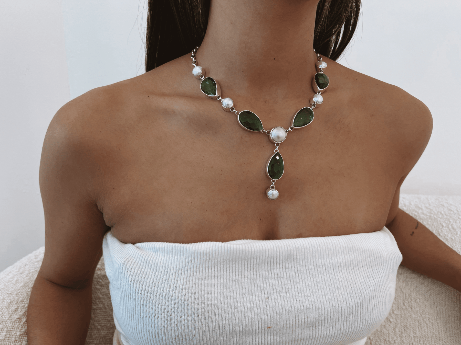 This powerfully beautiful necklace is an absolute show stopper! Featuring five green obsidian stones alongside stunning pearls, this is a statement piece that reflects feminine power, natural mystique and earthy radiance.