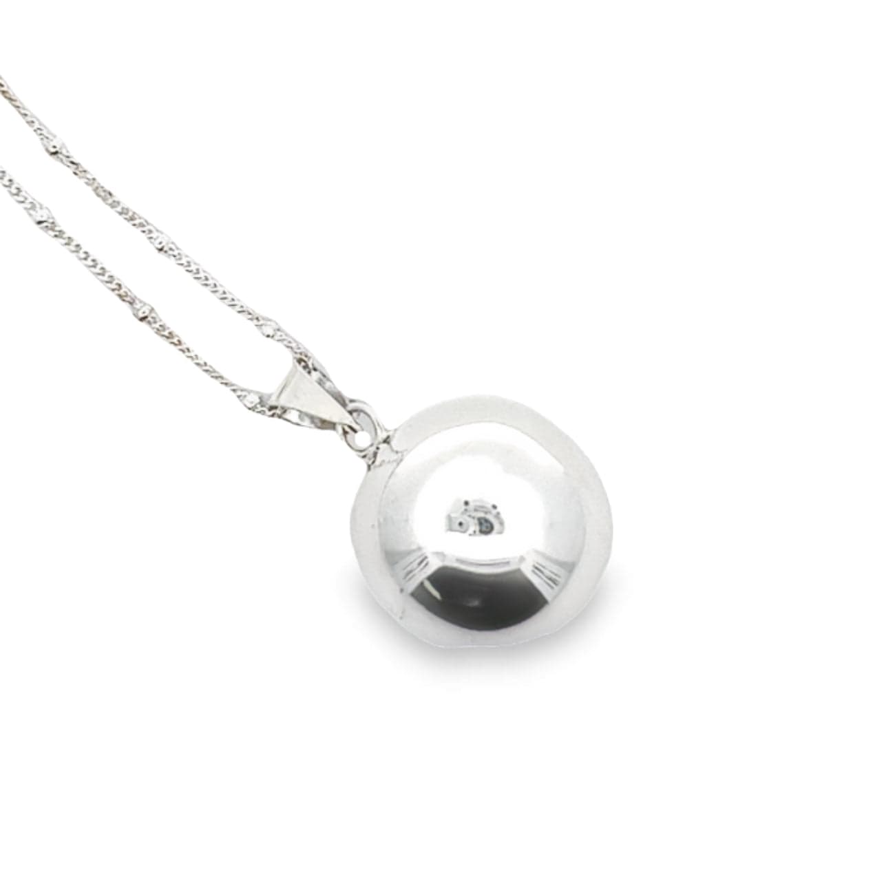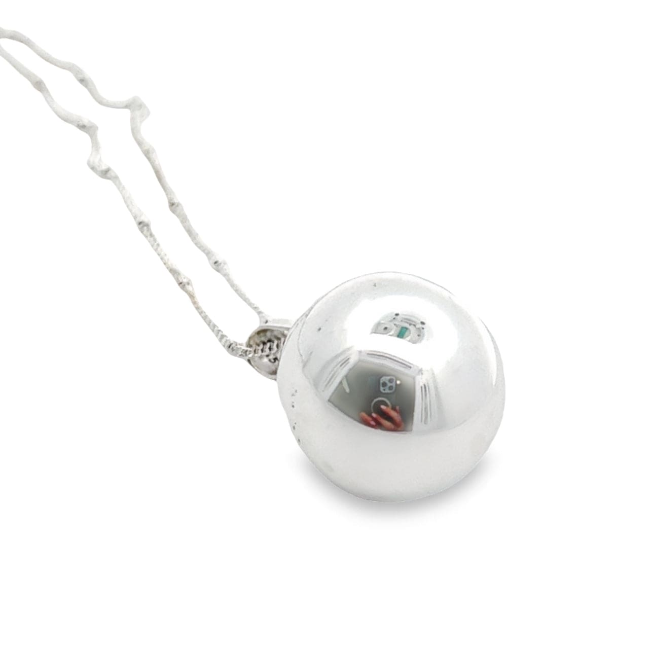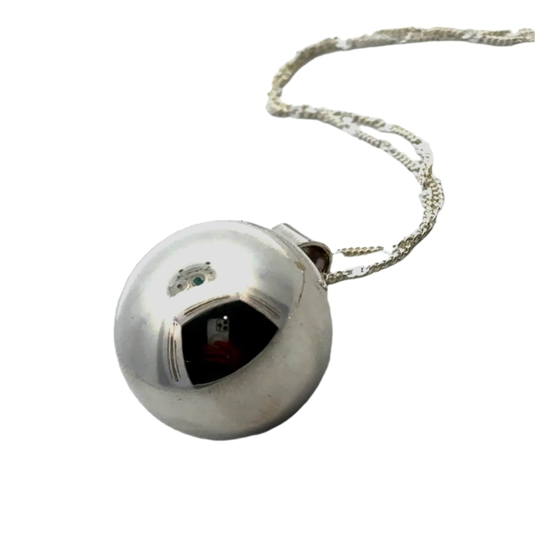 A harmony ball pendant is also sometimes called an angel caller pendant and contains a gentle bell that emits a soft chime as you move, not unlike windchimes, subtle but audible.