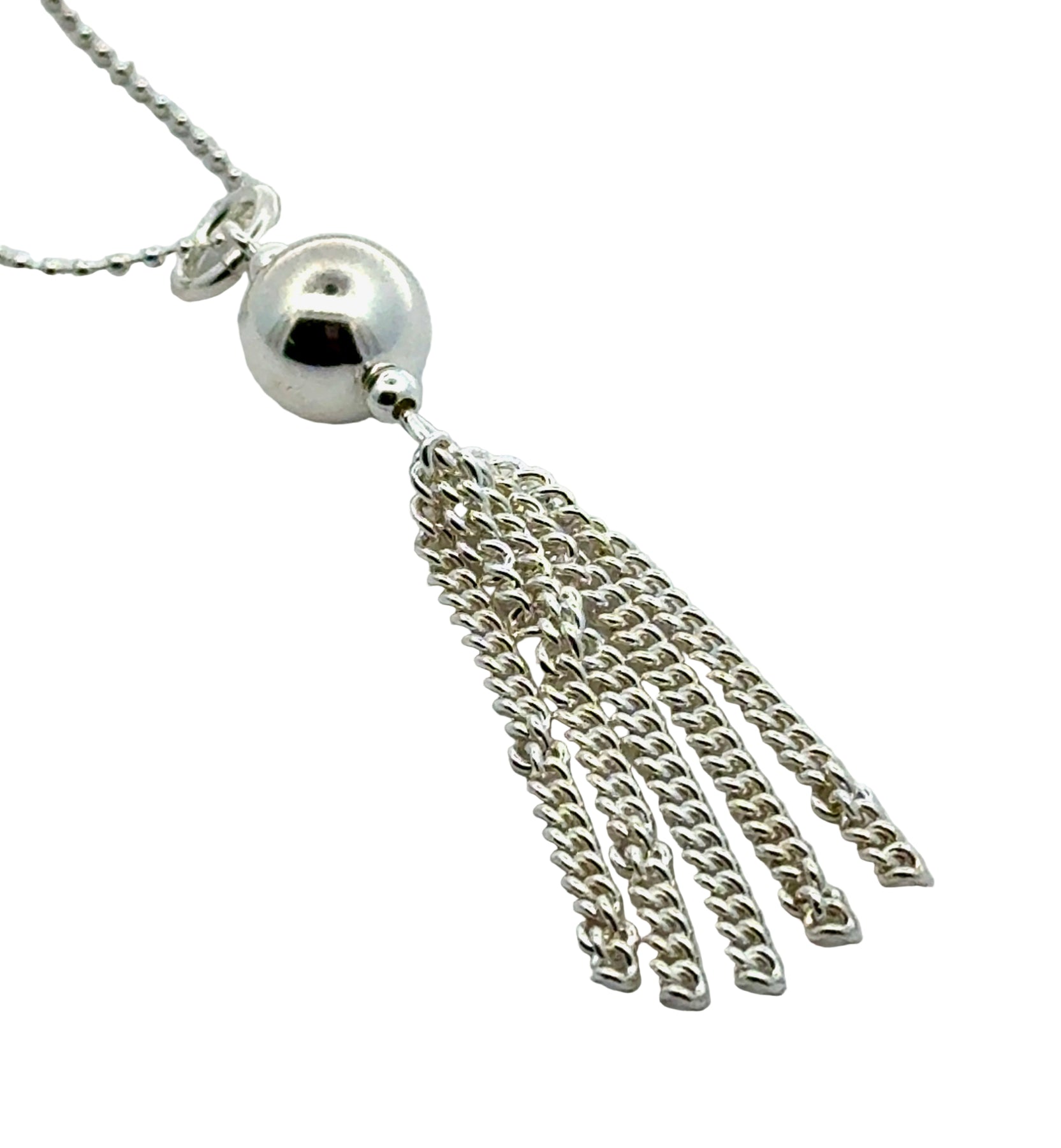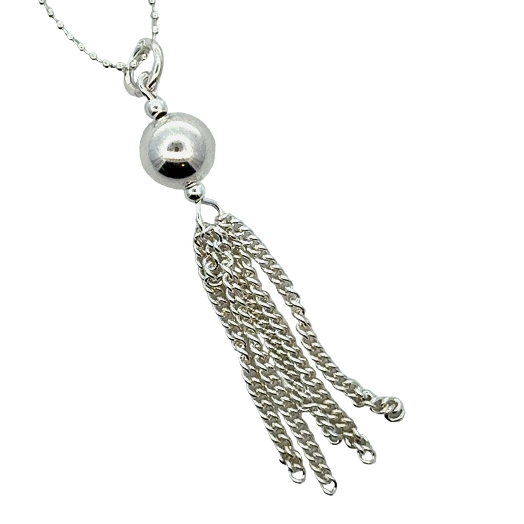 Silver necklace with a round pendant and chain tassel on a light gray background