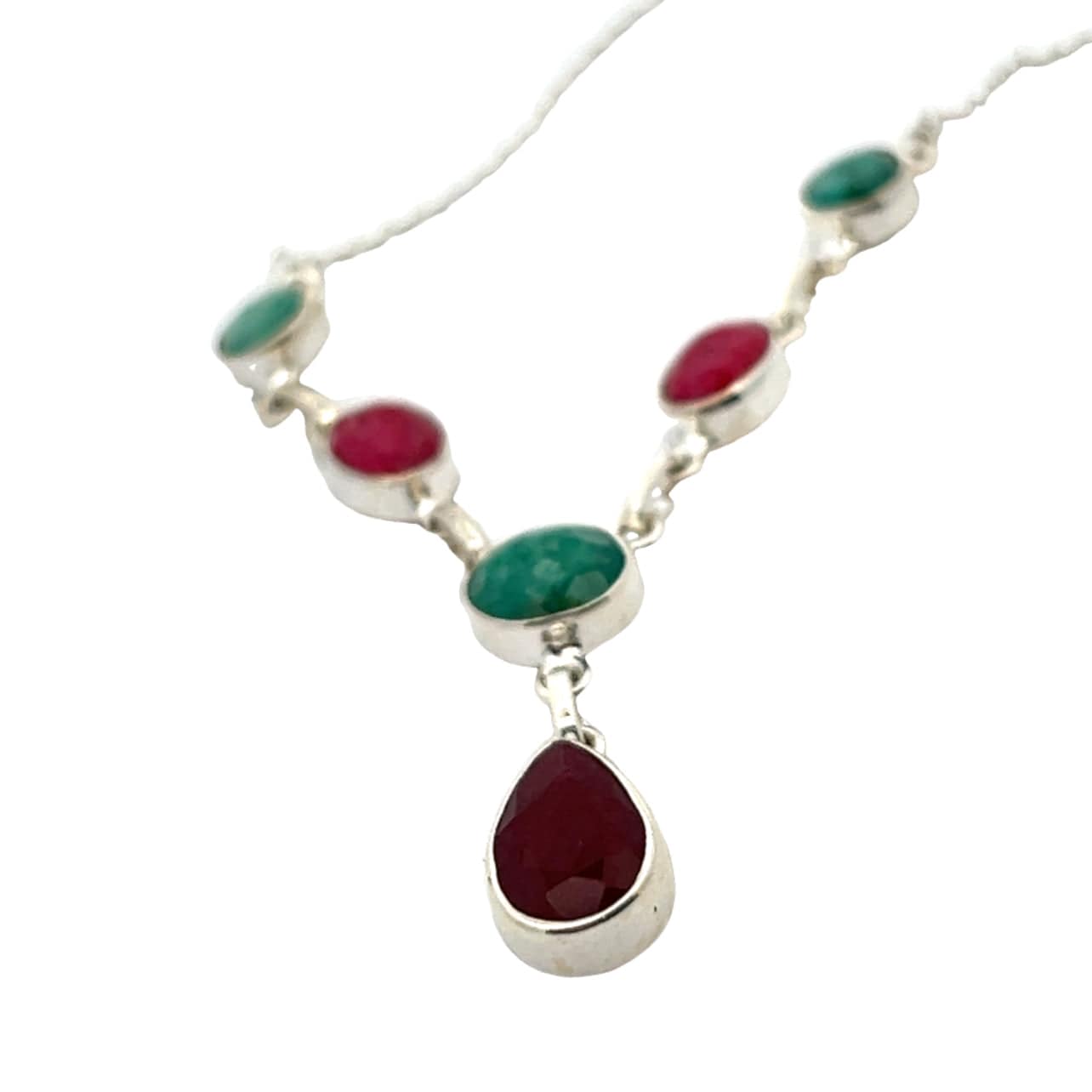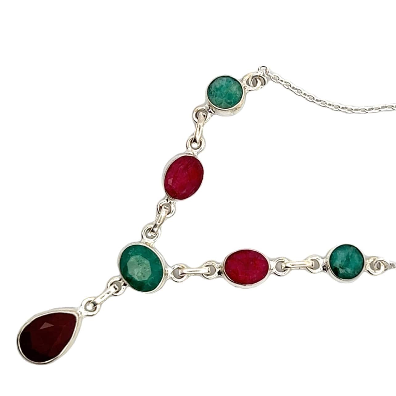 This gorgeous necklace features three natural emeralds and three natural rubies, set in a gleaming sterling silver chain. Each stone glimmers brightly, contrasting beautifully with the crisp sheen of sterling silver. The classic Y-shape of the chain is deeply flattering and highly eye-catching, so prepare to be complimented.