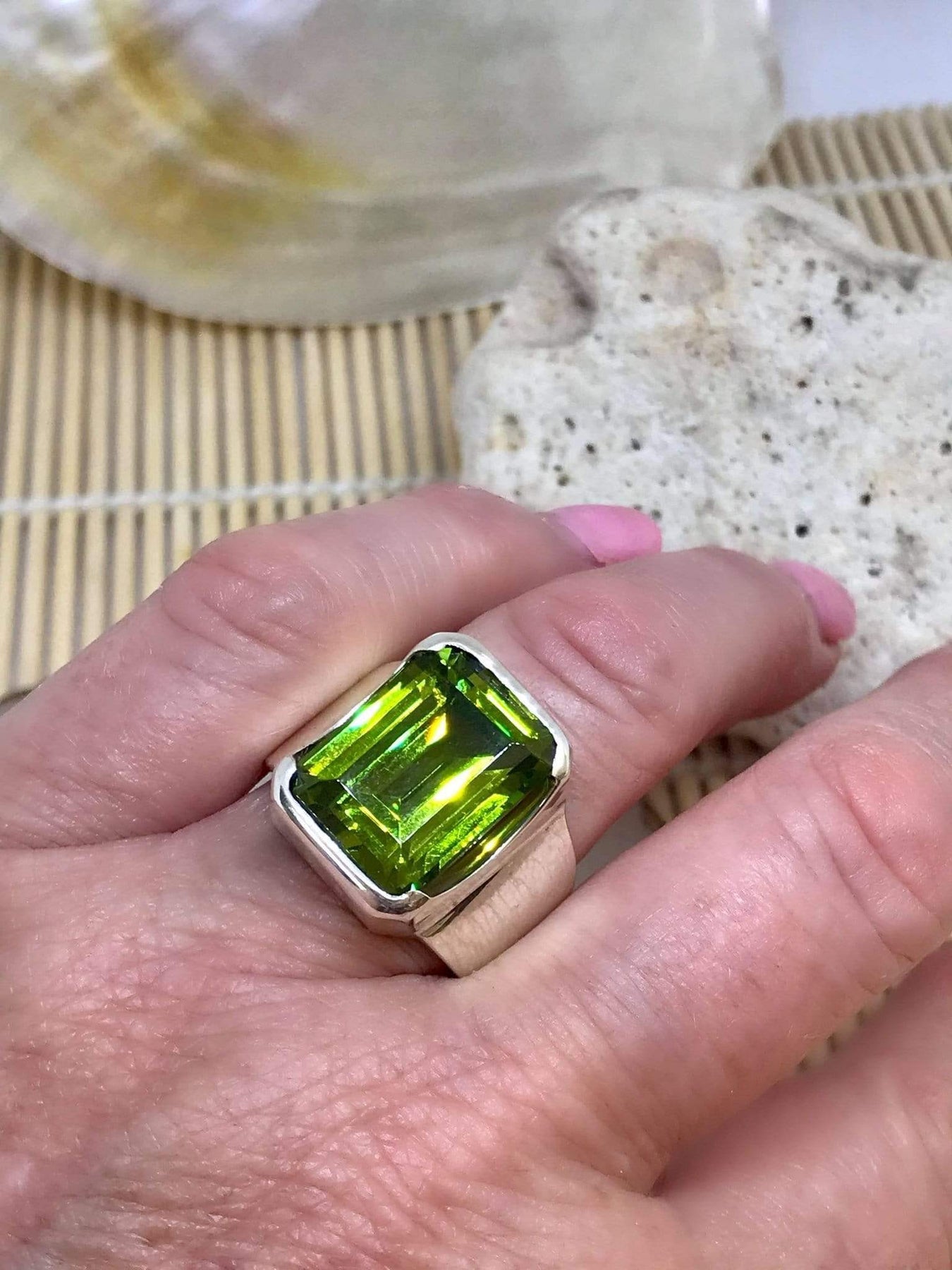 I am so in love with this ring that I don't even want to take it off at bedtime! Beautifully crafted with high quality materials. The lovely green peridot crystal reflects multiple hues depending on the light. Have received many compliments - not that I really care as it's purely for my enjoyment. Couldn't help myself and ordered some peridot earrings as well!!