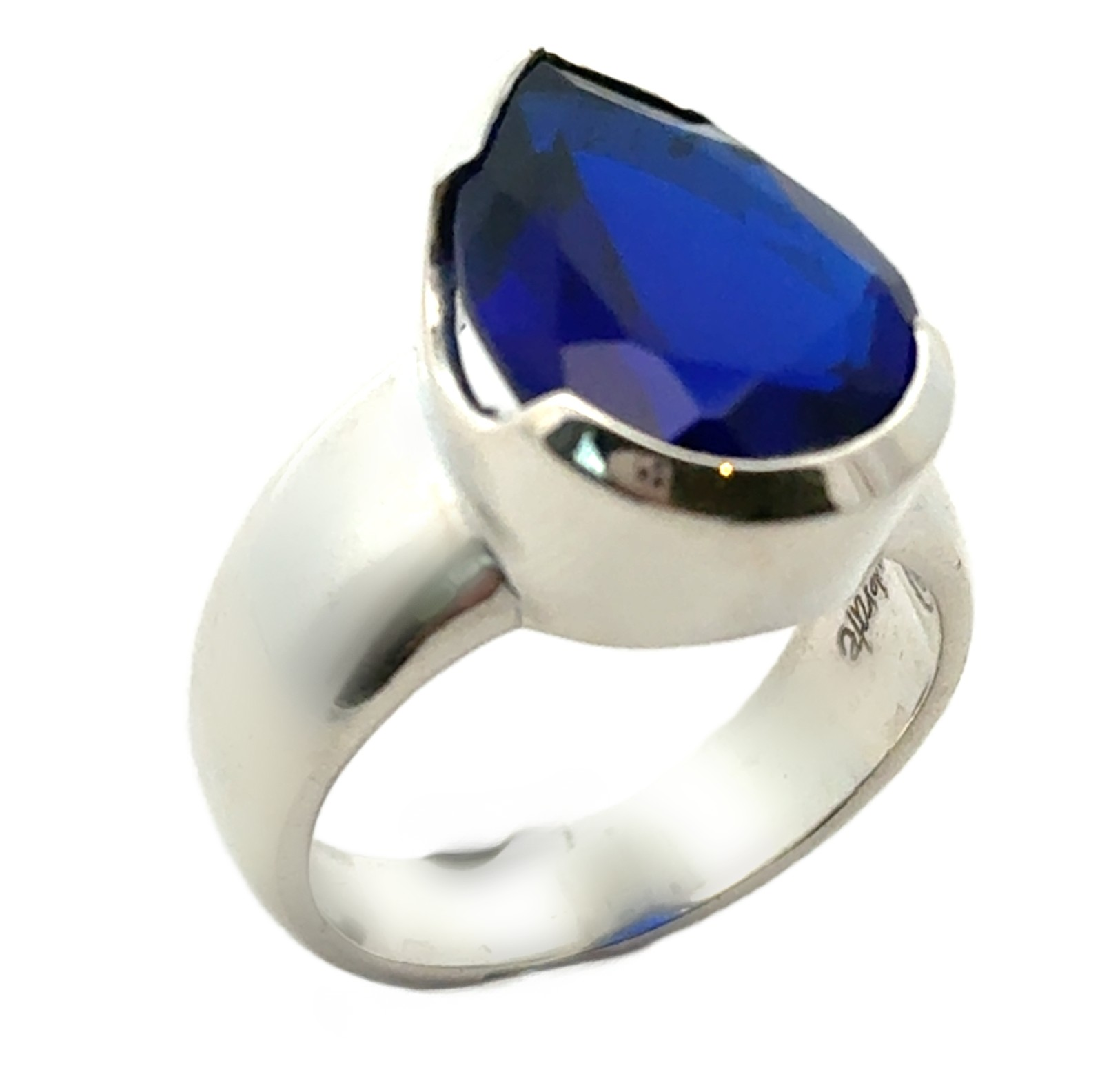 The contrast of sapphire blue against shiny sterling silver is striking and yet classic and the teardrop-shaped stone is a classic cut. This ring has all eyes on her for her classic colour and style which is magnified by her size. This is perfect for the woman who's classic and also a bit 'out there'.