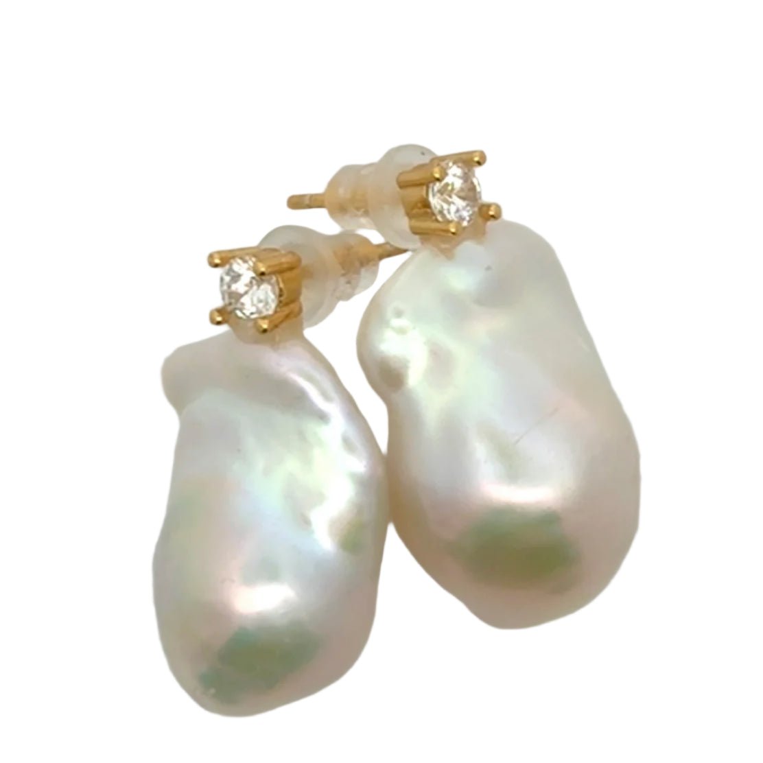 Our Boldly Baroque Sparkle Studs in gleaming 18K gold vermeil feature large, luminous Baroque pearls and a brilliant 4x4mm white topaz for just the right hit of sparkle.