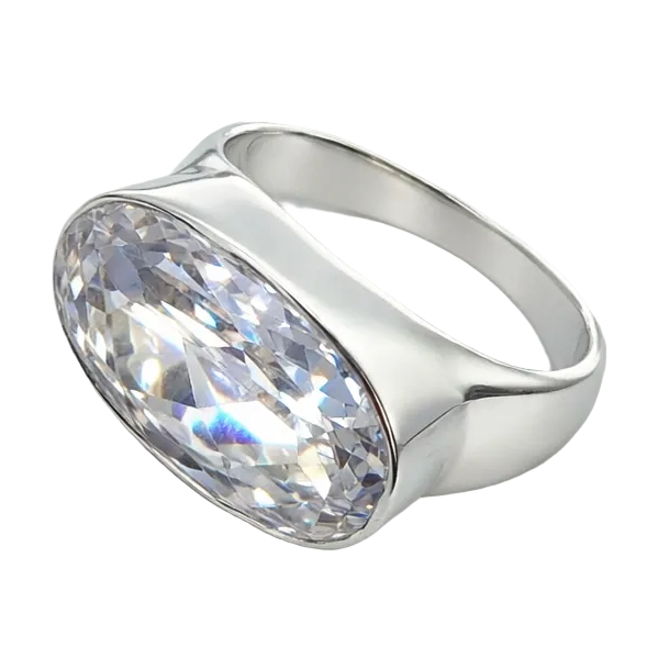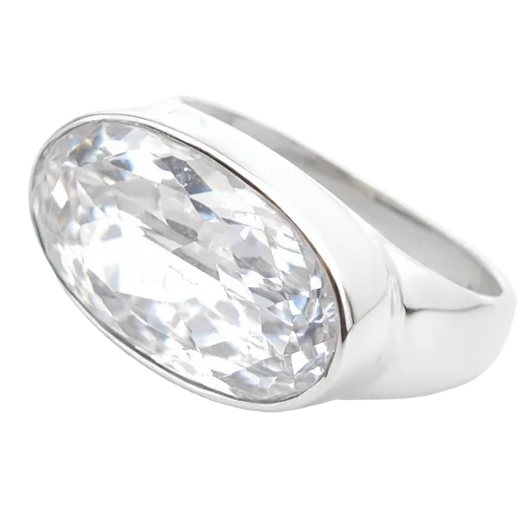 Framed in a smooth, sculptural sterling silver bezel, the stone forms a generous 12 x 20 mm face, giving the ring striking impact on the hand. The high polish sterling silver enhances the crystal’s natural transparency, creating a modern, minimalist contrast between cool silver and pure light.