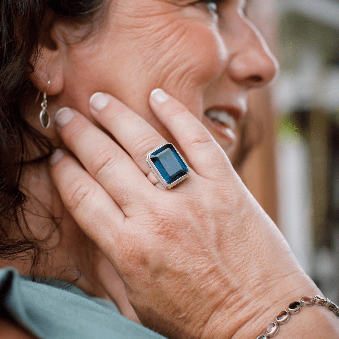 Featuring a striking 13 x 18 mm London Blue Topaz, this oversized gemstone is known for its deep oceanic hue and powerful energy. Surrounded by 24 glossy black onyx stones in a handcrafted halo setting, it’s a modern twist on timeless elegance.