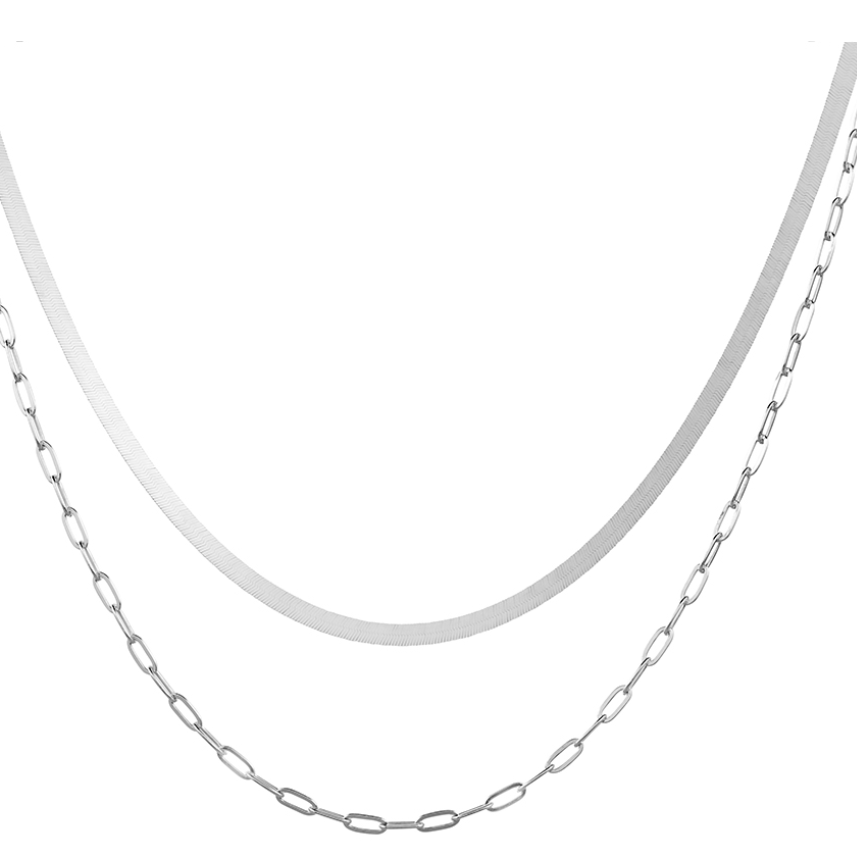 A sterling silver double chain necklace featuring a flat magic chain and open cable chain, designed for easy layering and everyday wear.