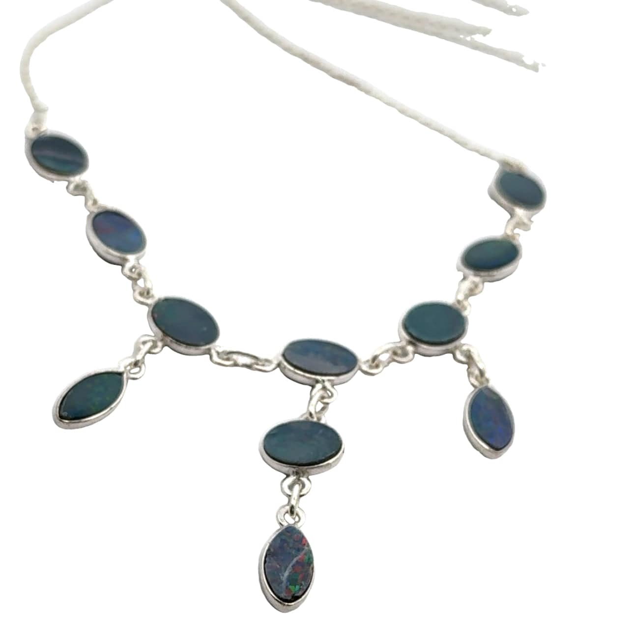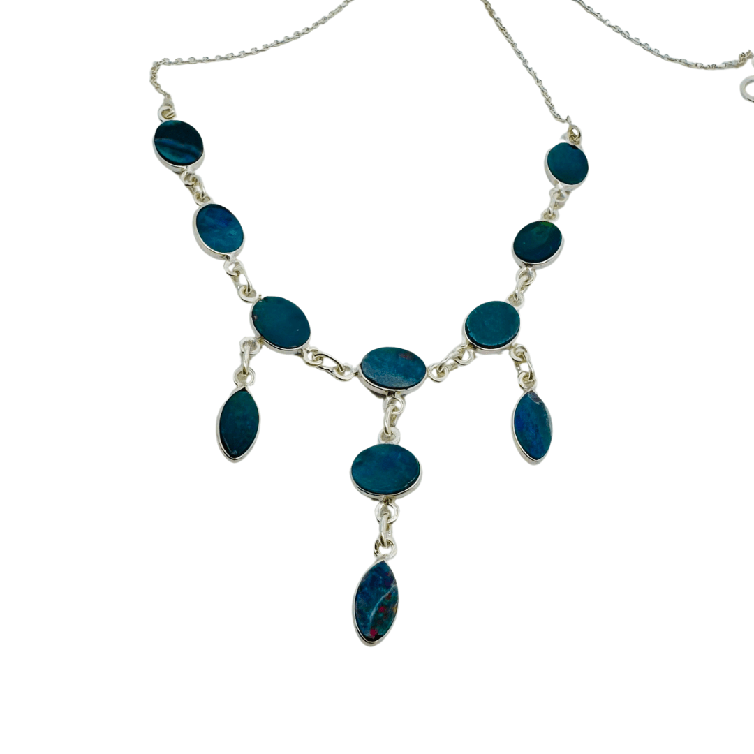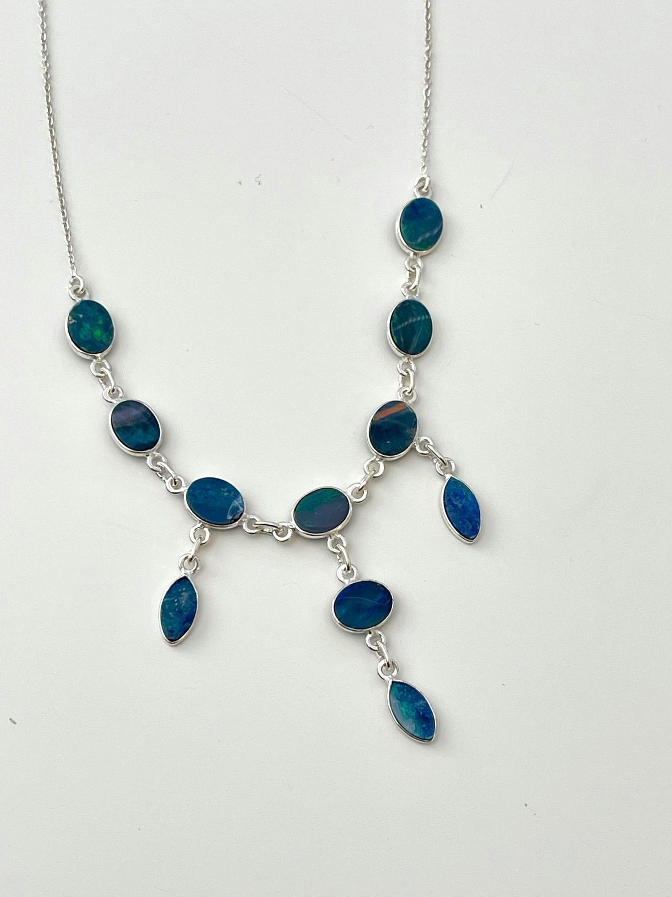 The colour display in opals is mesmerising, they seem to dance and shimmer and shine. This necklace is made with 11 glorious Australian Opal Doublets with sterling silver and it makes an elegant boho statement.