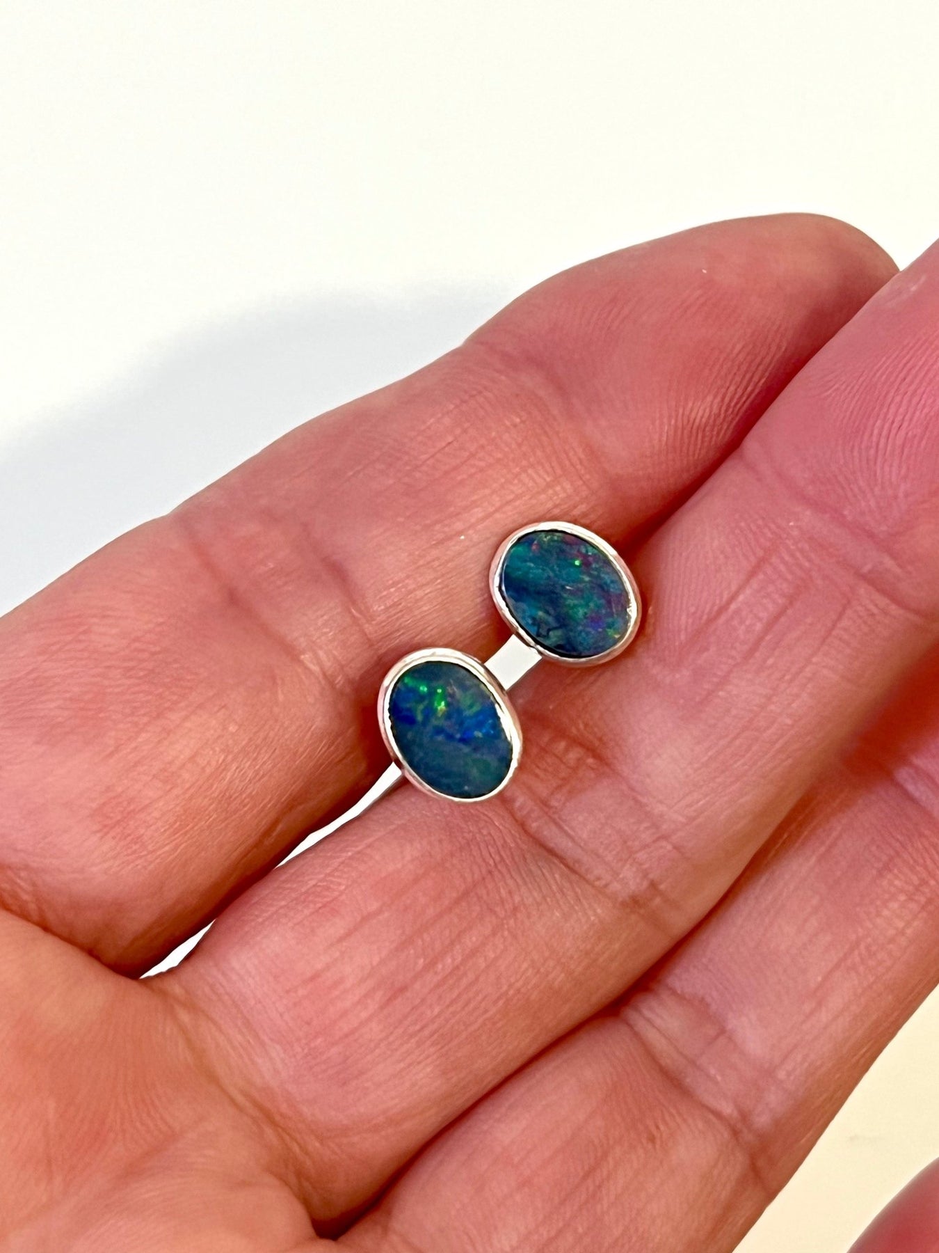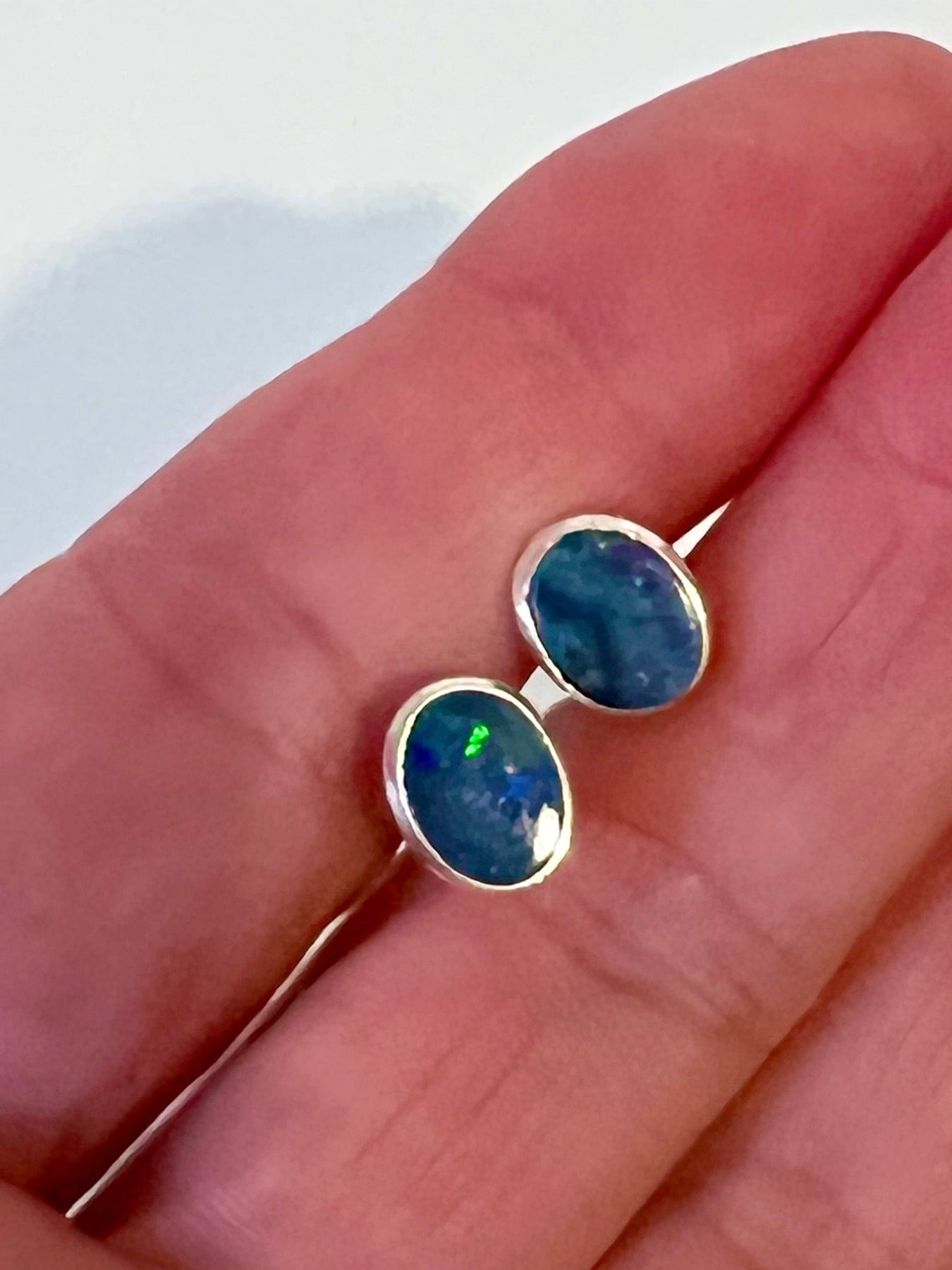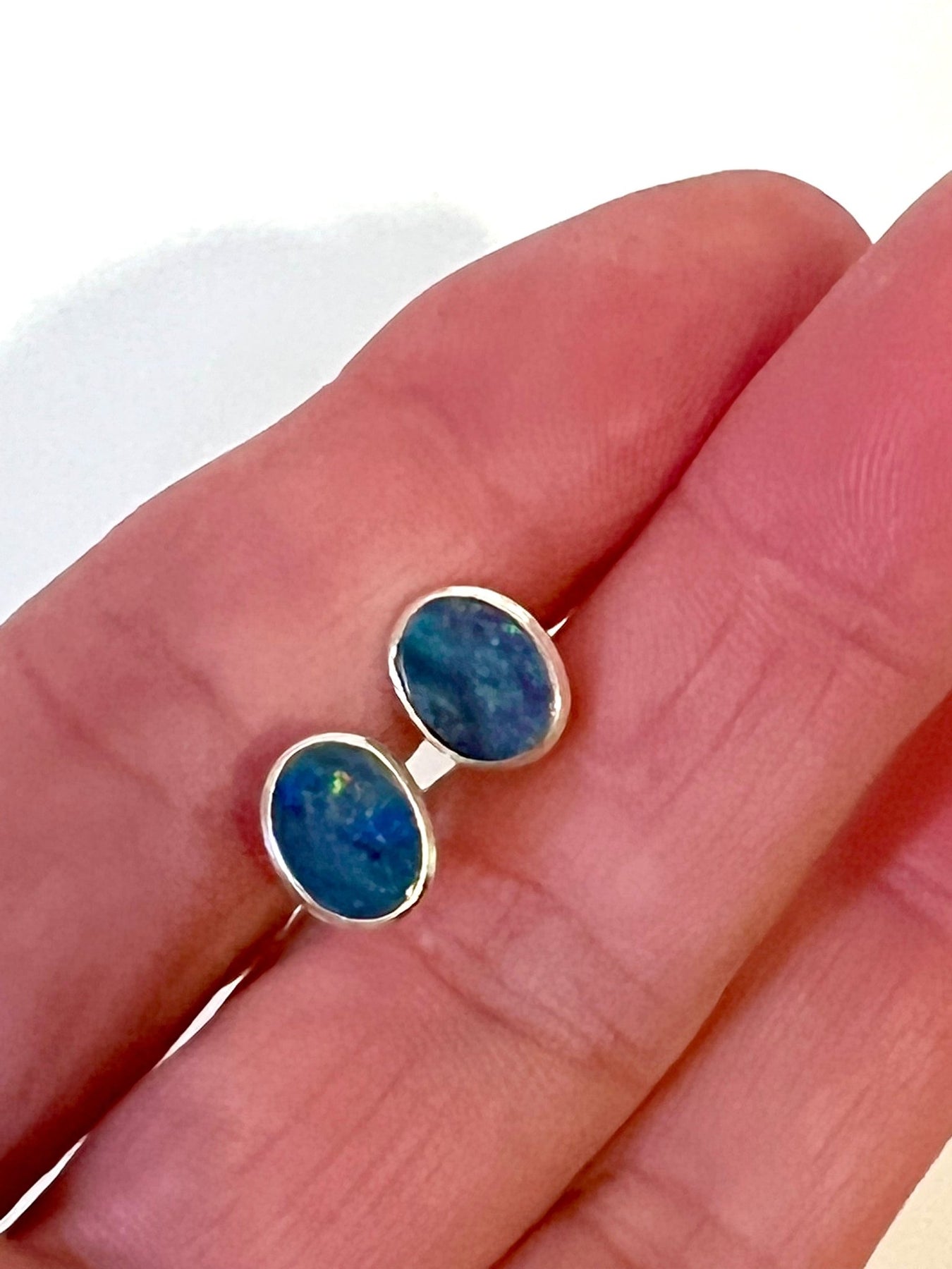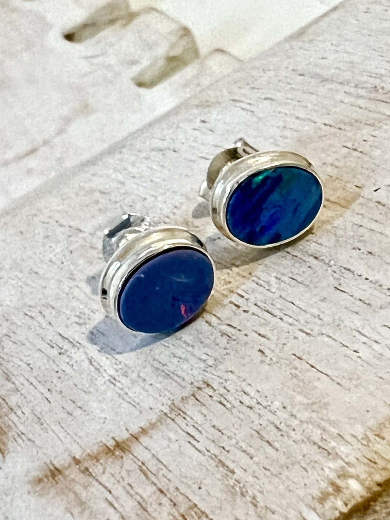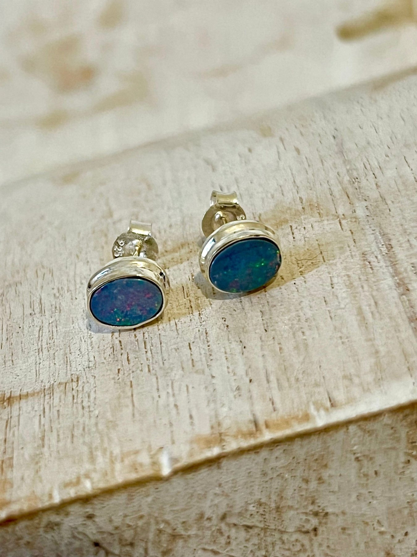 Simple studs with Australian Opals that twinkle with an array of colours in the blue. Each opal is unique and has its own colour play of luminescence shining through.