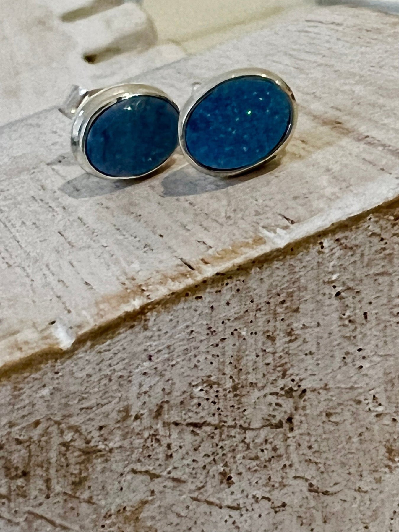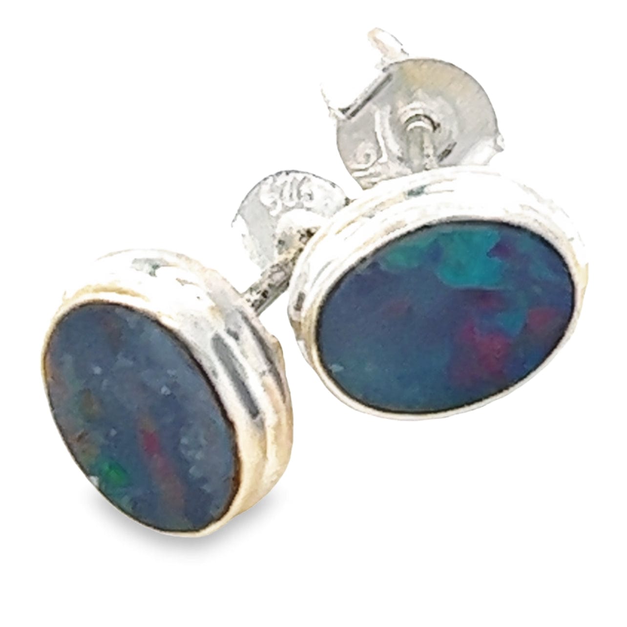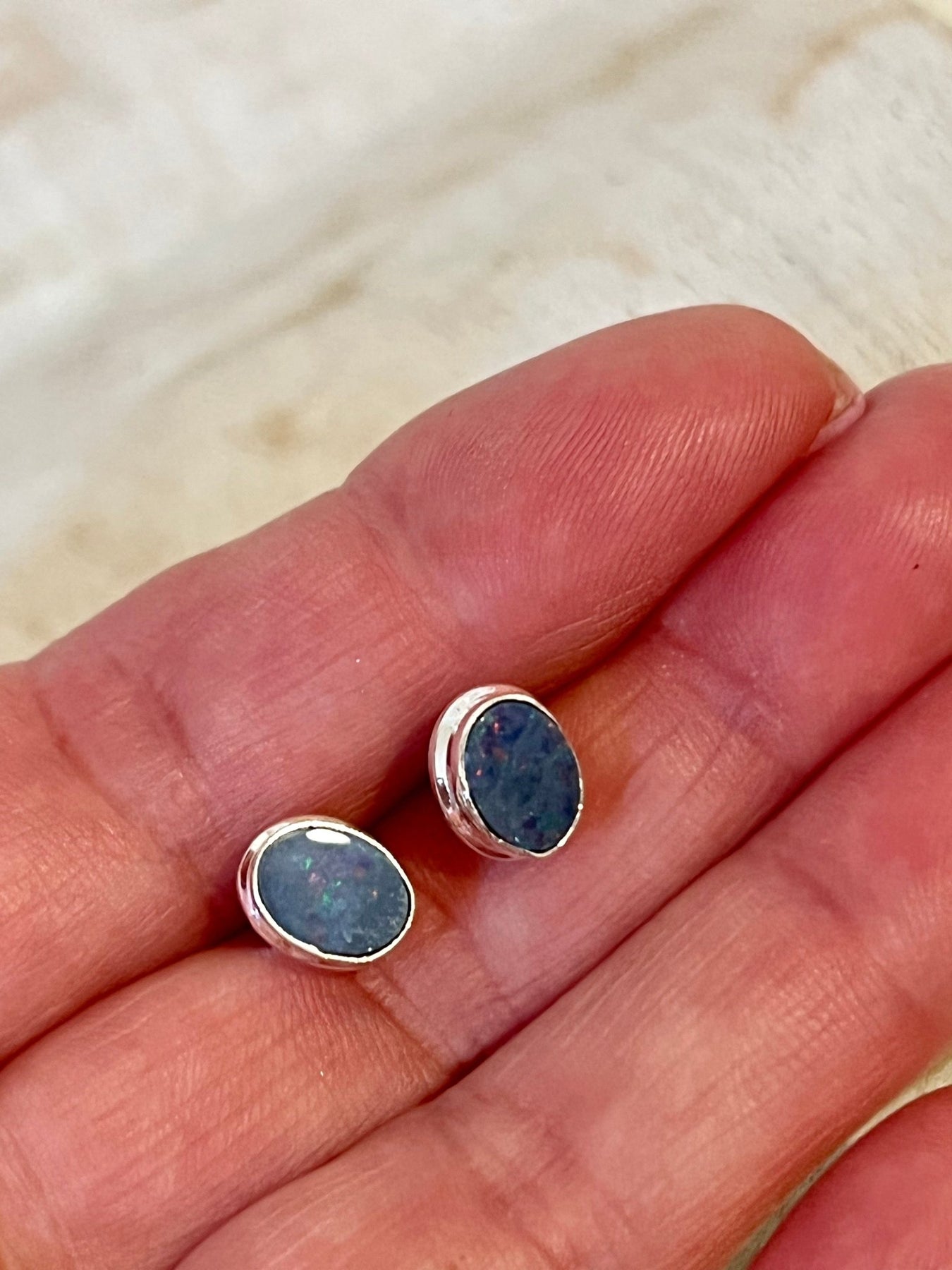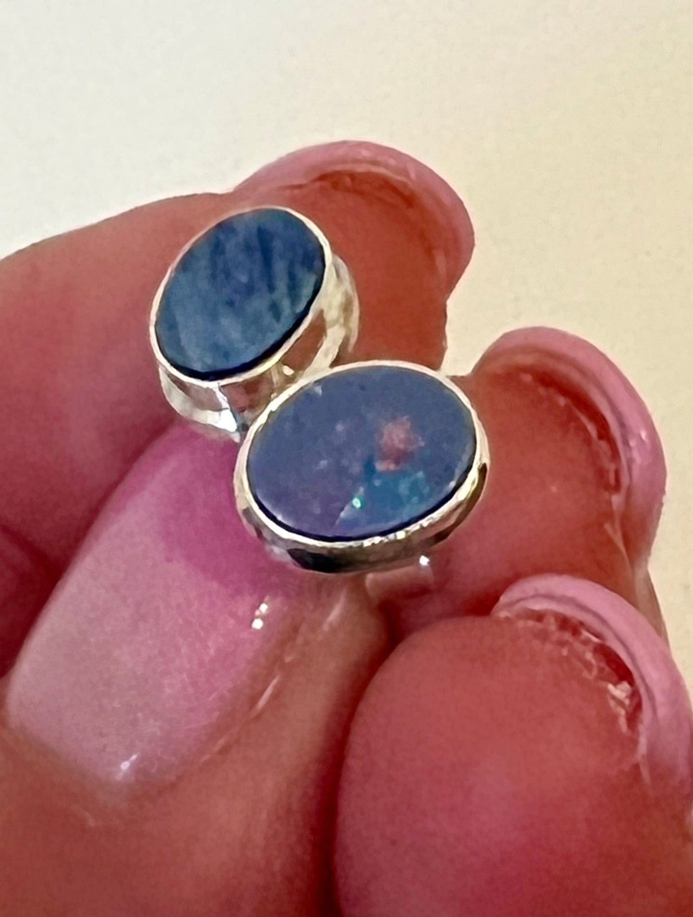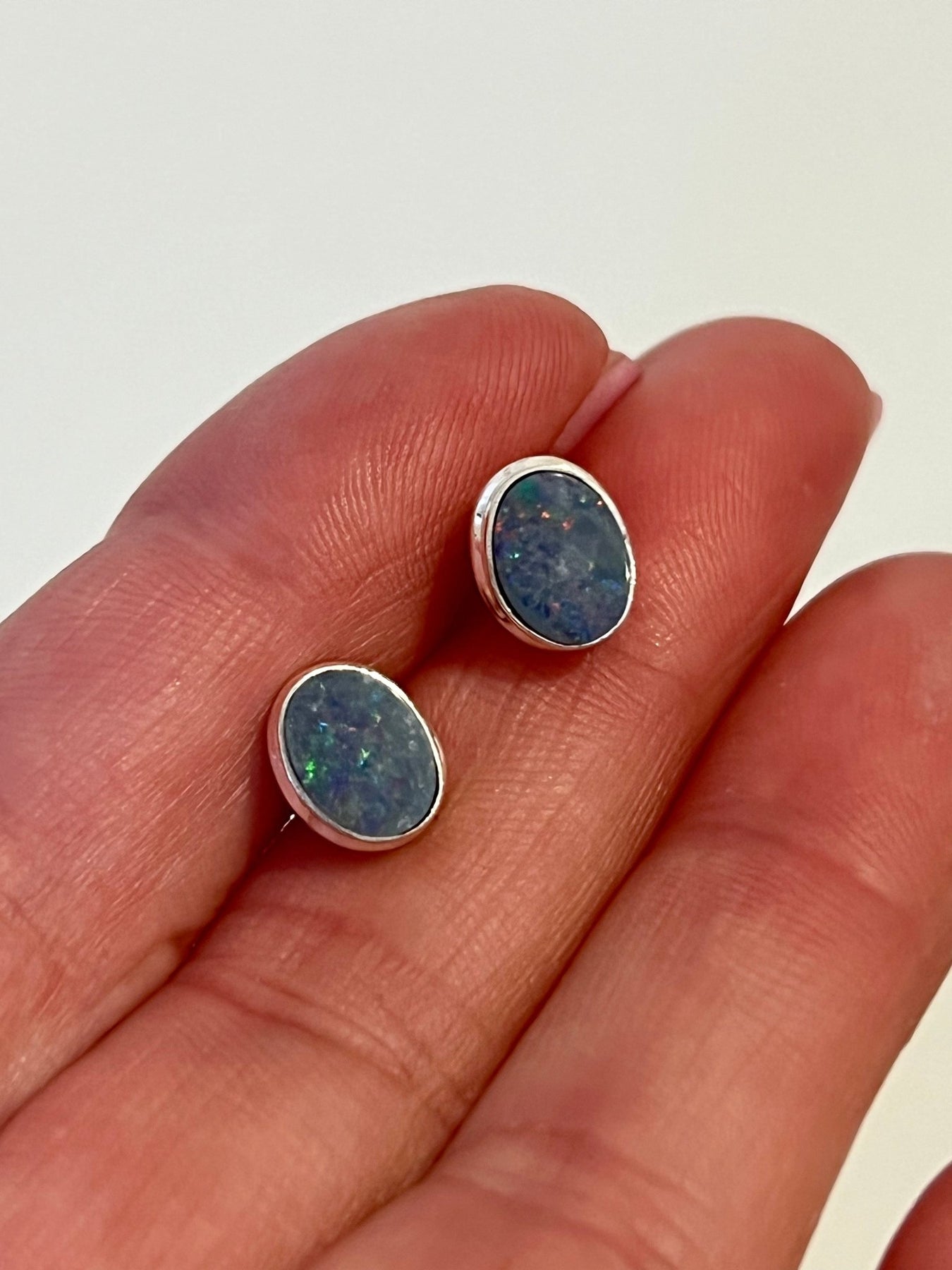 Simple studs with Australian Opals that twinkle with an array of colours in the blue. Each opal is unique and has its own colour play of luminescence shining through.