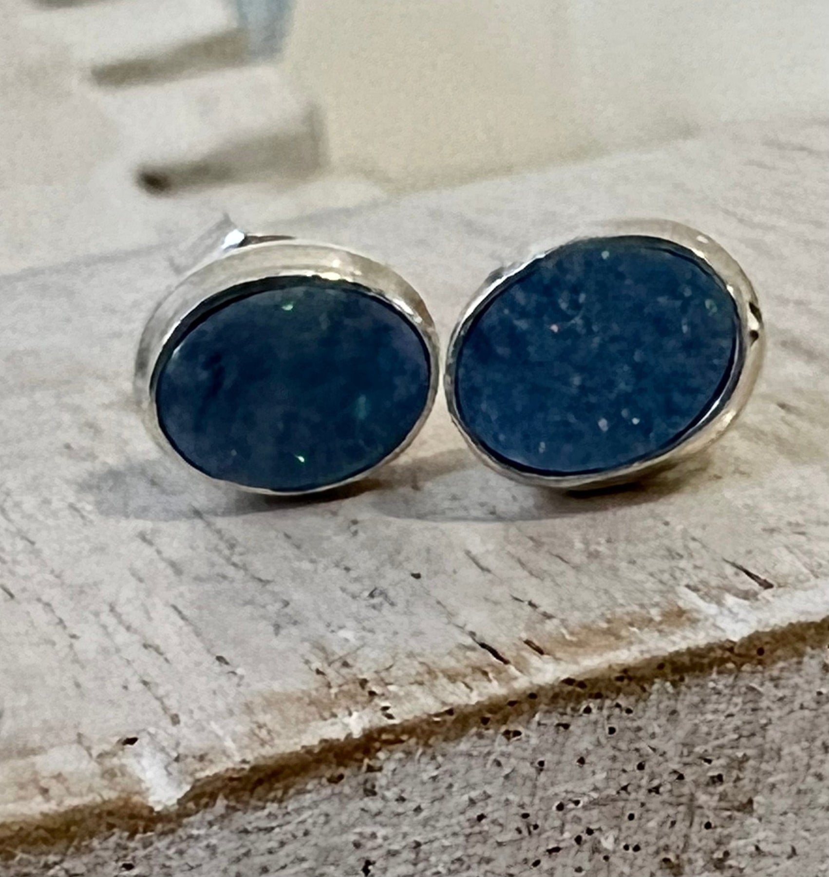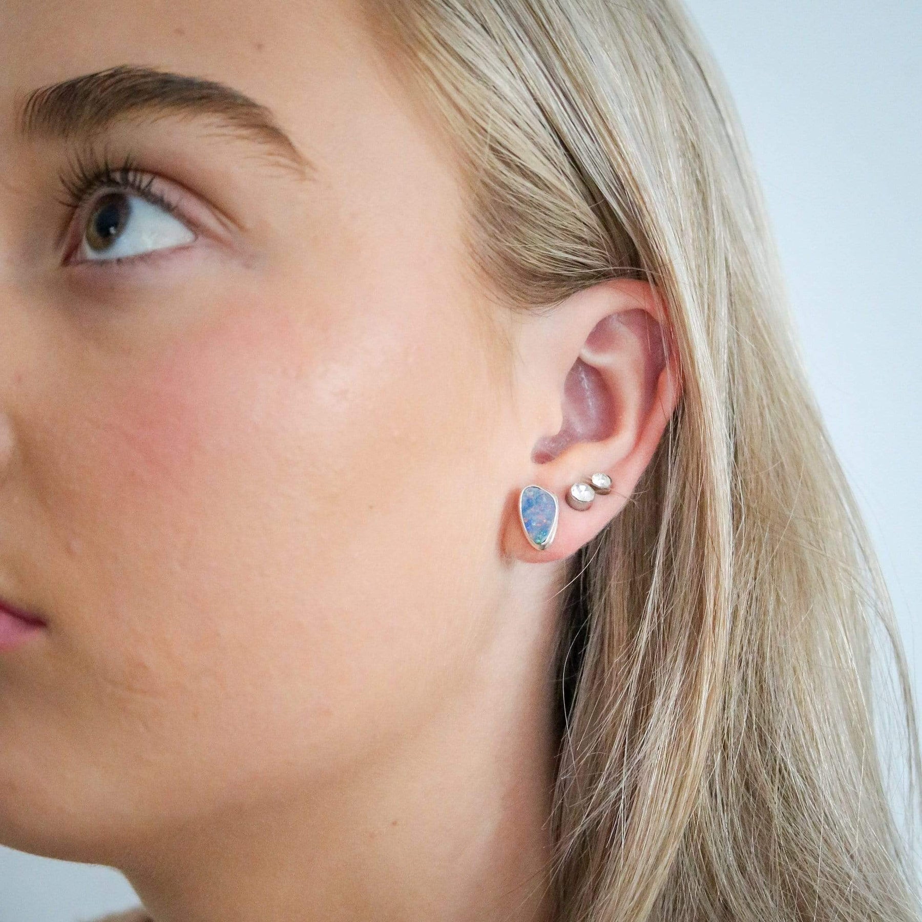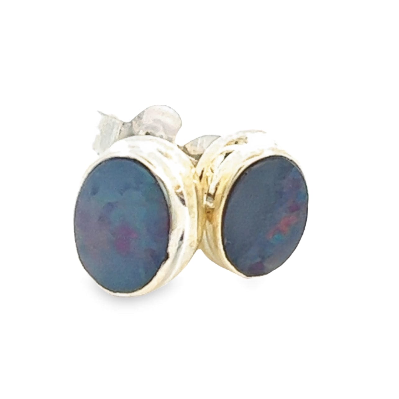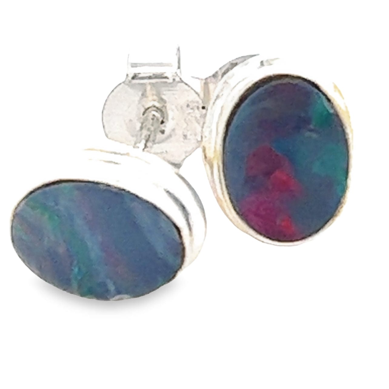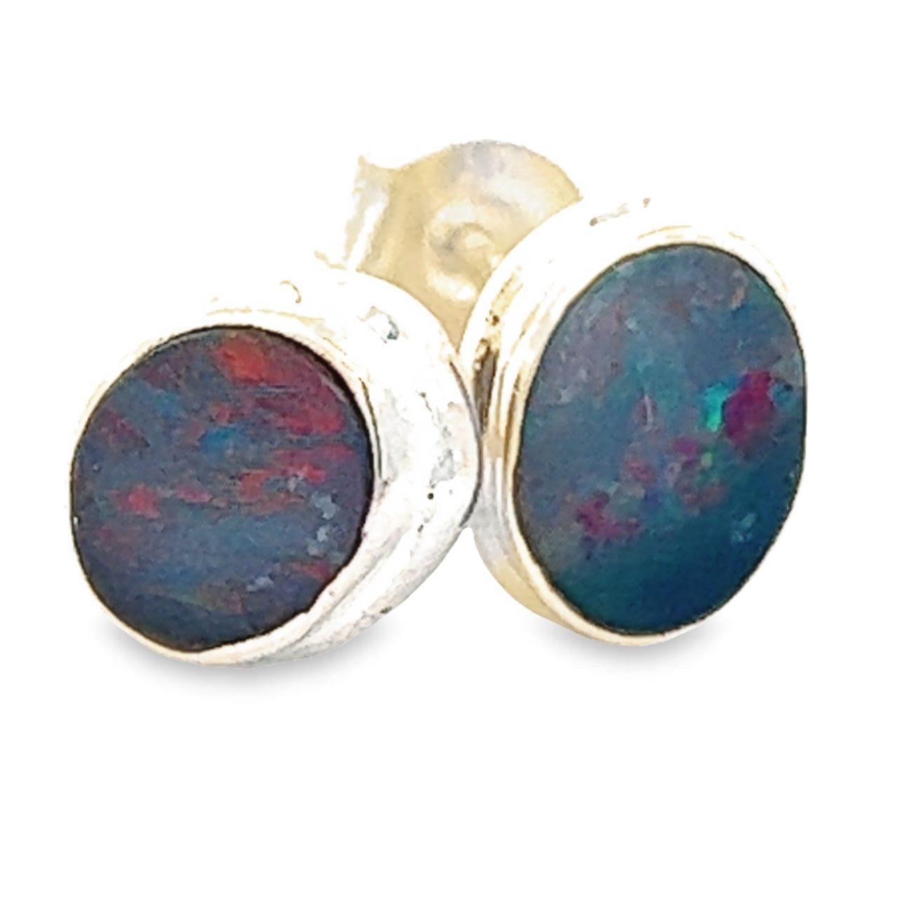 Simple studs with Australian Opals that twinkle with an array of colours in the blue. Each opal is unique and has its own colour play of luminescence shining through.