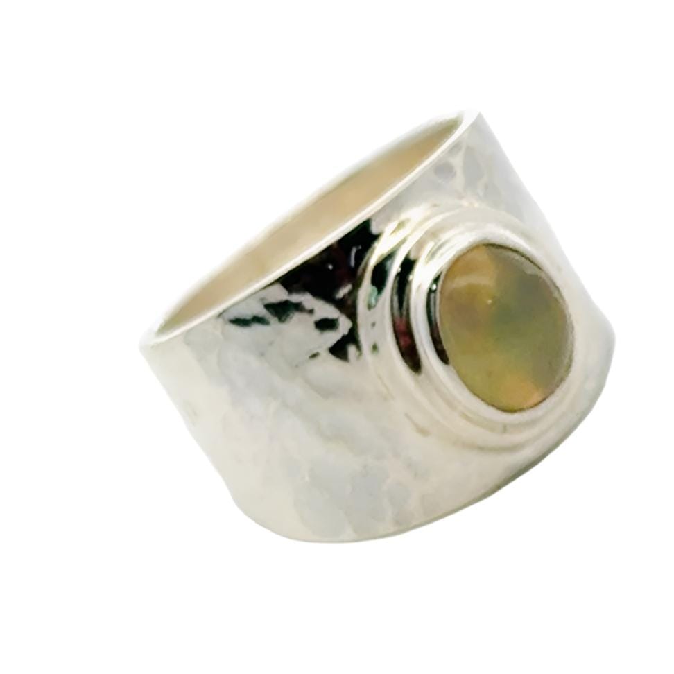 Each ring features a shimmering Ethiopian opal that dances with rainbow colours, displaying nature's light show with every movement. Choose between our signature beaten finish for added texture and character, or a smooth, classic band for timeless elegance.
