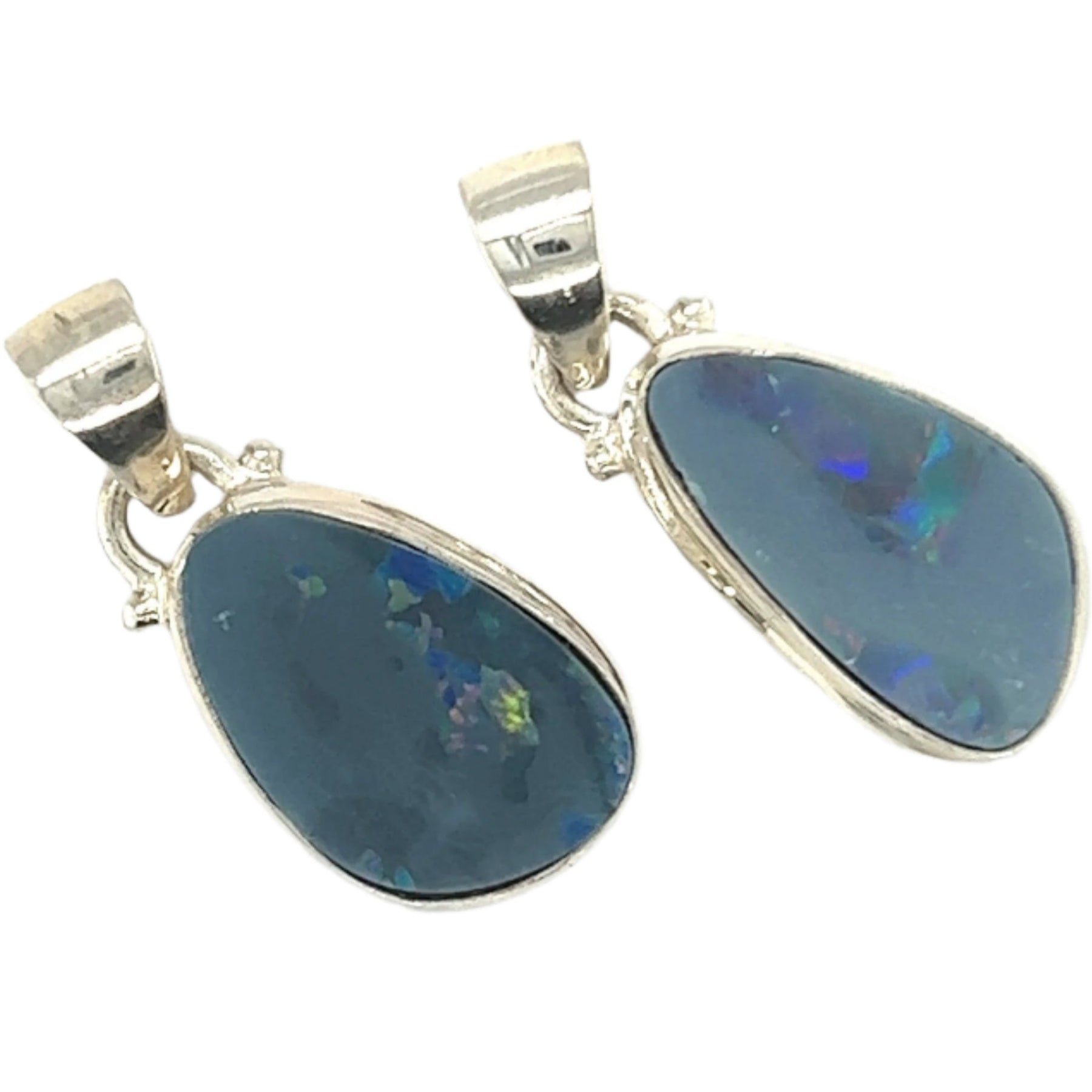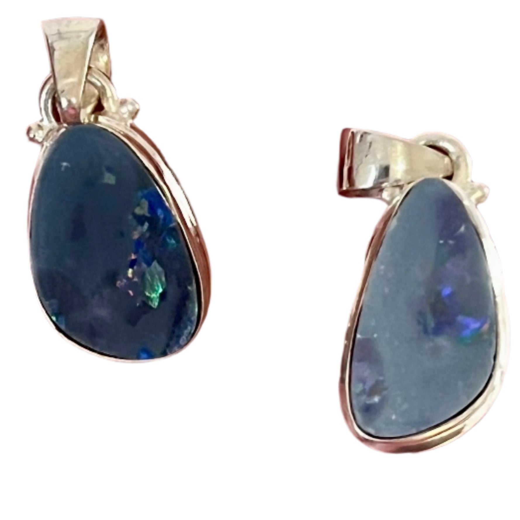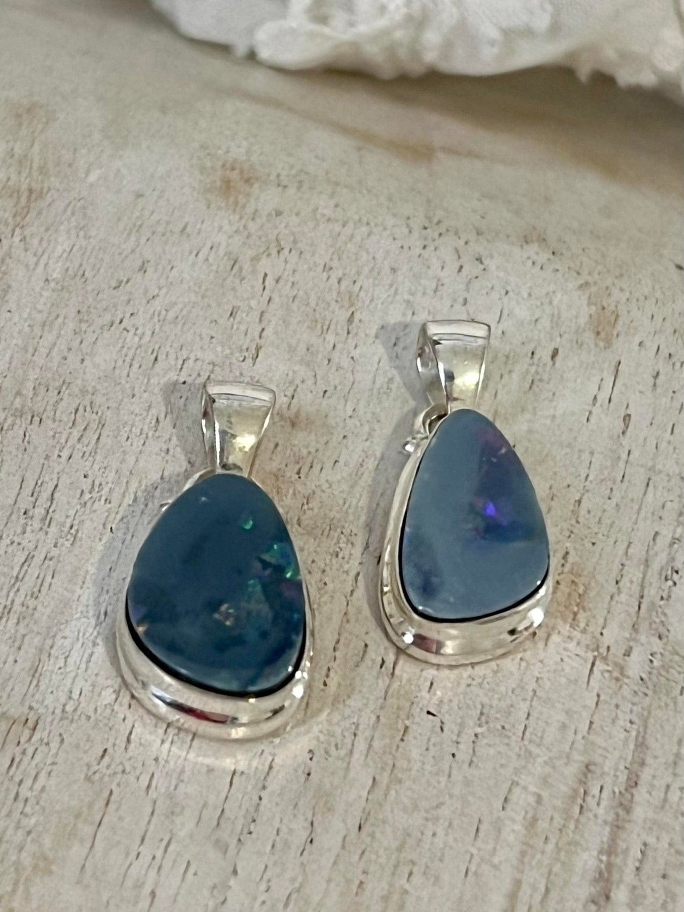 This is an Australian Opal doublet, which is a slice of Opal on a backing stone and is set in Sterling Silver.