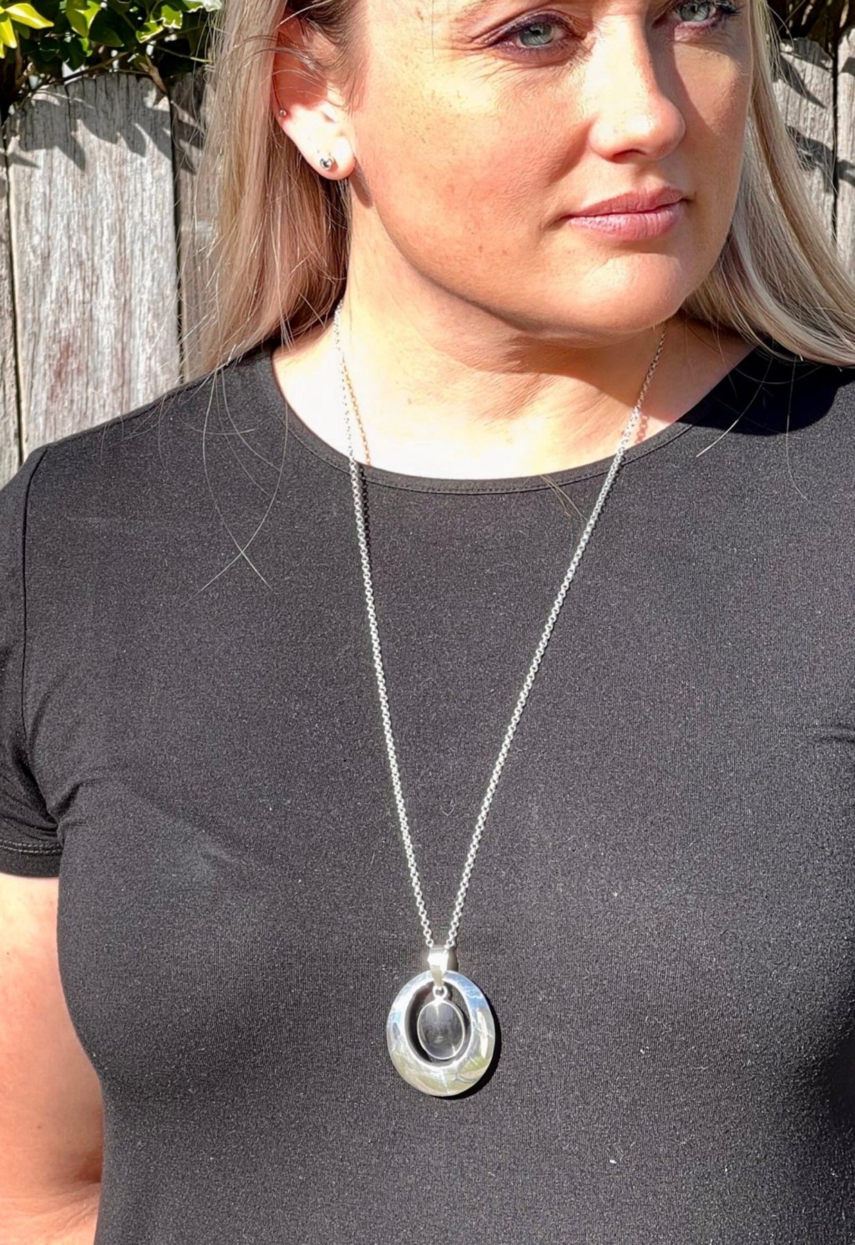 The monochrome palette of black onyx and shiny silver adds a touch of sleek elegance to any ensemble. Embrace the captivating charm of our Onyx Shimmer Grande Pendant, and let its striking beauty become a true reflection of your individuality and impeccable taste.
