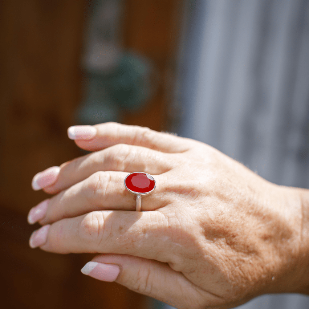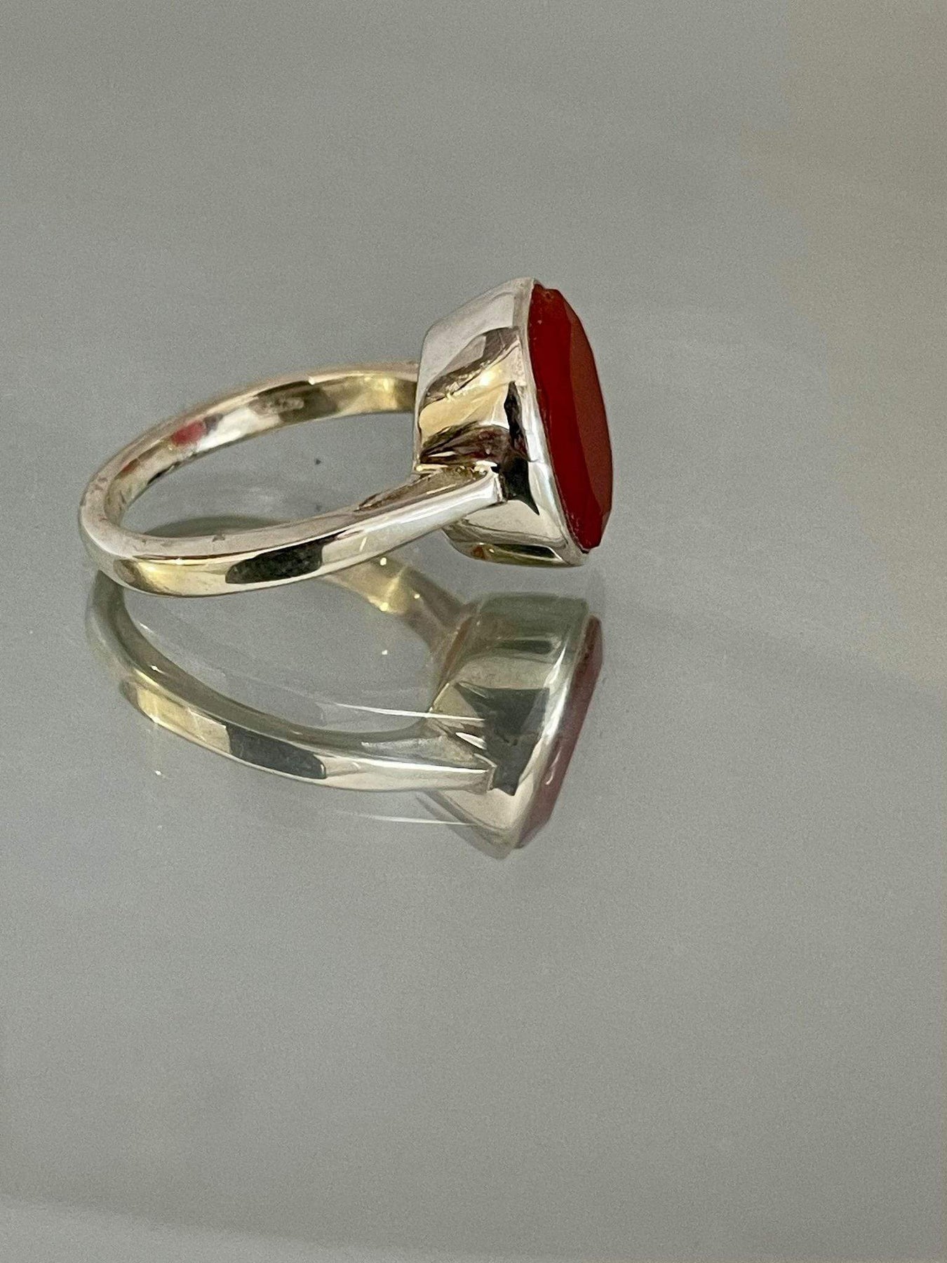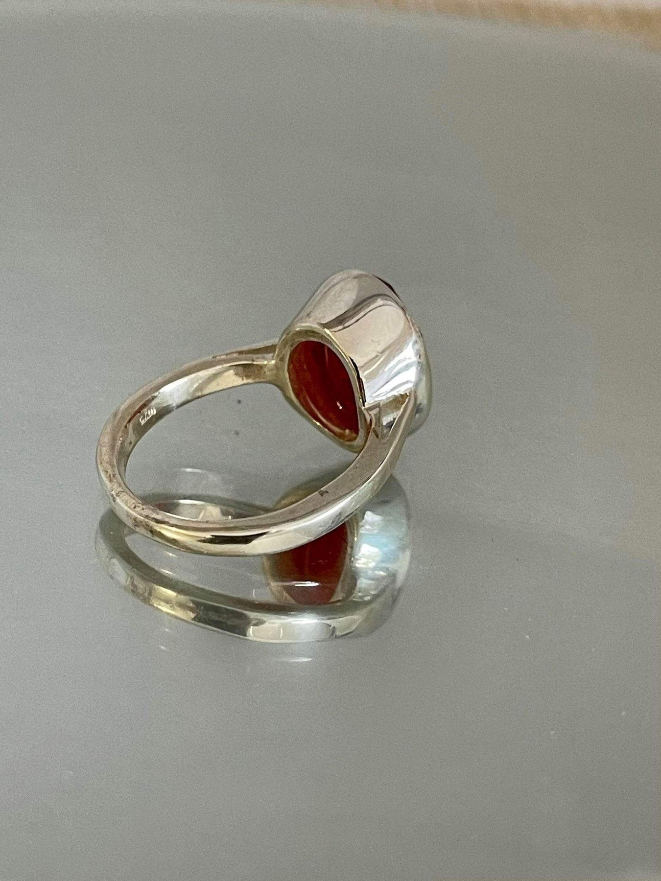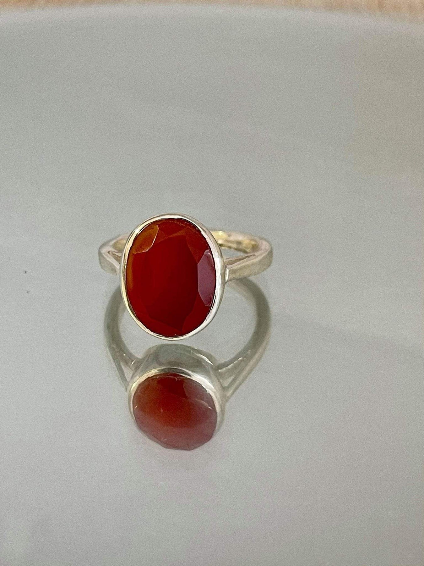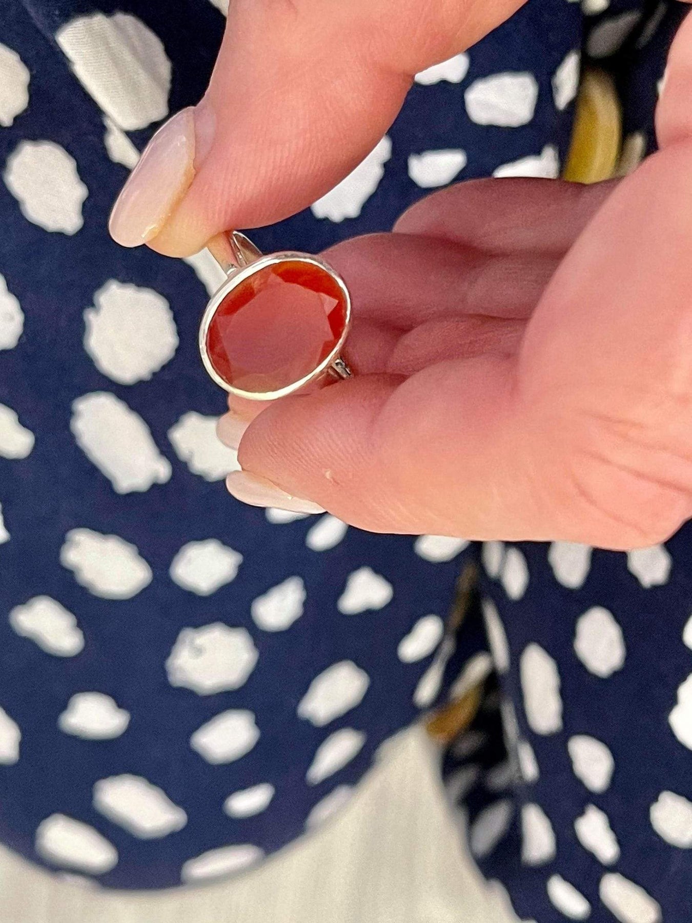 Evoking feelings of an earthy, burnt orange landscape, this carnelian ring has an autumnal vibe and comes set in a sterling silver, bezel setting.