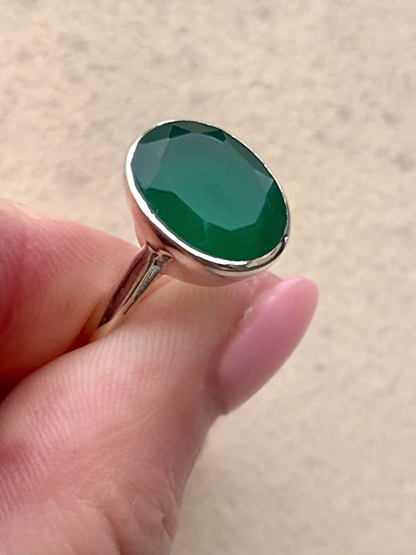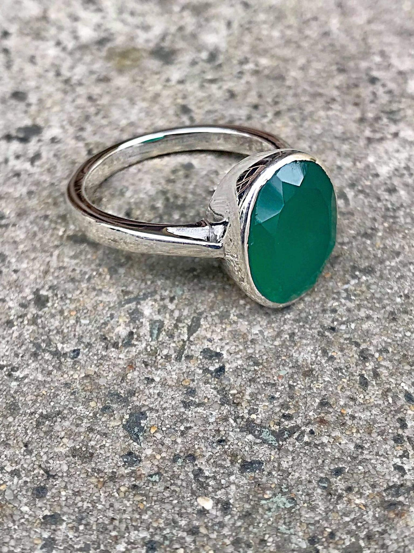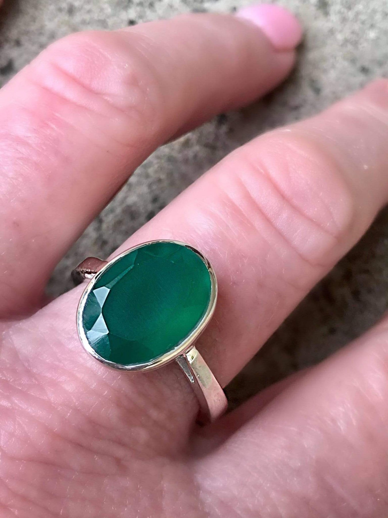 I recently received this ring as a gift, and I couldn't be more thrilled. The sleek design and green stone make it a standout piece. The quality is impeccable, and I appreciate the attention to detail in the design. It's become a daily wear for me. It arrived beautifully gift wrapped and with a hand written gift card.