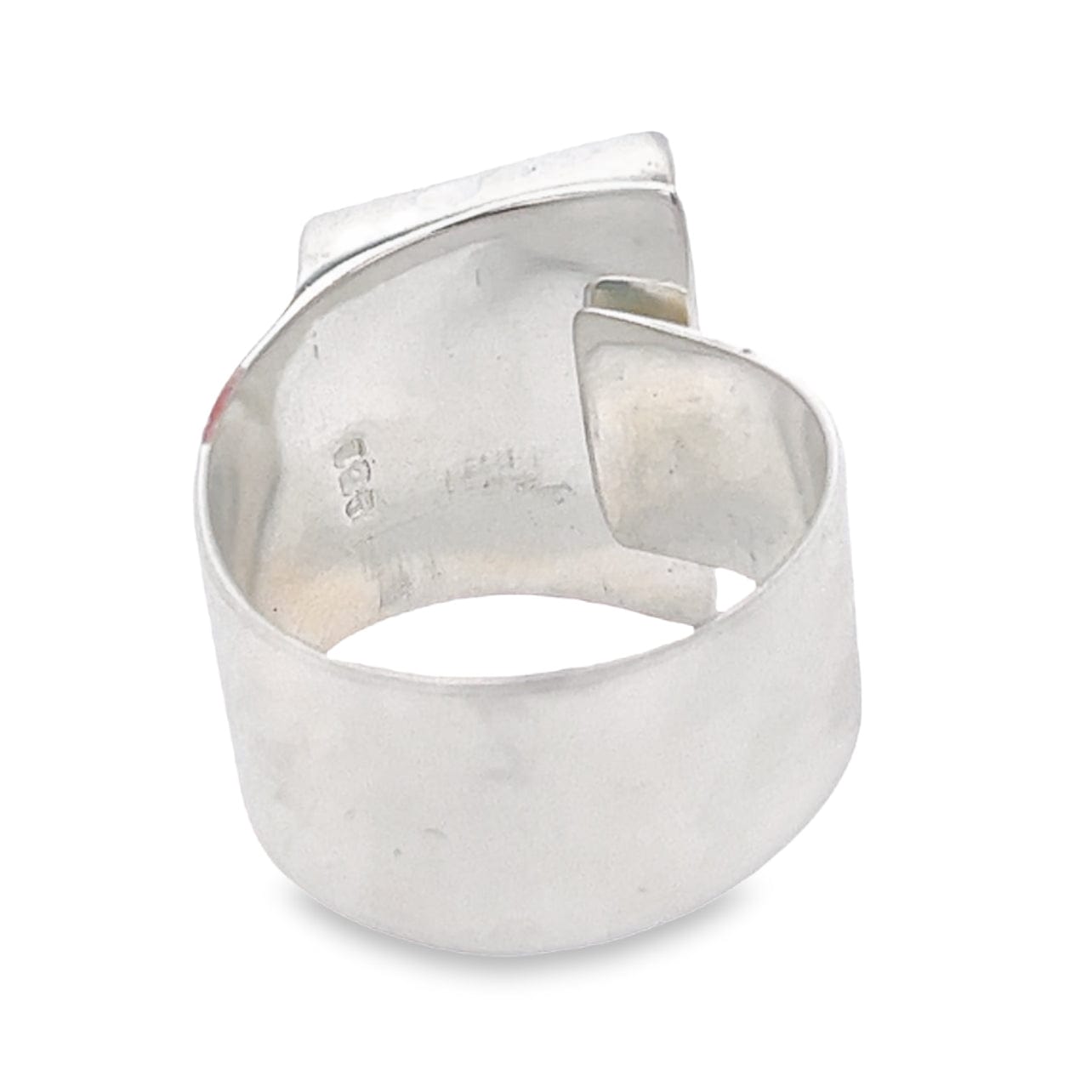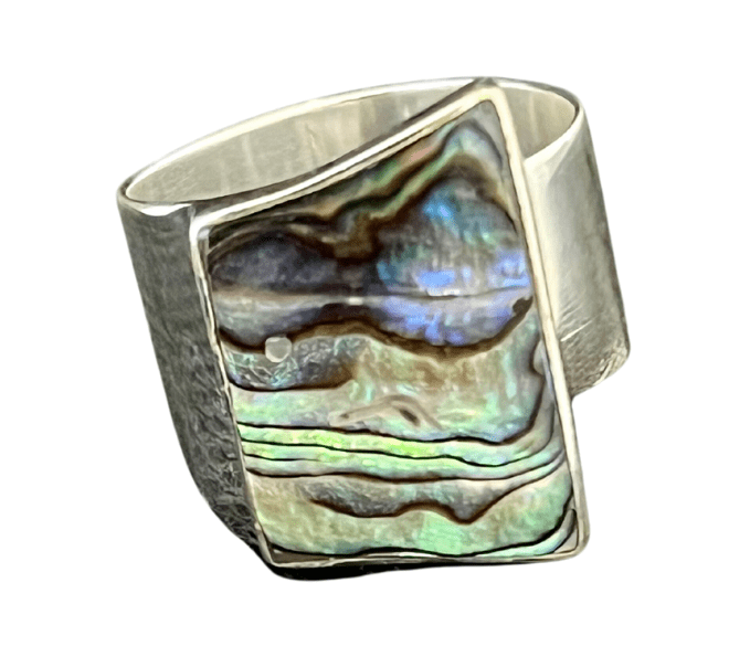 Handcrafted with natural Paua Shell and sterling silver, this ring is a true work of art. The wide silver band perfectly complements the iridescent Paua Shell, resulting in a unique and striking ring. The adjustable size ensures a comfortable fit for a range of finger sizes.