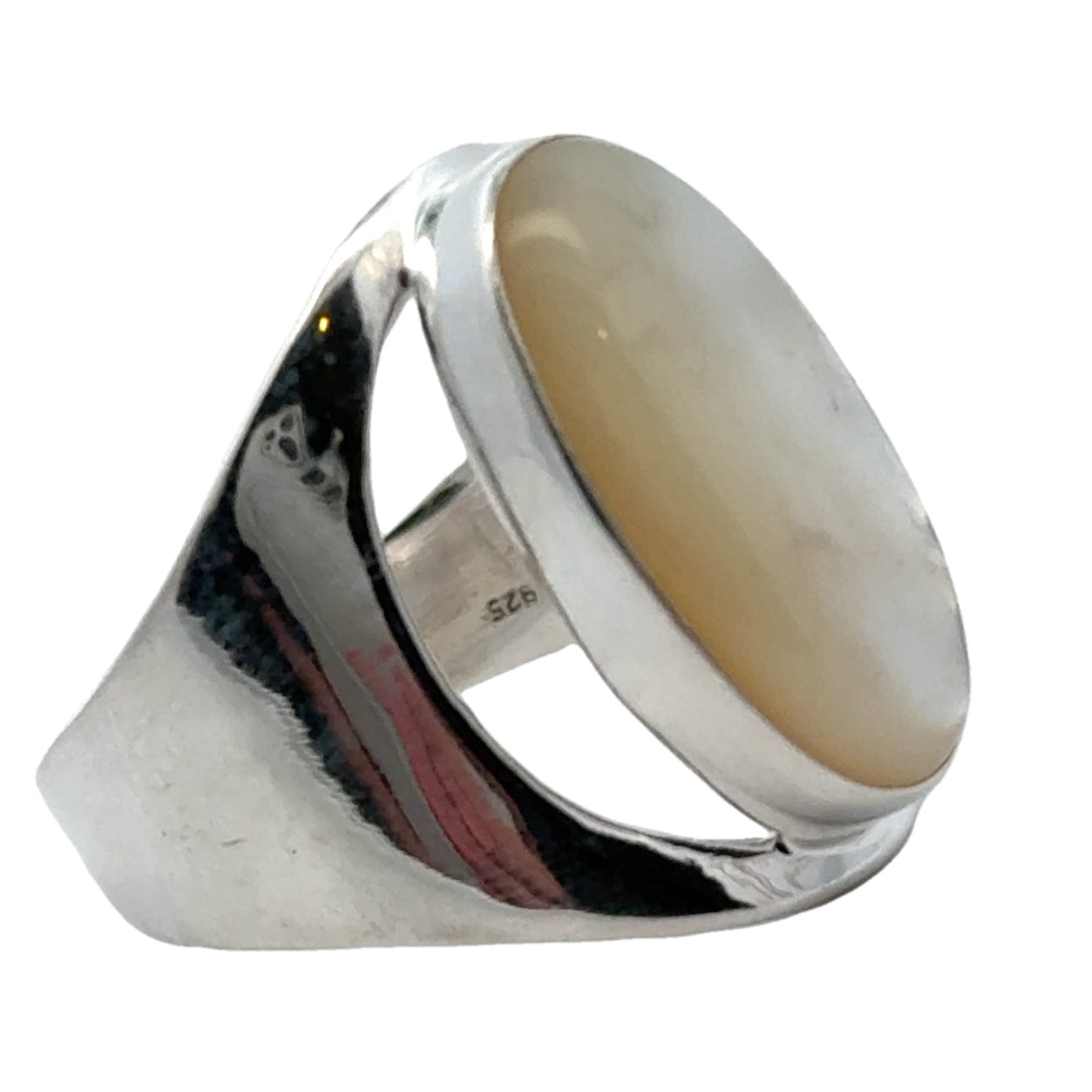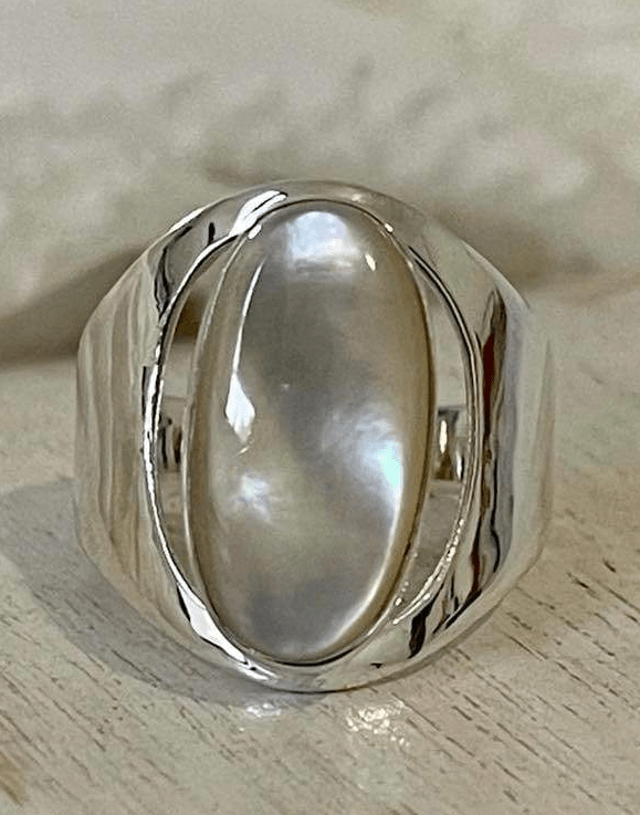 This statement ring styled with clean flowing lines with a piece of Mother of Pearl in Sterling Silver ring is the perfect mix between boho and modern.