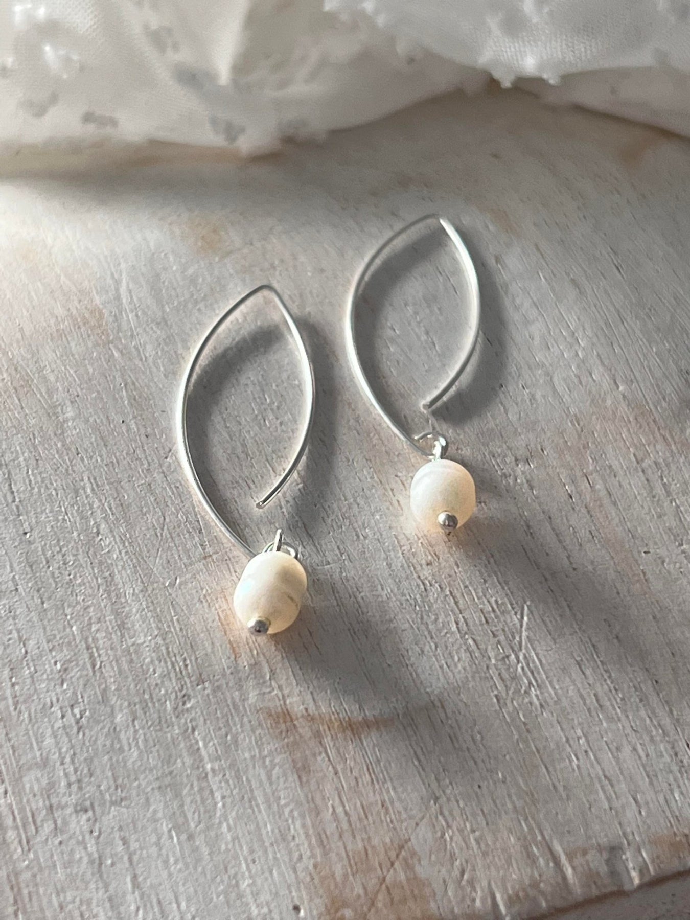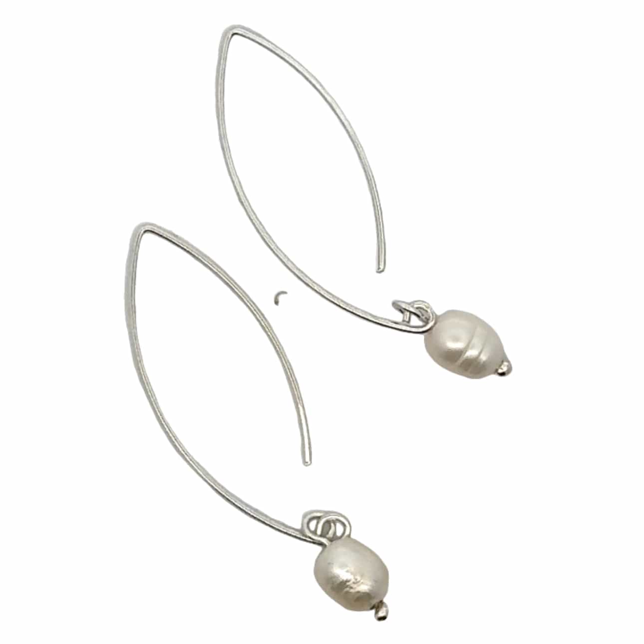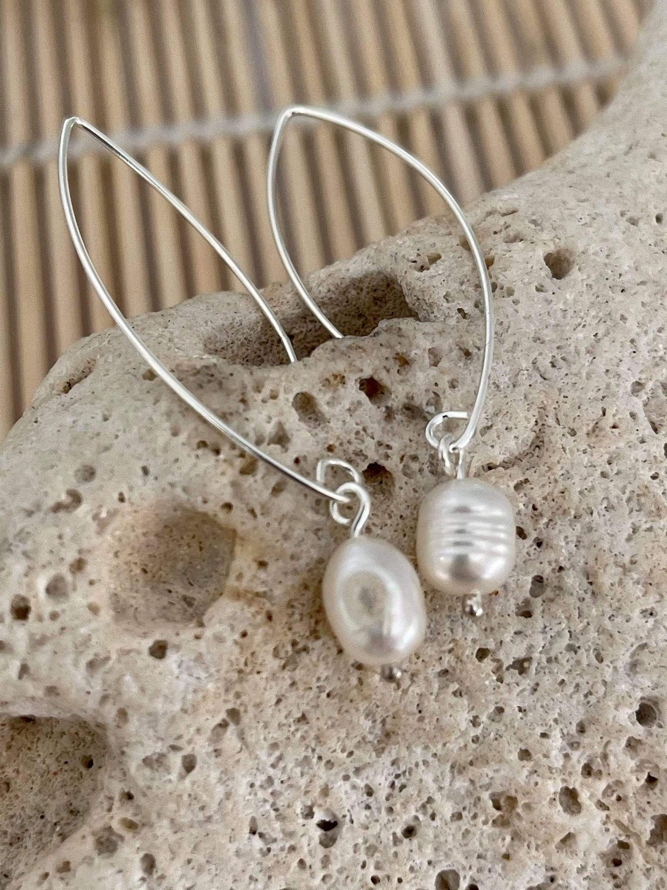 Natural pearls hanging from a sterling silver elongated hoop for a beautiful and simple style.