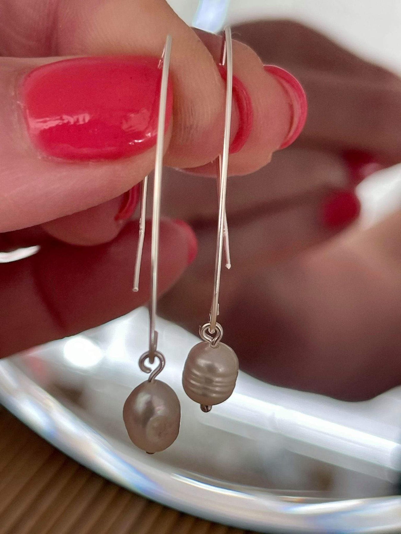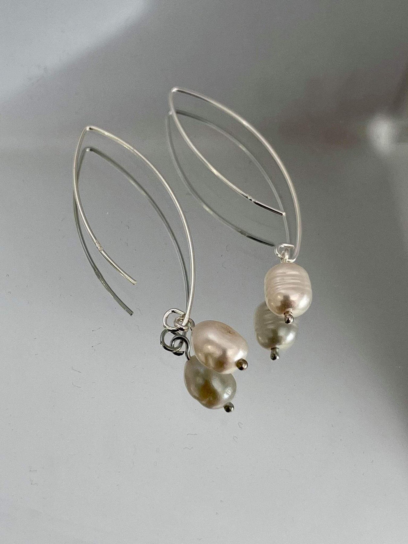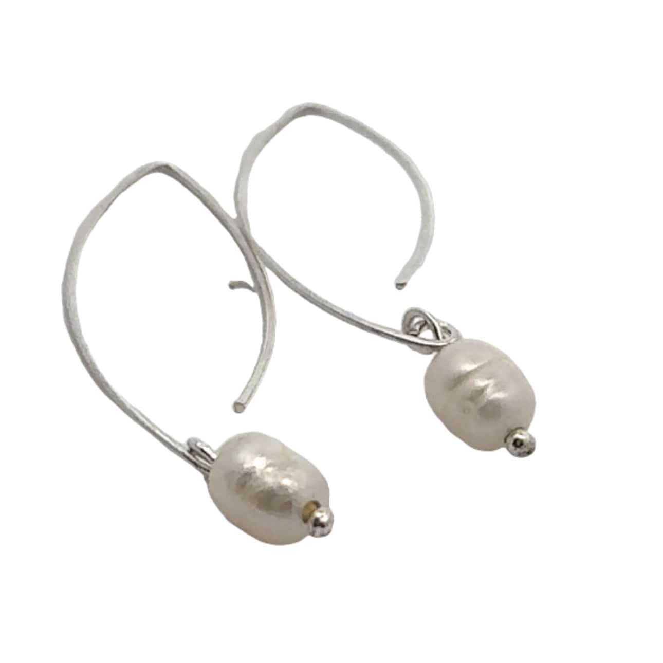 Natural pearls hanging from a sterling silver elongated hoop for a beautiful and simple style.
