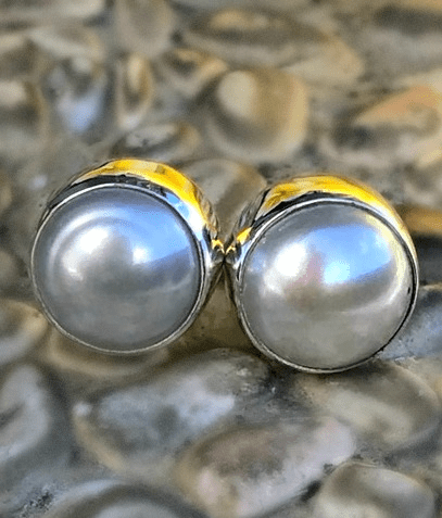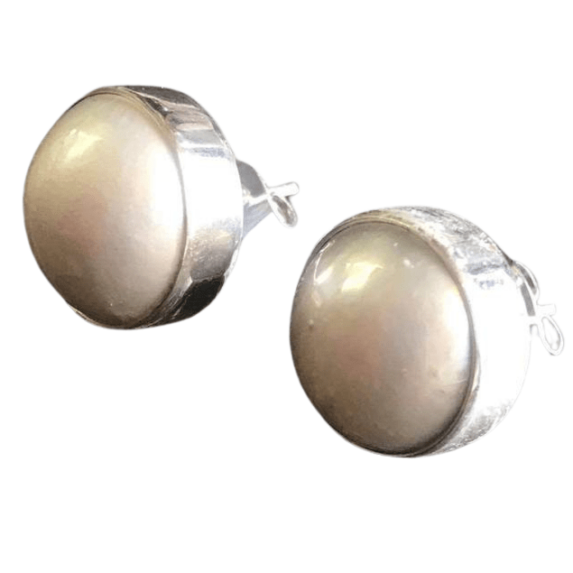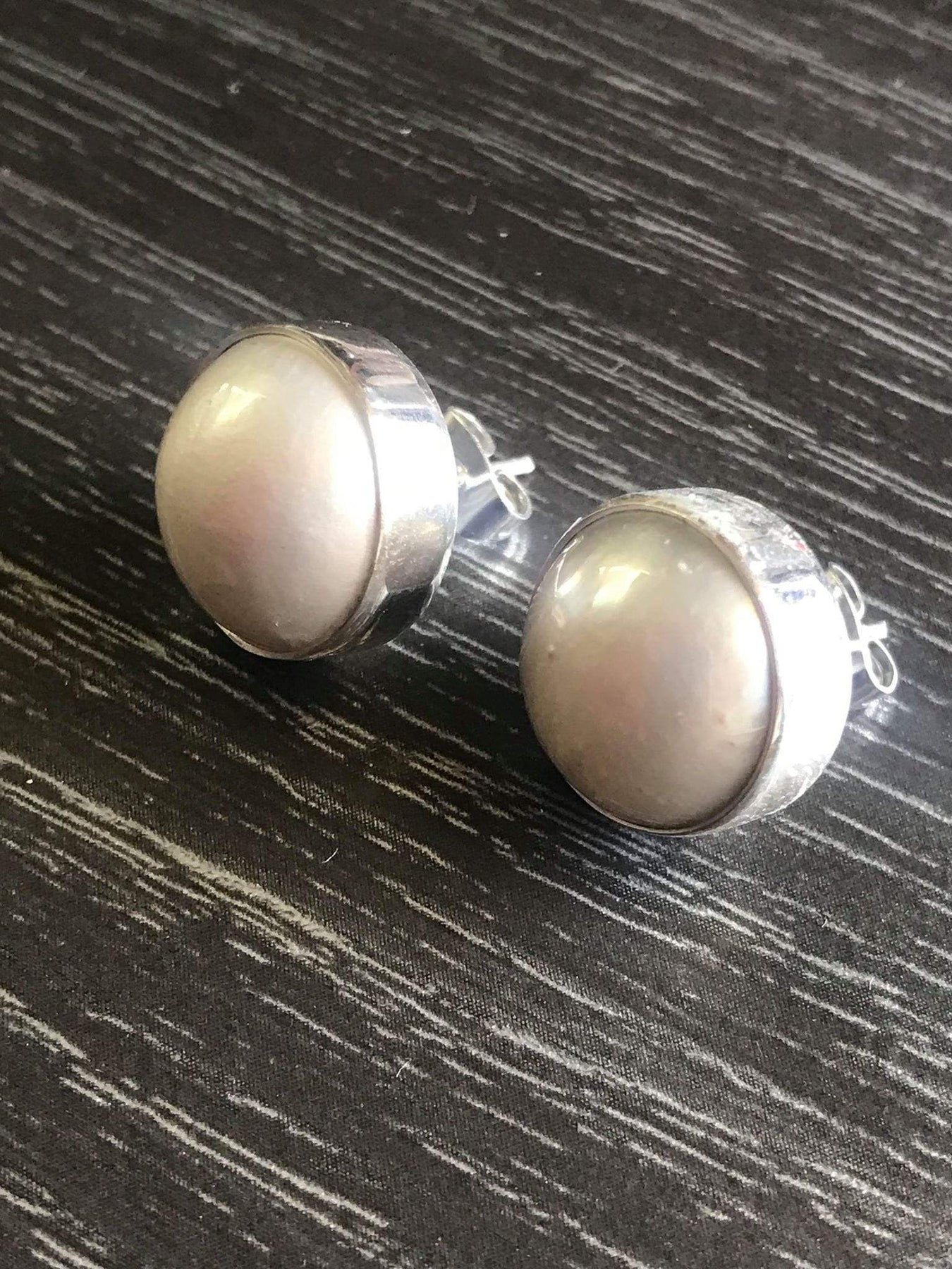 They are a larger size at approximately 16 MM diameter than most pearl studs and set in a shiny Sterling Silver Bezel setting.