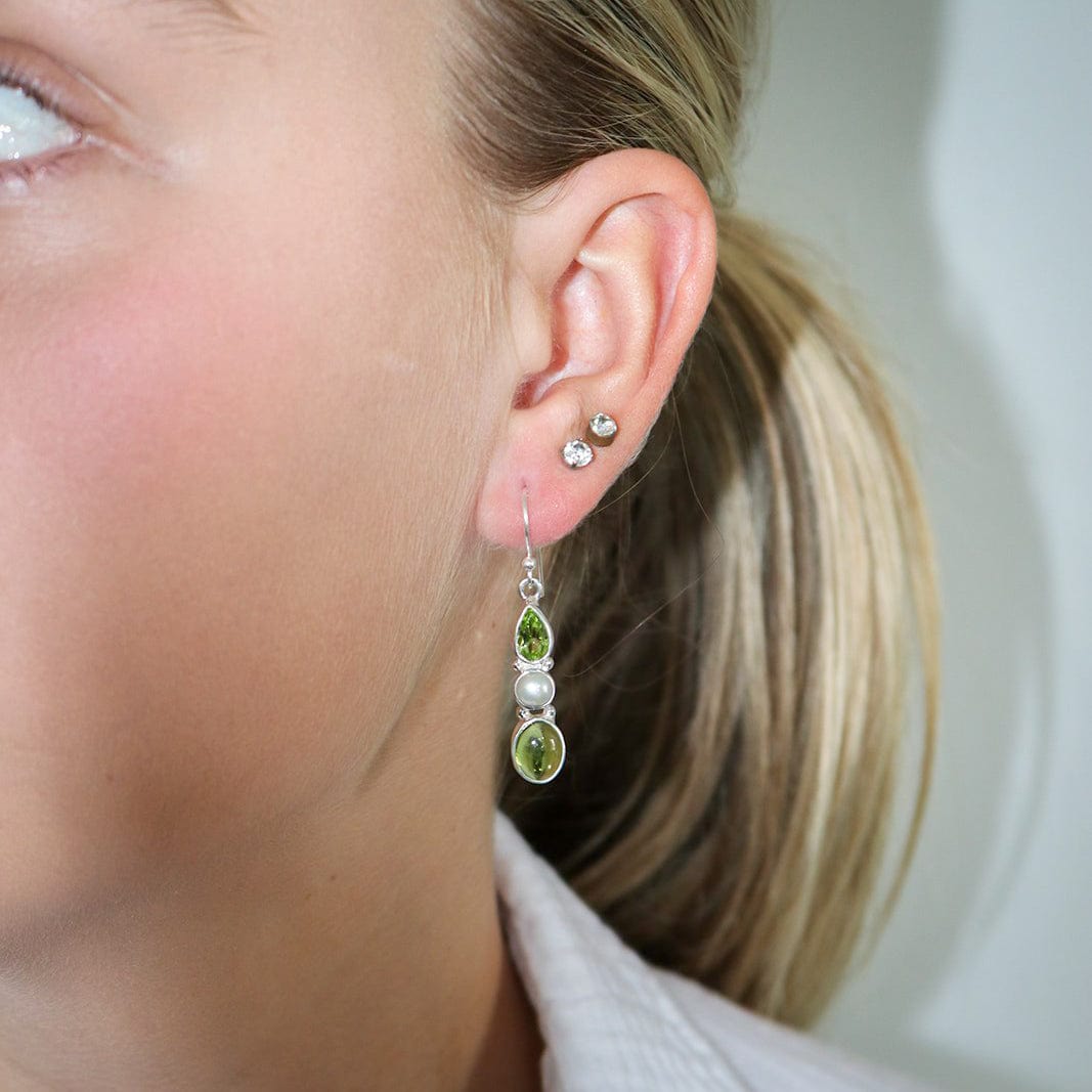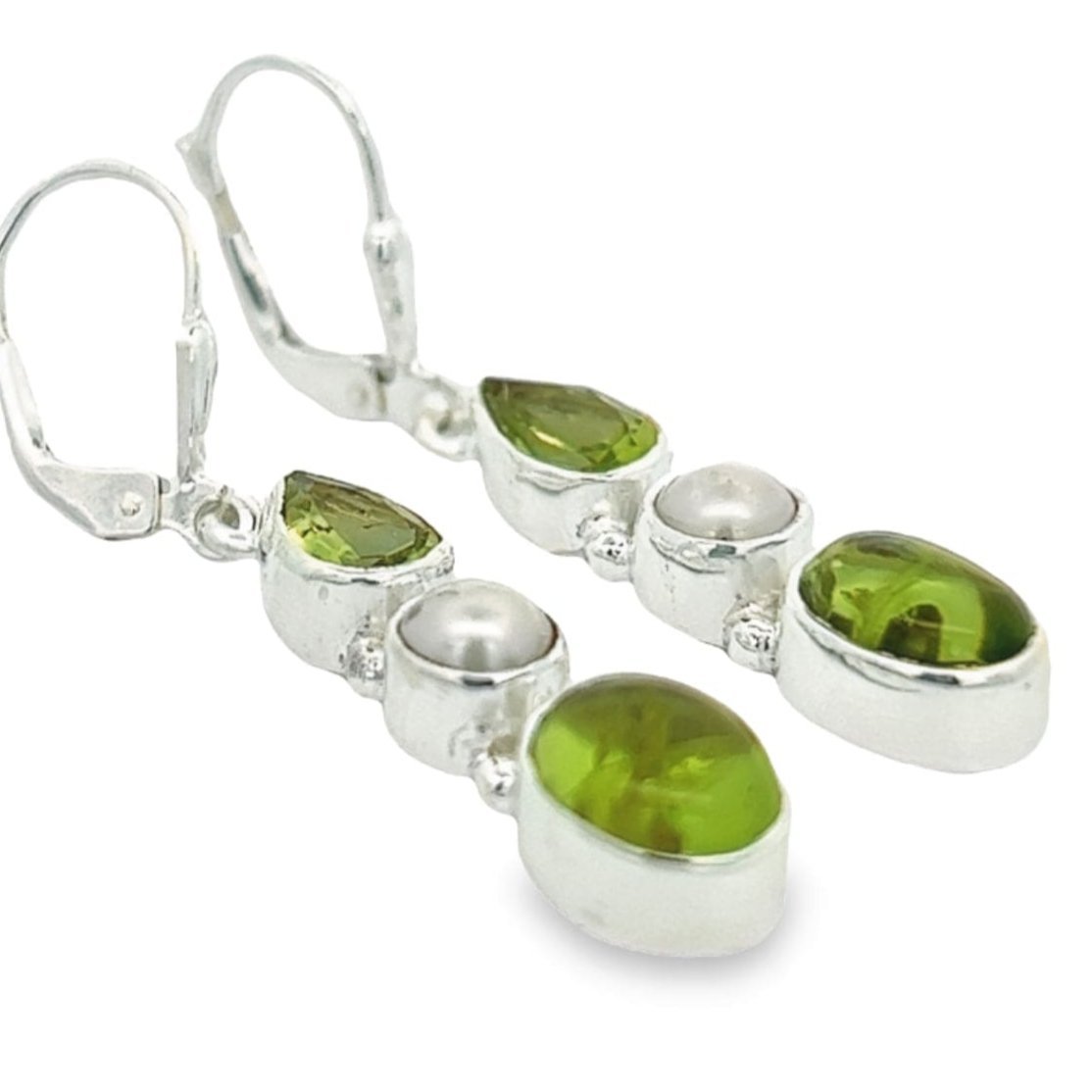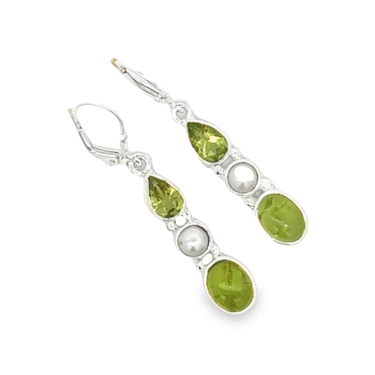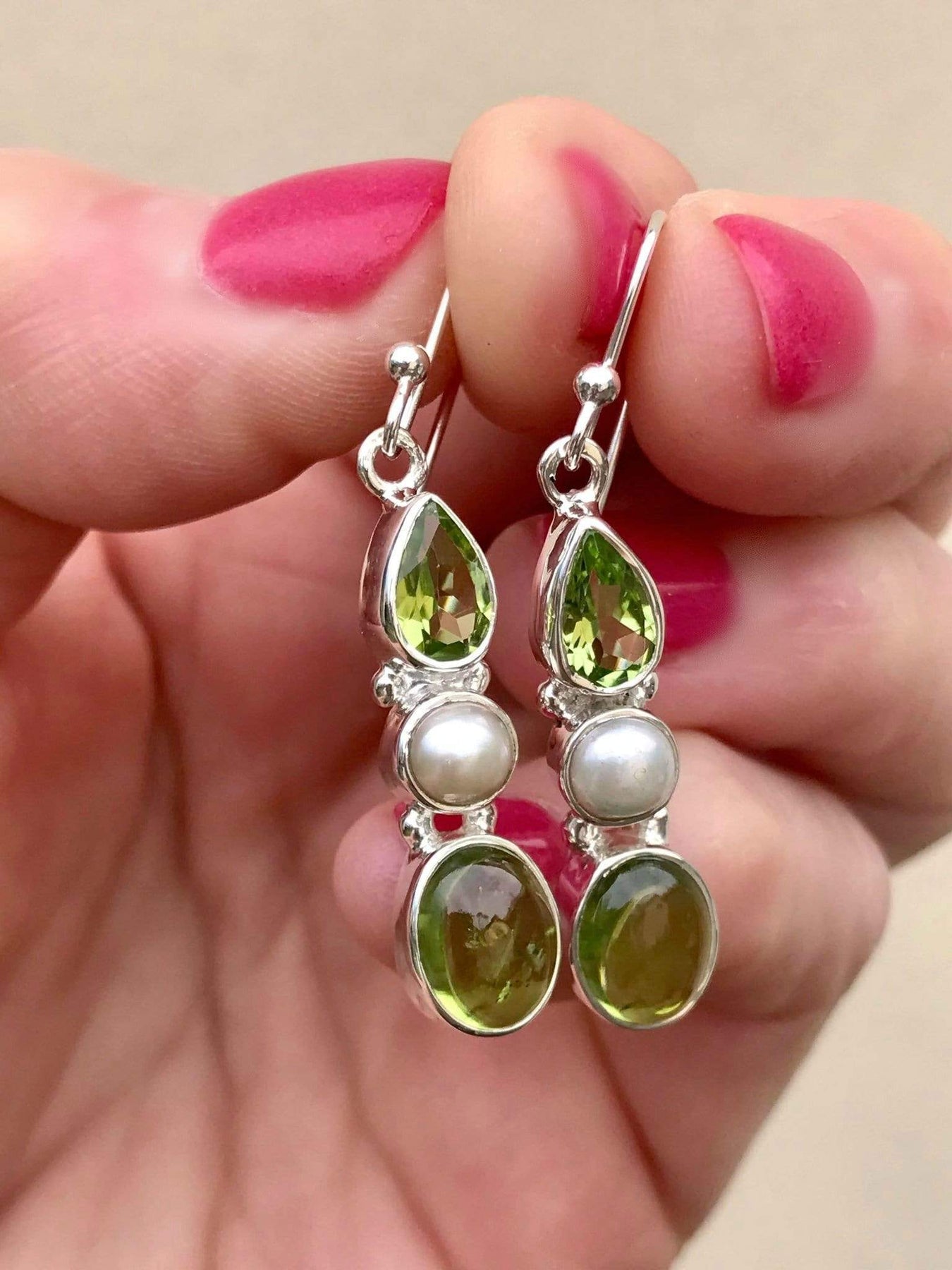 These gorgeous peridot drop earrings combine tear-shaped peridot, facet cut for sparkle with smooth peridot cabochons that gleam with green and a lustrous white pearl between and then handcrafted with love in sterling silver.