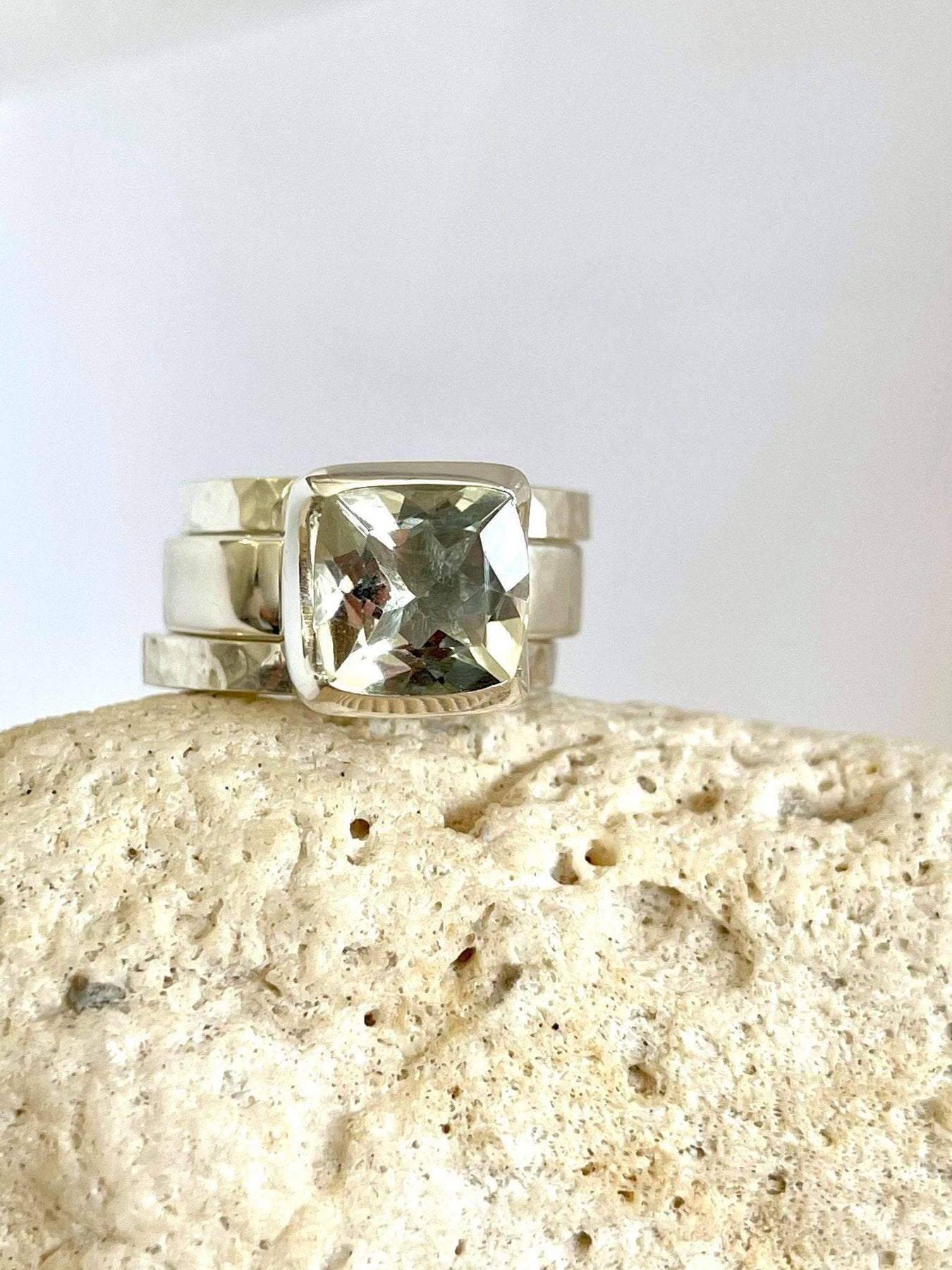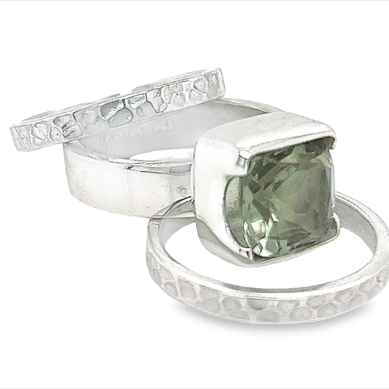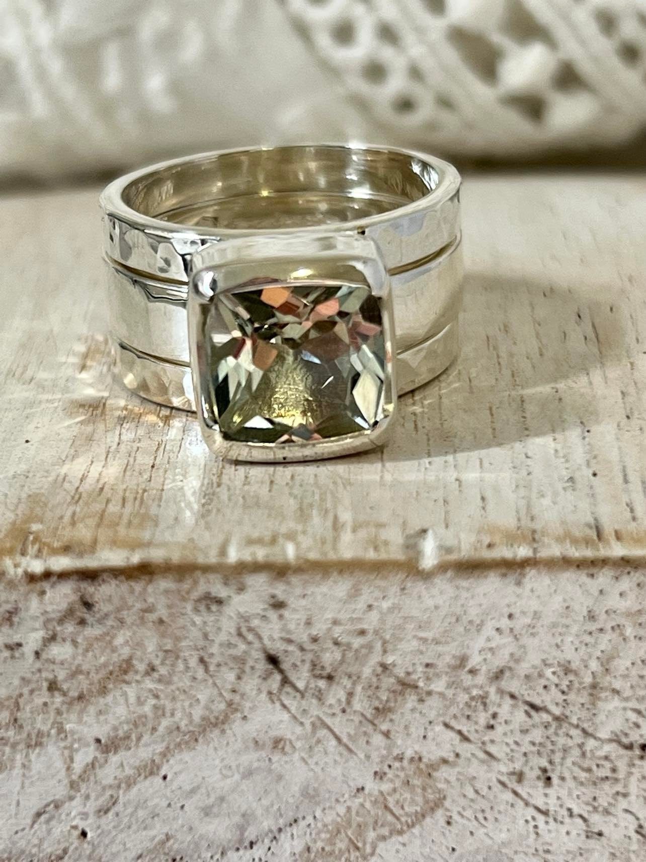The square-cut gemstone ring with a 10 x 10 MM prasiolite is stunningly beautiful and offsets the two sterling silver beaten stacker bands perfectly. They can be worn as a trilogy set or on their own - the choice is yours.  These are absolute perfection.